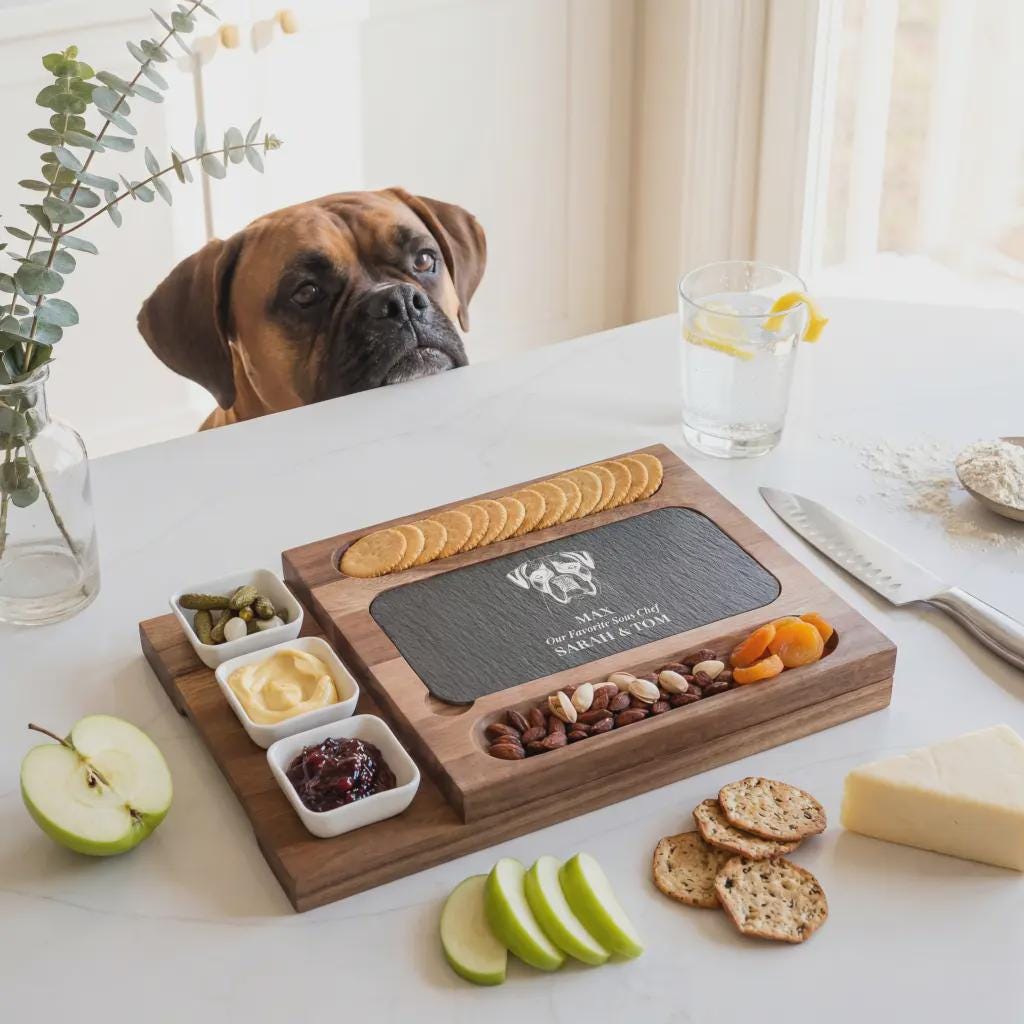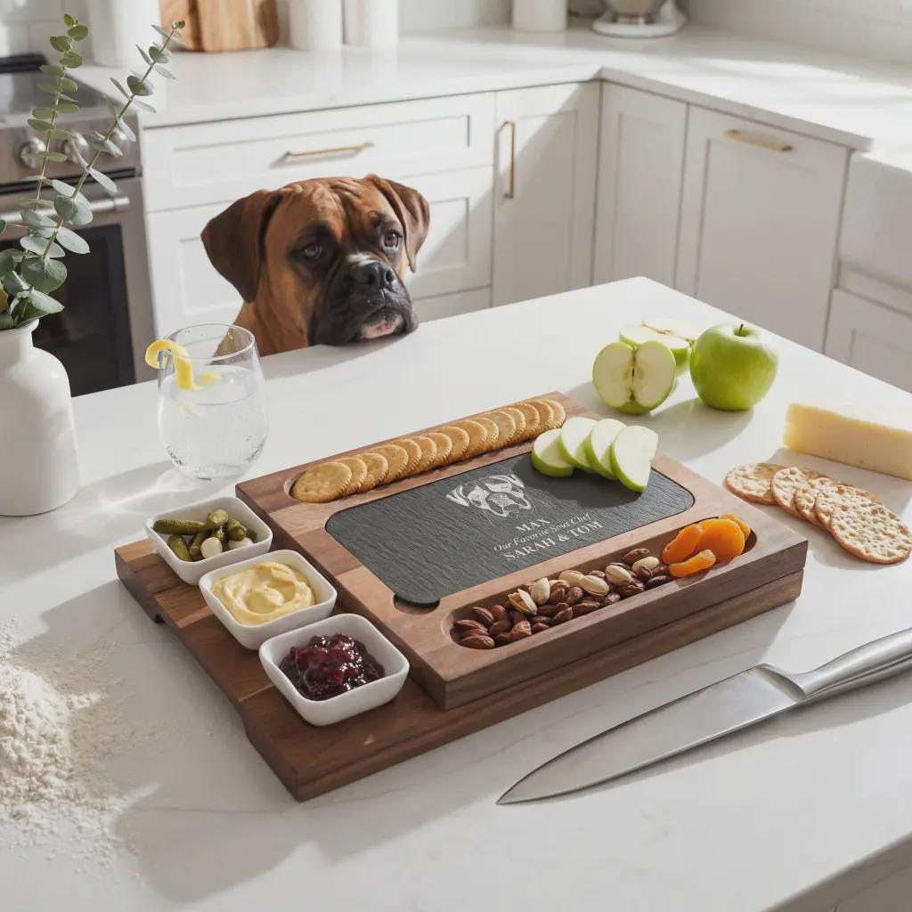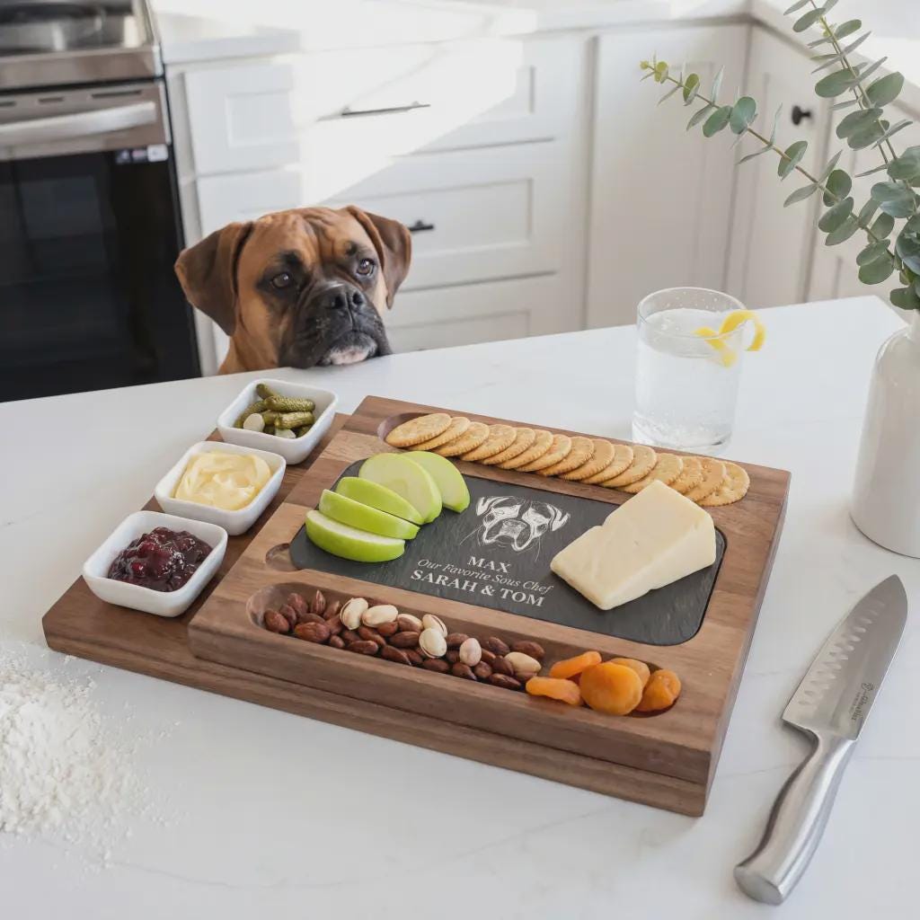 Make your furry friend the star of your next gathering with this luxury personalized charcuterie set. Simply send us a high-resolution picture of your pet, and we will expertly engrave their likeness onto the slate centerpiece, capturing every unique detail of your "Favorite Sous Chef." This premium serving system includes three ceramic accompaniment bowls and an integrated drawer for professional cheese tools, making it a sentimental housewarming keepsake or a one-of-a-kind anniversary gift for pet owners who appreciate artisanal style and functional home decor.