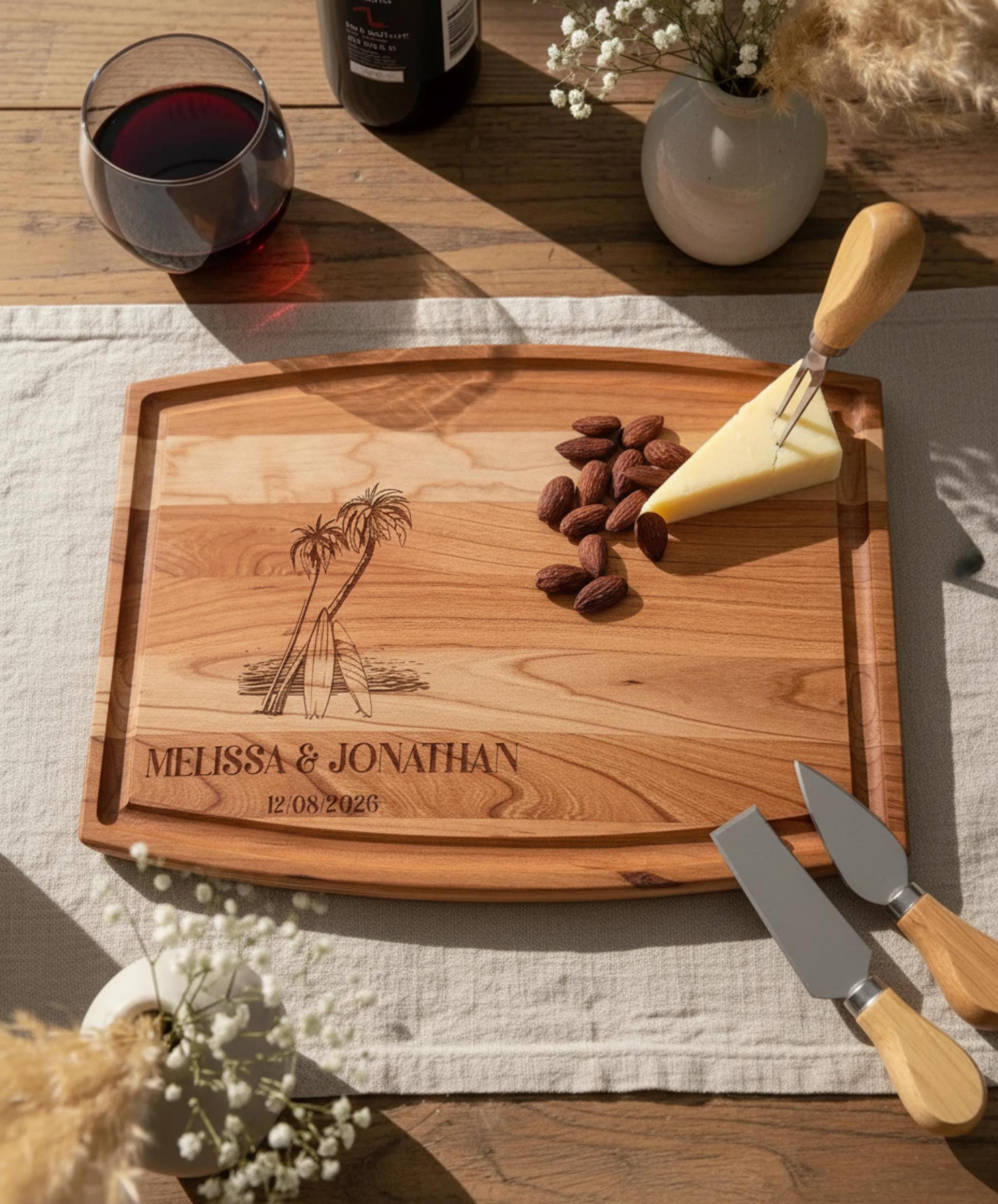 Personalized Surfer Couple Cutting Board: Customized Charcuterie Board, Beach Decor, Palm Trees, Wedding Gift