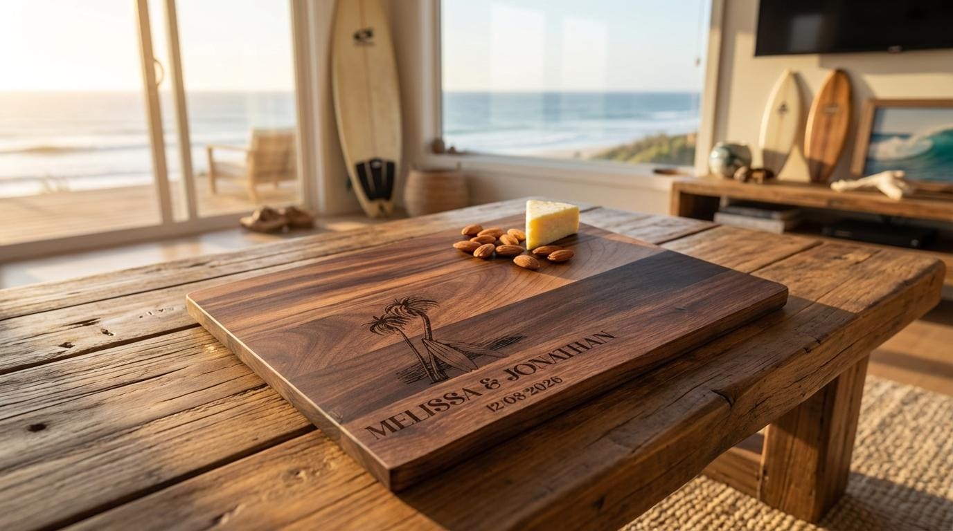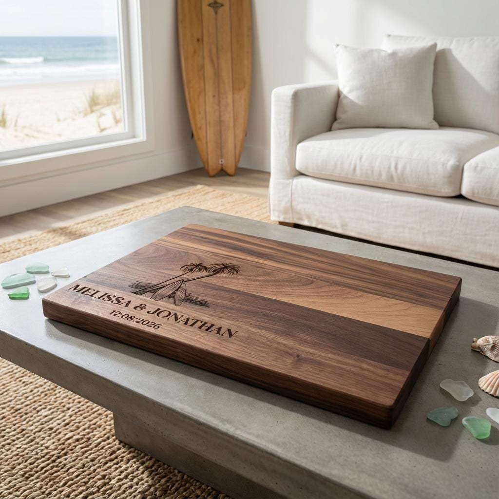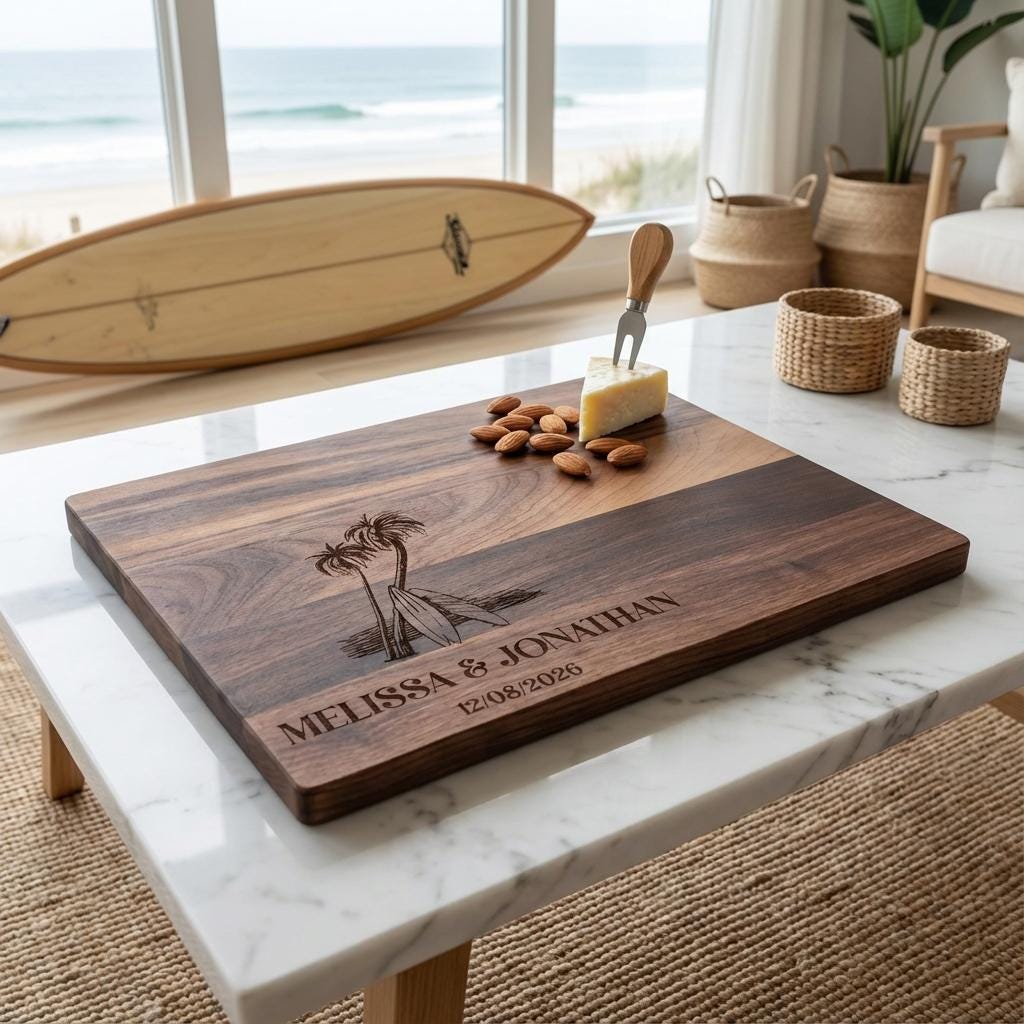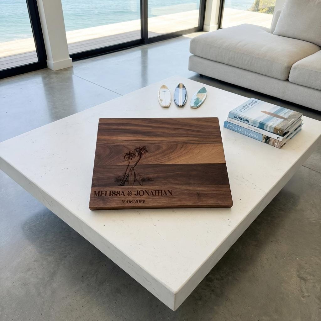 Personalized Surfer Gift for Couple | Custom Walnut Charcuterie Board & Tropical Destination Wedding Present