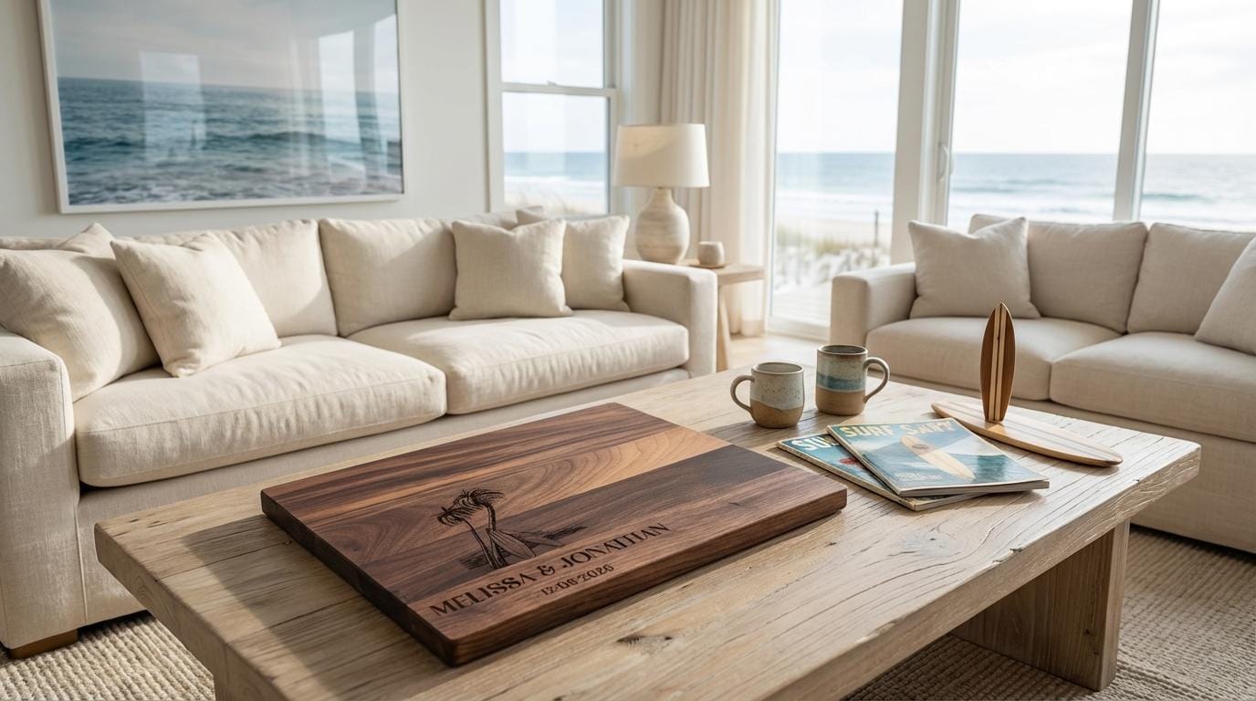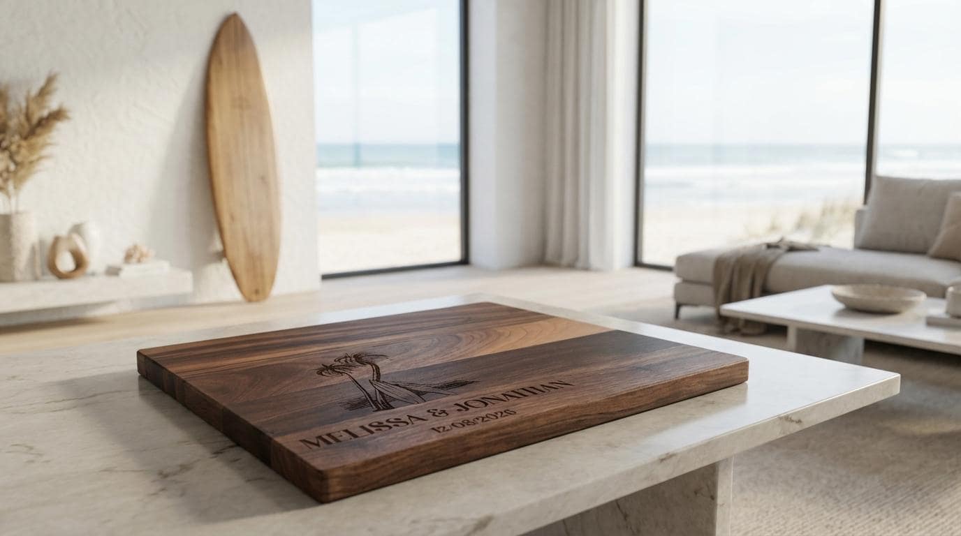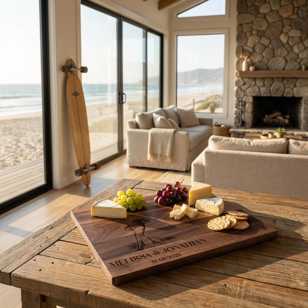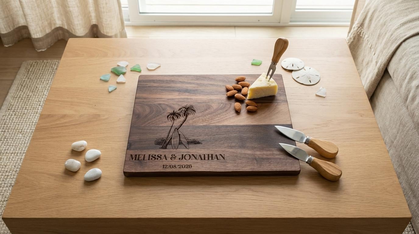 Personalized Surfer Gift for Couple | Custom Walnut Charcuterie Board & Tropical Destination Wedding Present