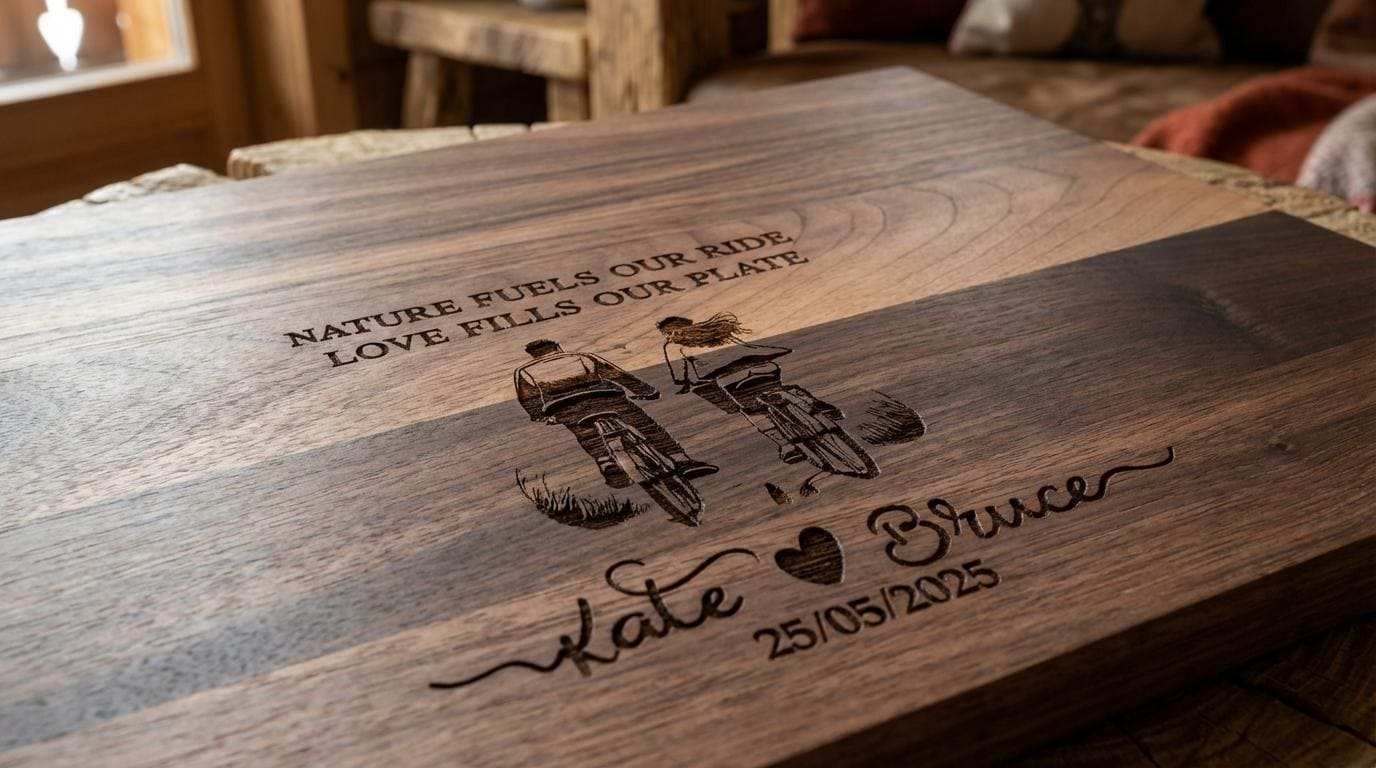 Gear up your kitchen and celebrate your shared journey with this personalized cutting board. Order now and let every meal remind you of the adventures you ride together!