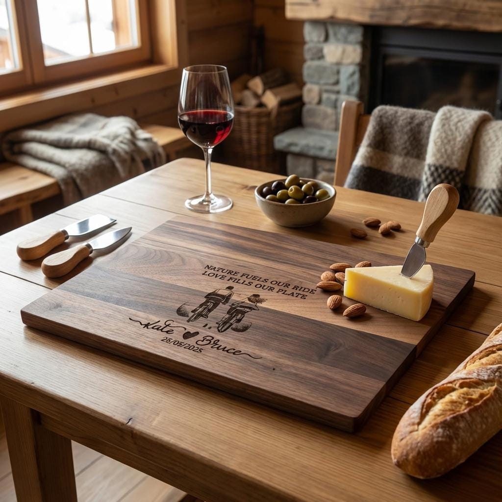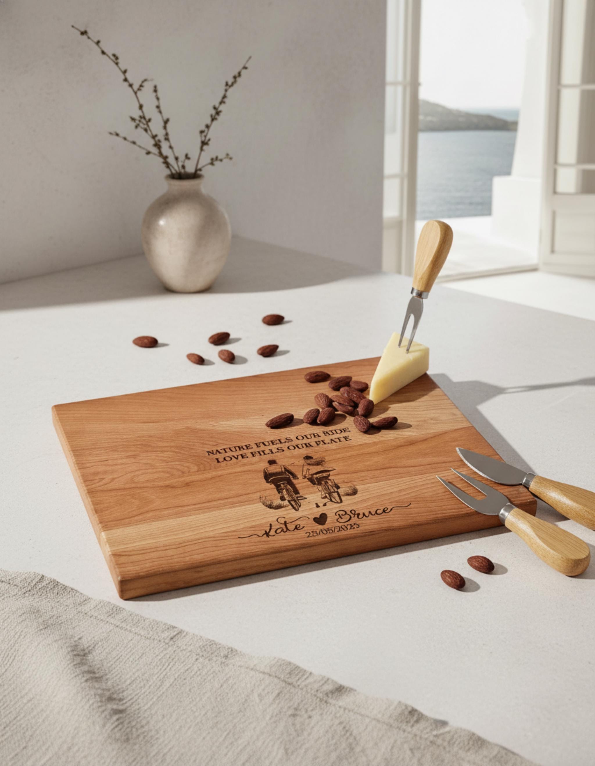 Celebrate your shared adventures and passion for biking with a cutting board that's as dynamic as your love story. This handcrafted board is specially designed for biking couples, featuring an elegant and romantic engraving with a charming scenery and your personalized names. Whether you're prepping ingredients in the kitchen or displaying it as a conversation piece, this board is a tribute to the joy of riding and the warmth of togetherness.