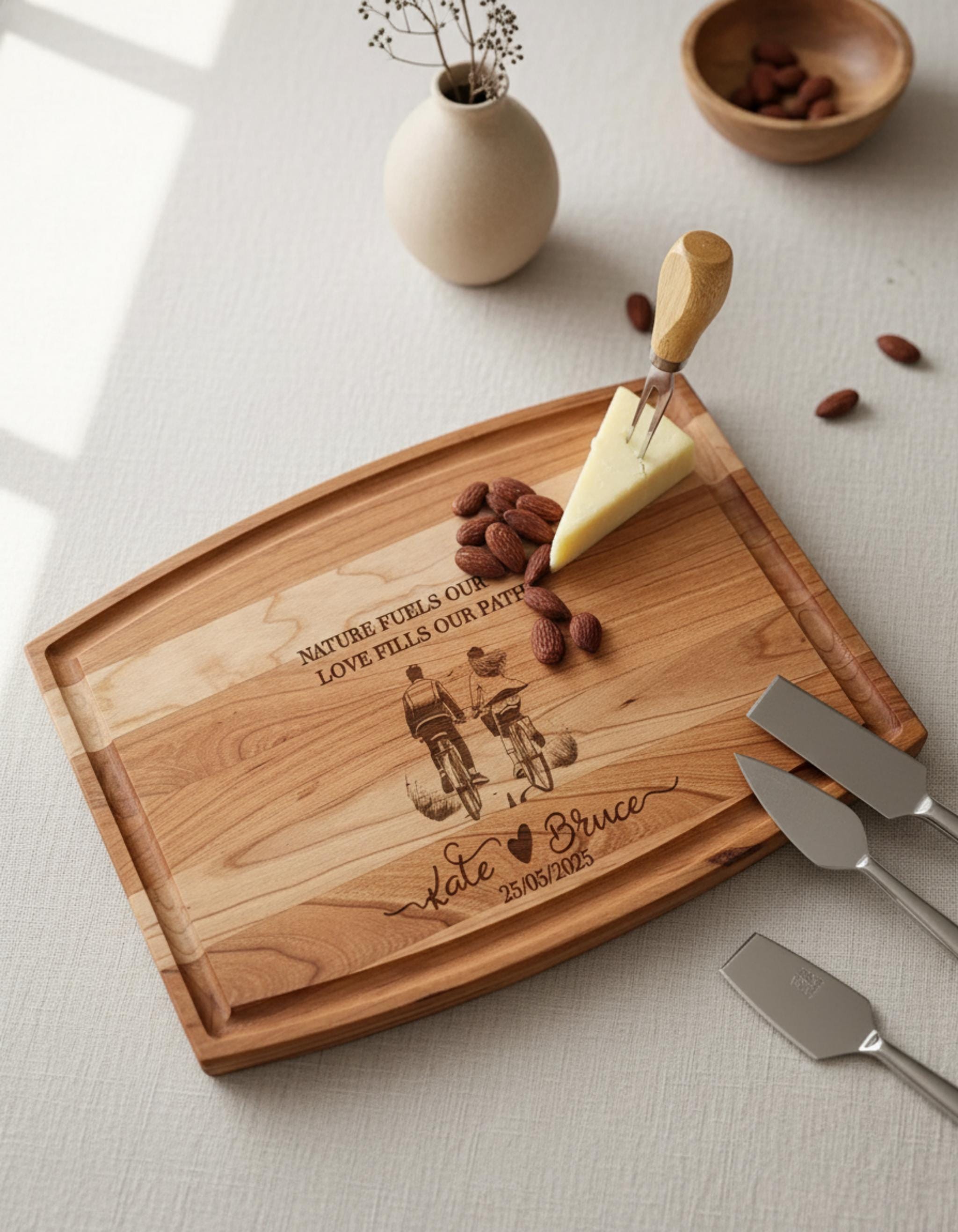 Custom Engraving: Personalize your board with the couple’s names along with a unique bicycle-inspired design that symbolizes your shared journey on and off the trail.