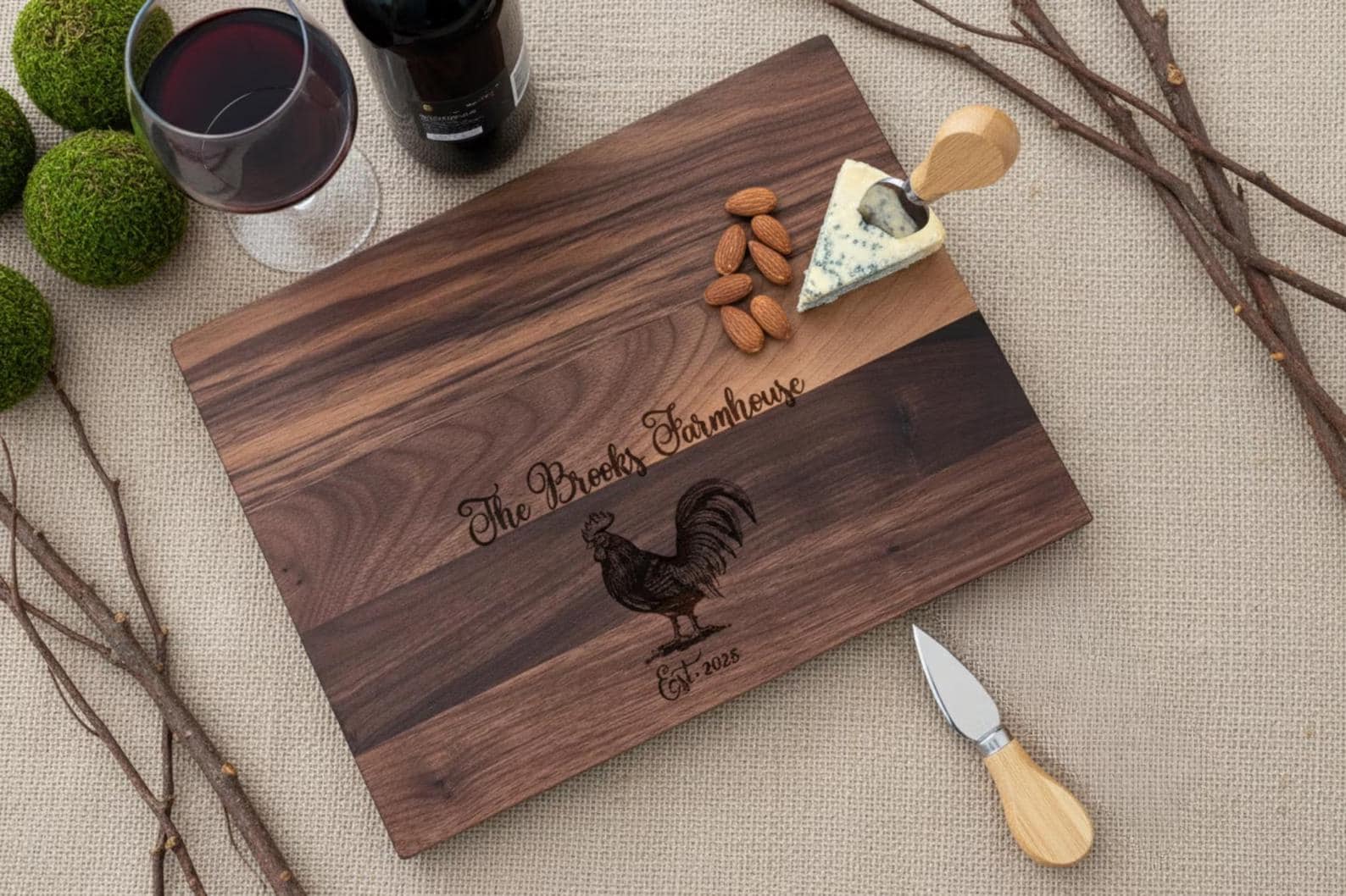 Personalized Farmfouse Cutting Board - Customized Engarved Chiken Charcuterie Board, Housewarming, Wedding, Hosting Gift