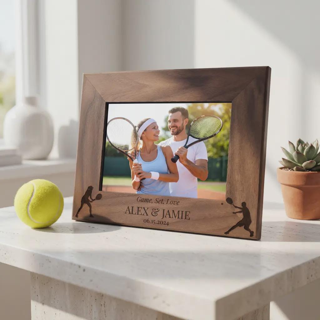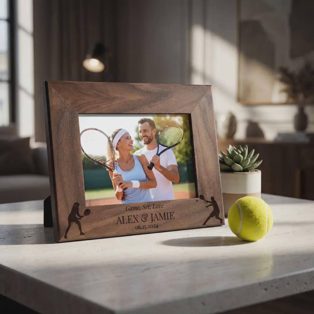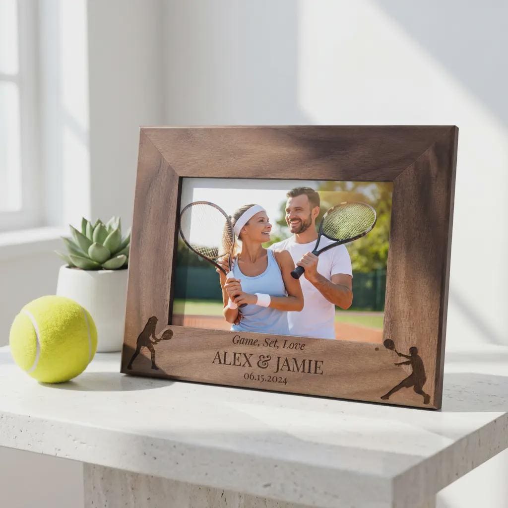 Celebrate your passion with this personalized tennis picture frame. Custom laser-engraved wood featuring any names and dates. A great gift for tennis partners and couples.