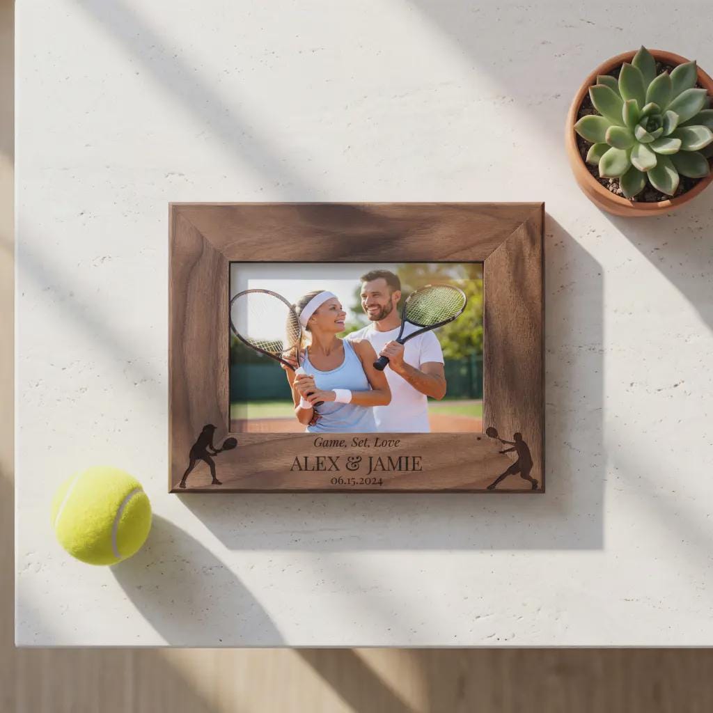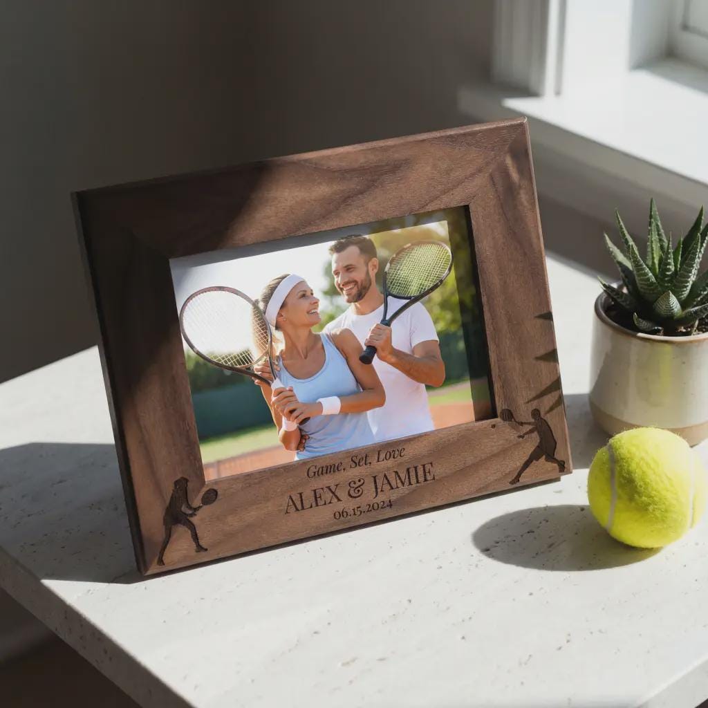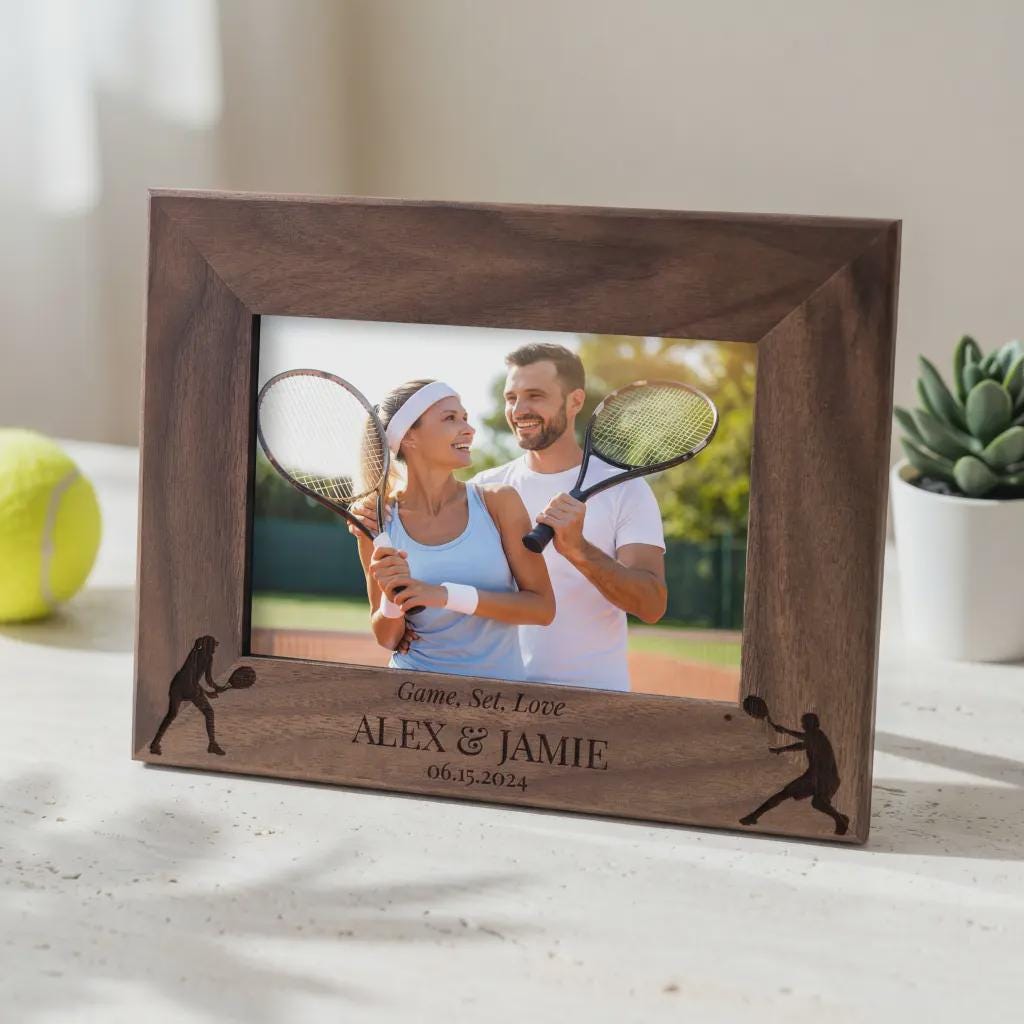 Celebrate your passion with this personalized tennis picture frame. Custom laser-engraved wood featuring any names and dates. A great gift for tennis partners and couples.
