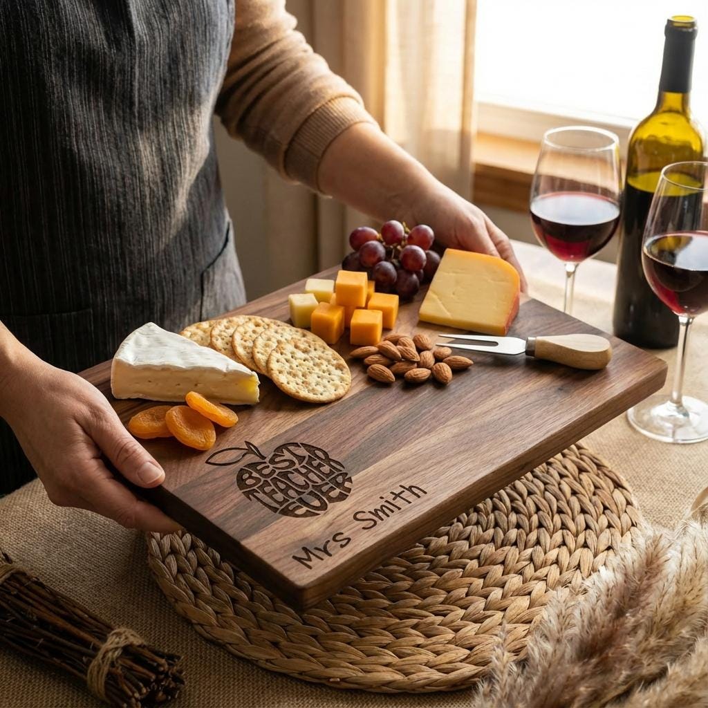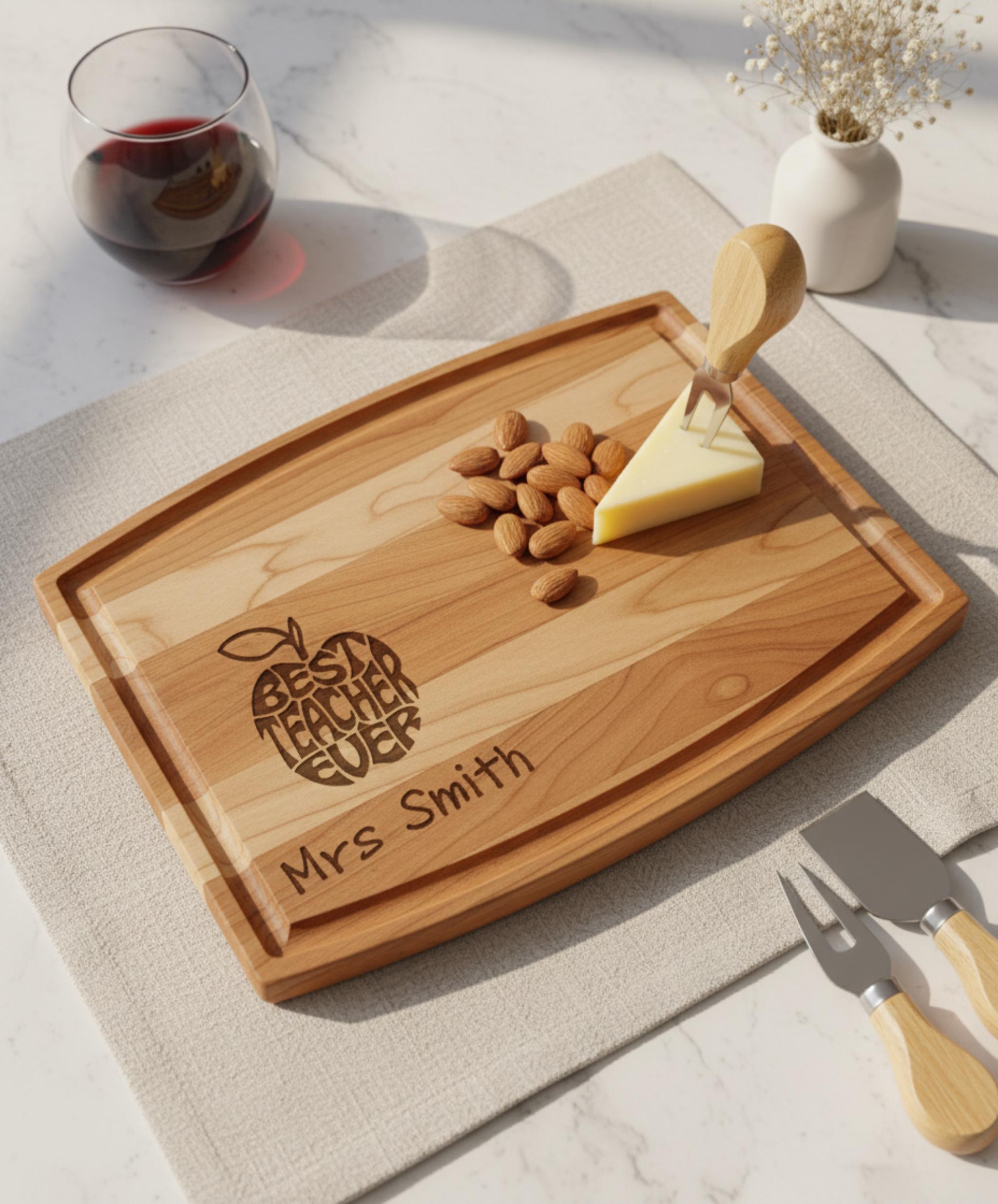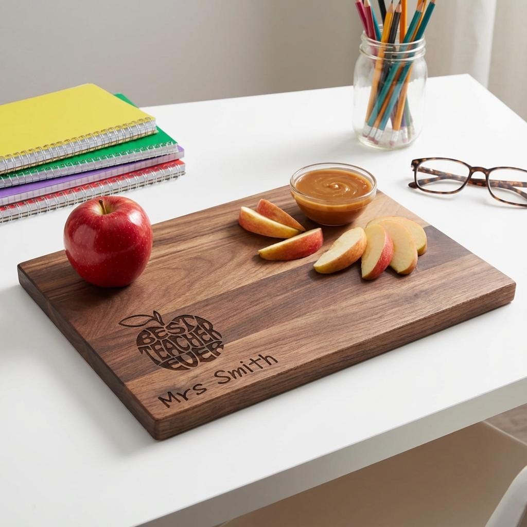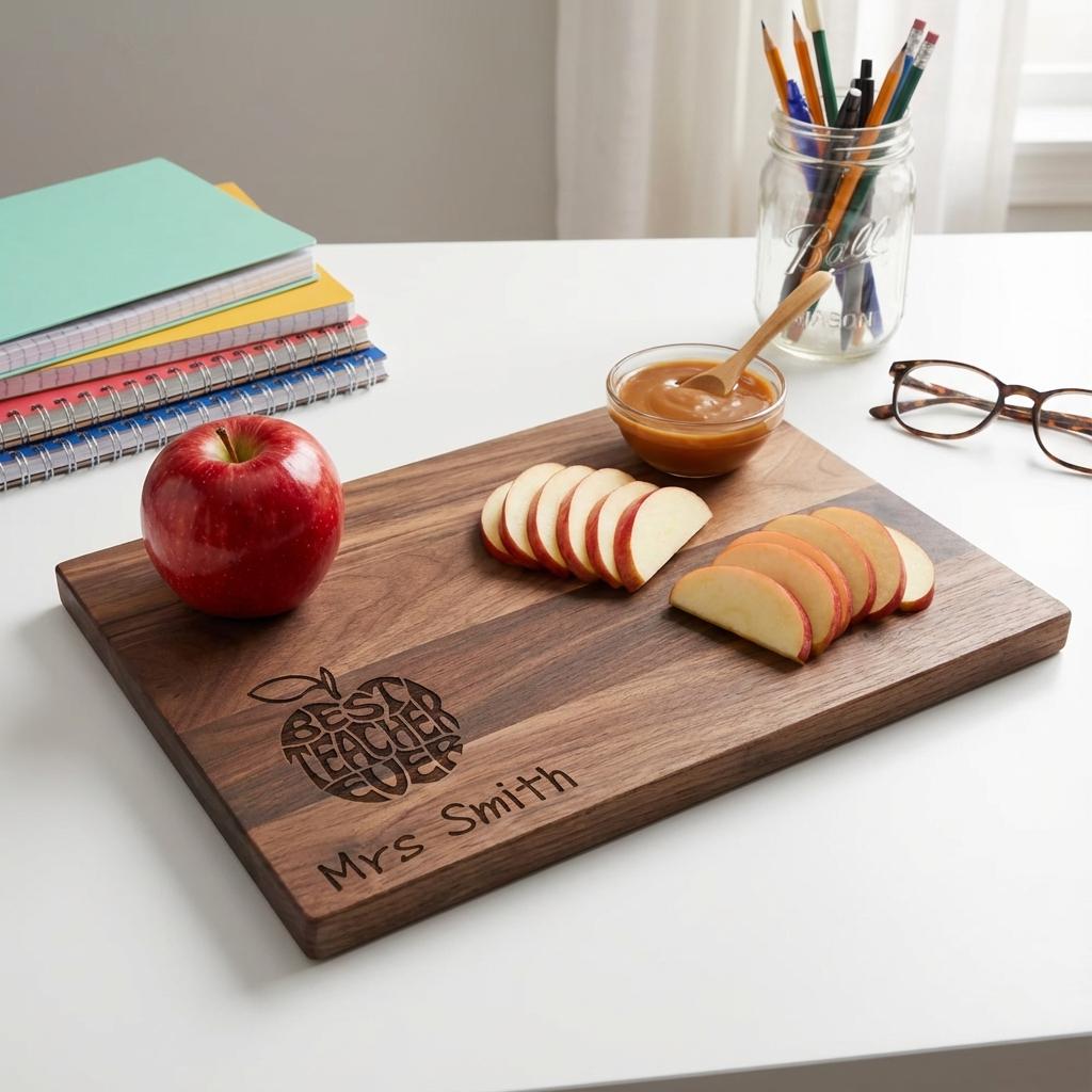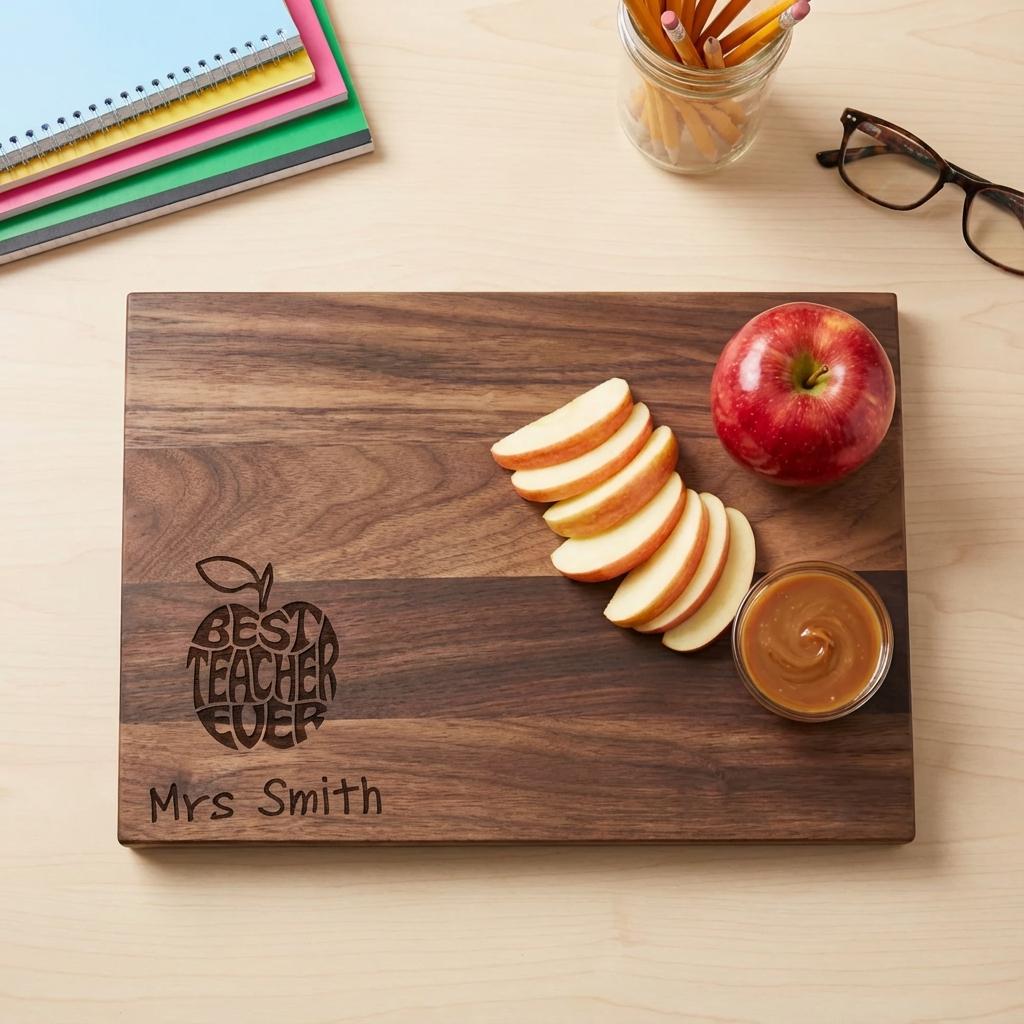 Custom Engraving for Teachers: Featuring a detailed apple design, the words “Best Teacher Ever,” and their name, this cutting board is a one-of-a-kind tribute to their role as an inspiring mentor.