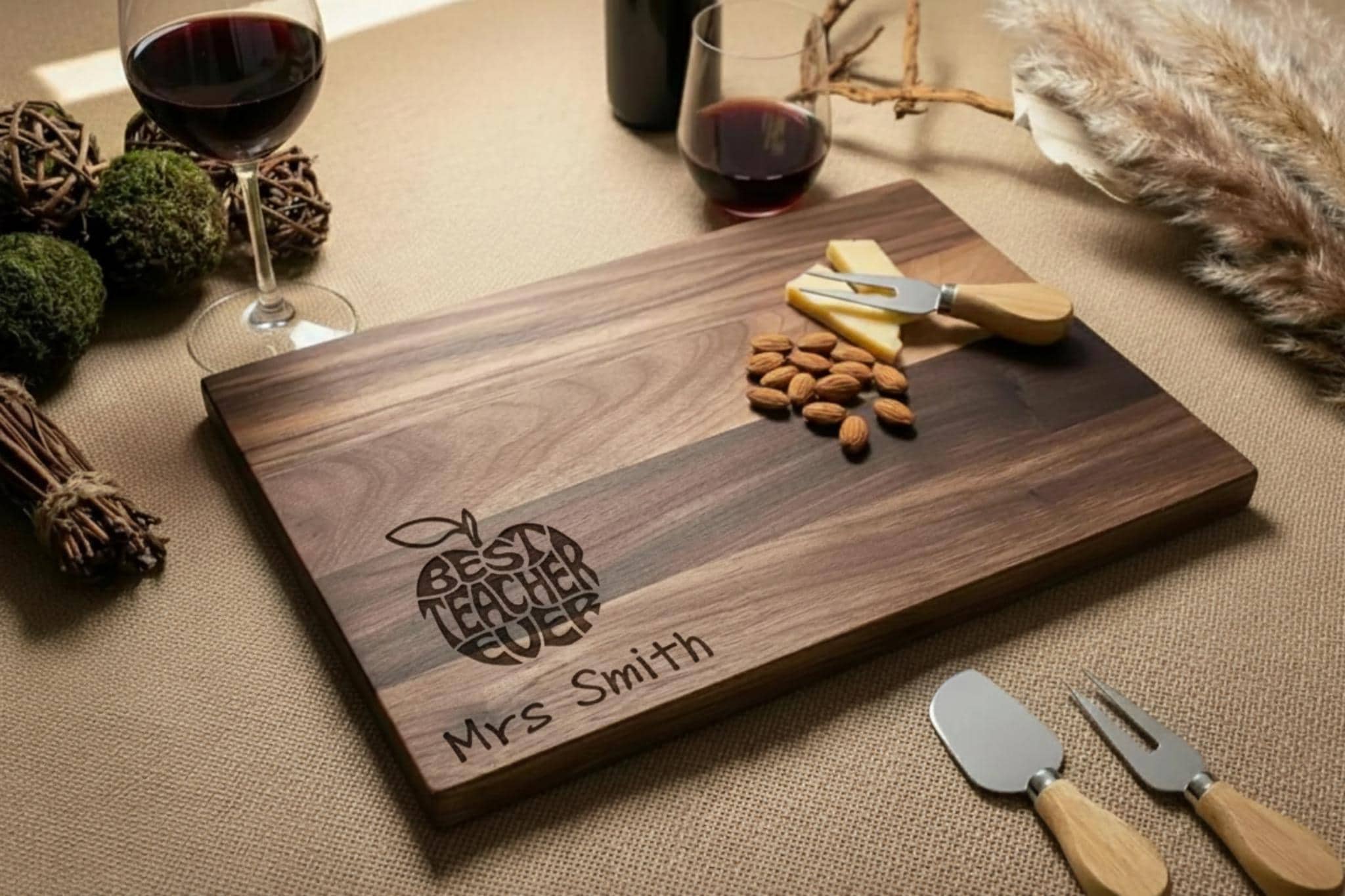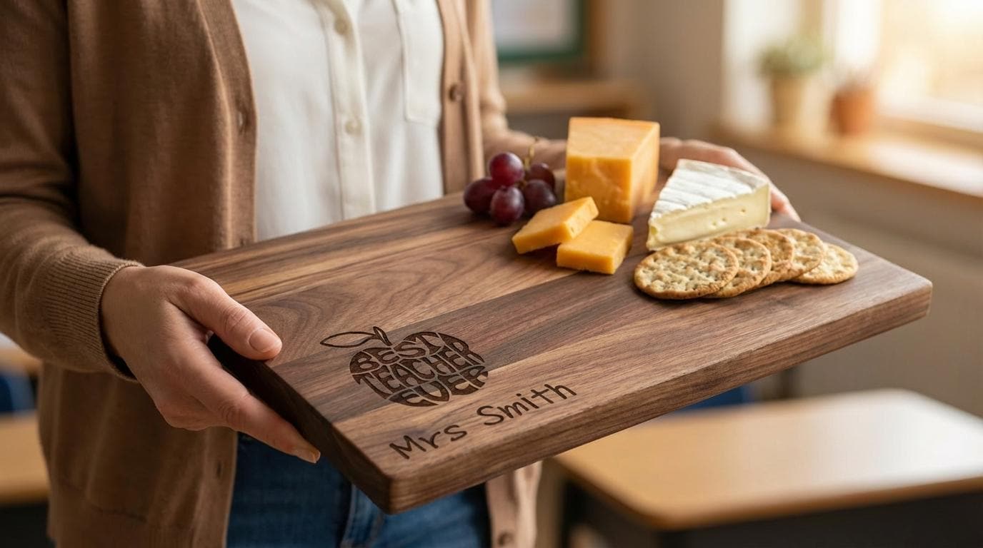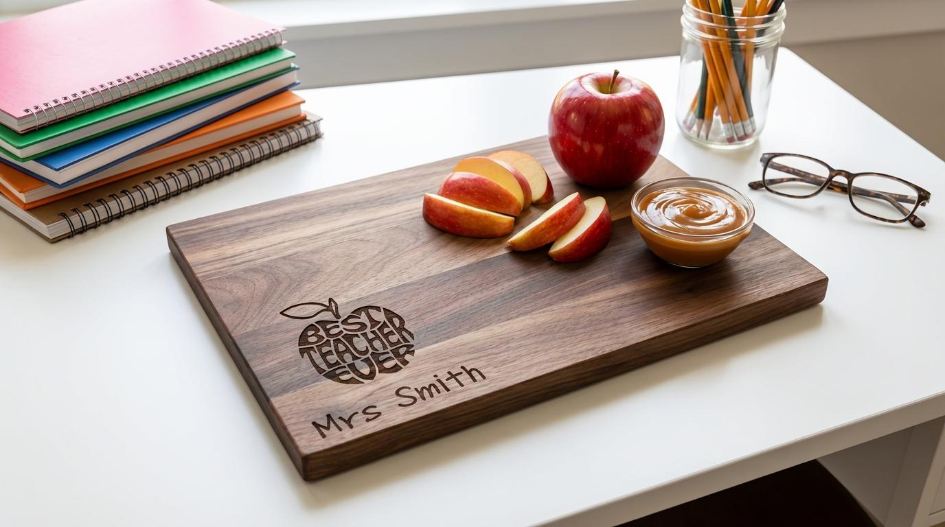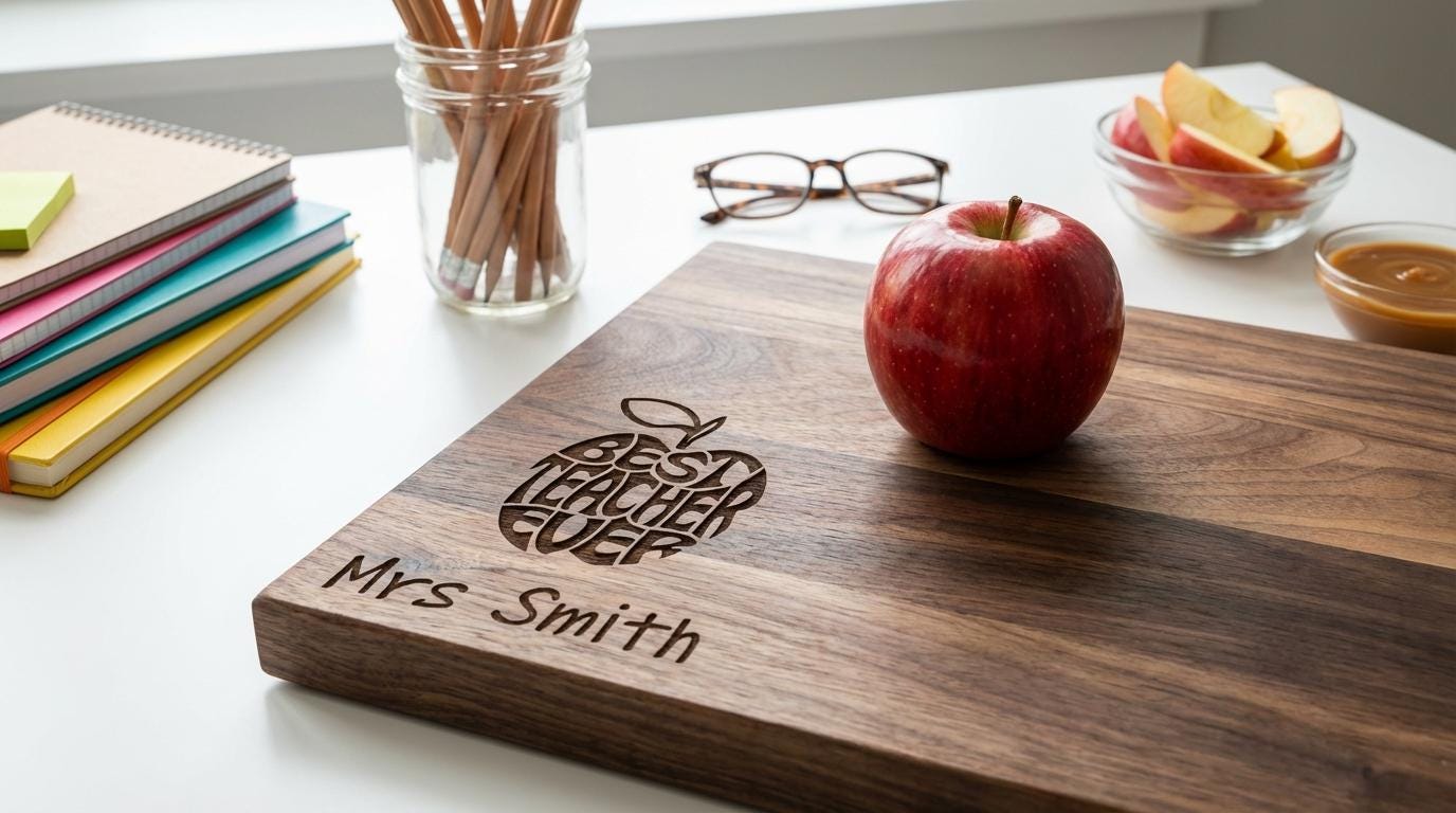 Custom Engraving for Teachers: Featuring a detailed apple design, the words “Best Teacher Ever,” and their name, this cutting board is a one-of-a-kind tribute to their role as an inspiring mentor.