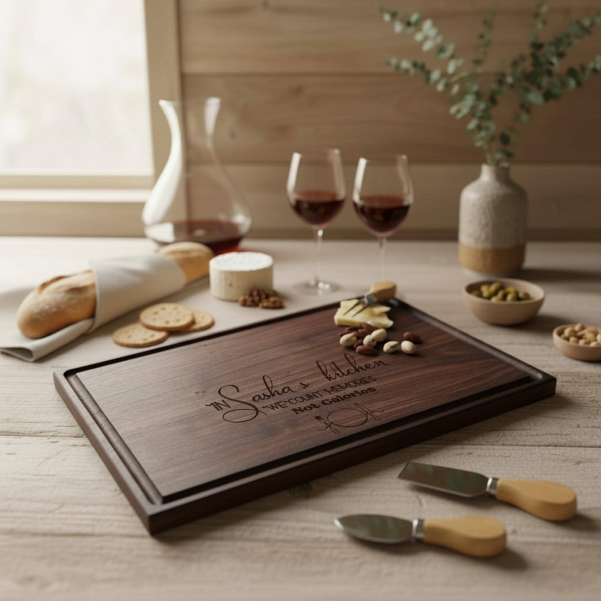 Celebrate the heart of your home with our handcrafted cutting board, beautifully engraved with the charming phrase: “(Name's) Kitchen We Count Memories Not Calories.” This thoughtfully designed piece brings warmth, personality, and functionality to any kitchen.