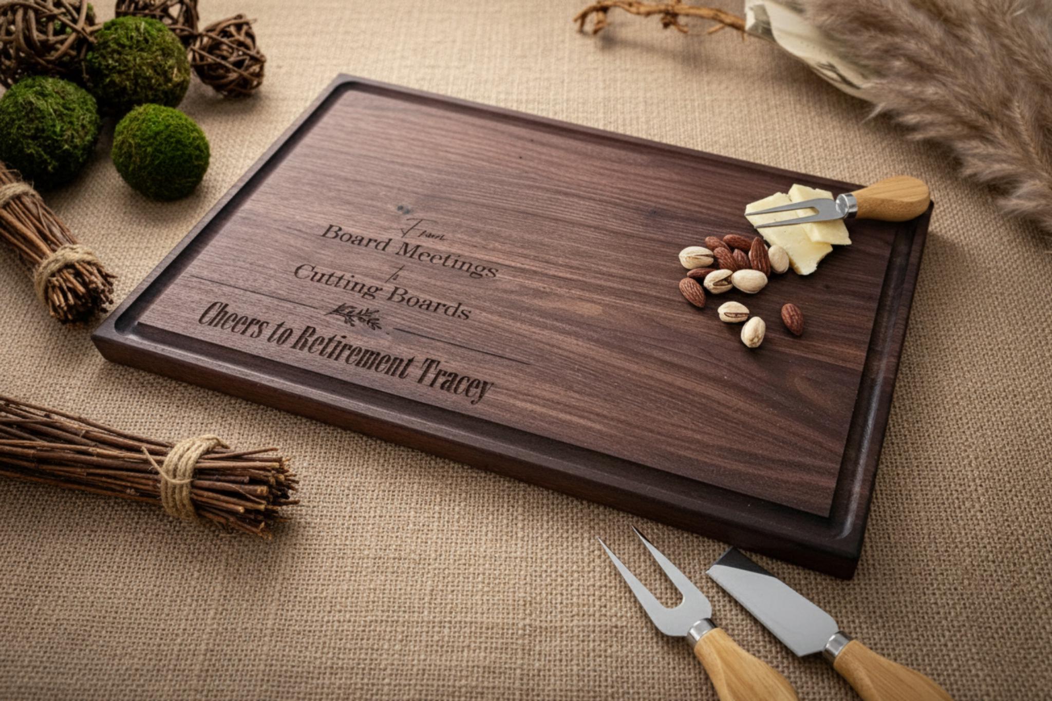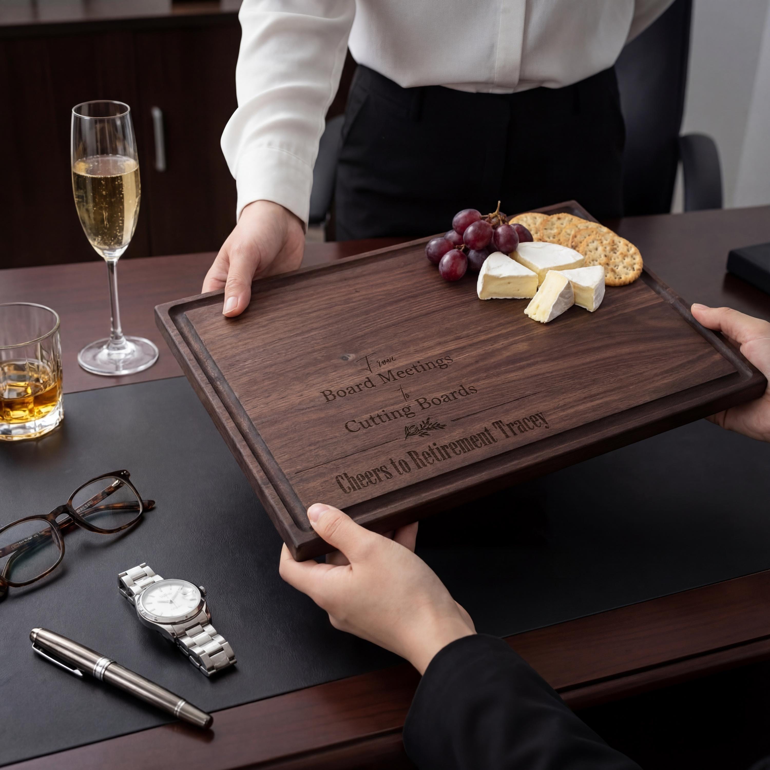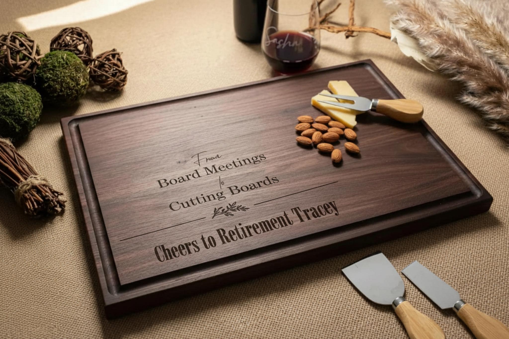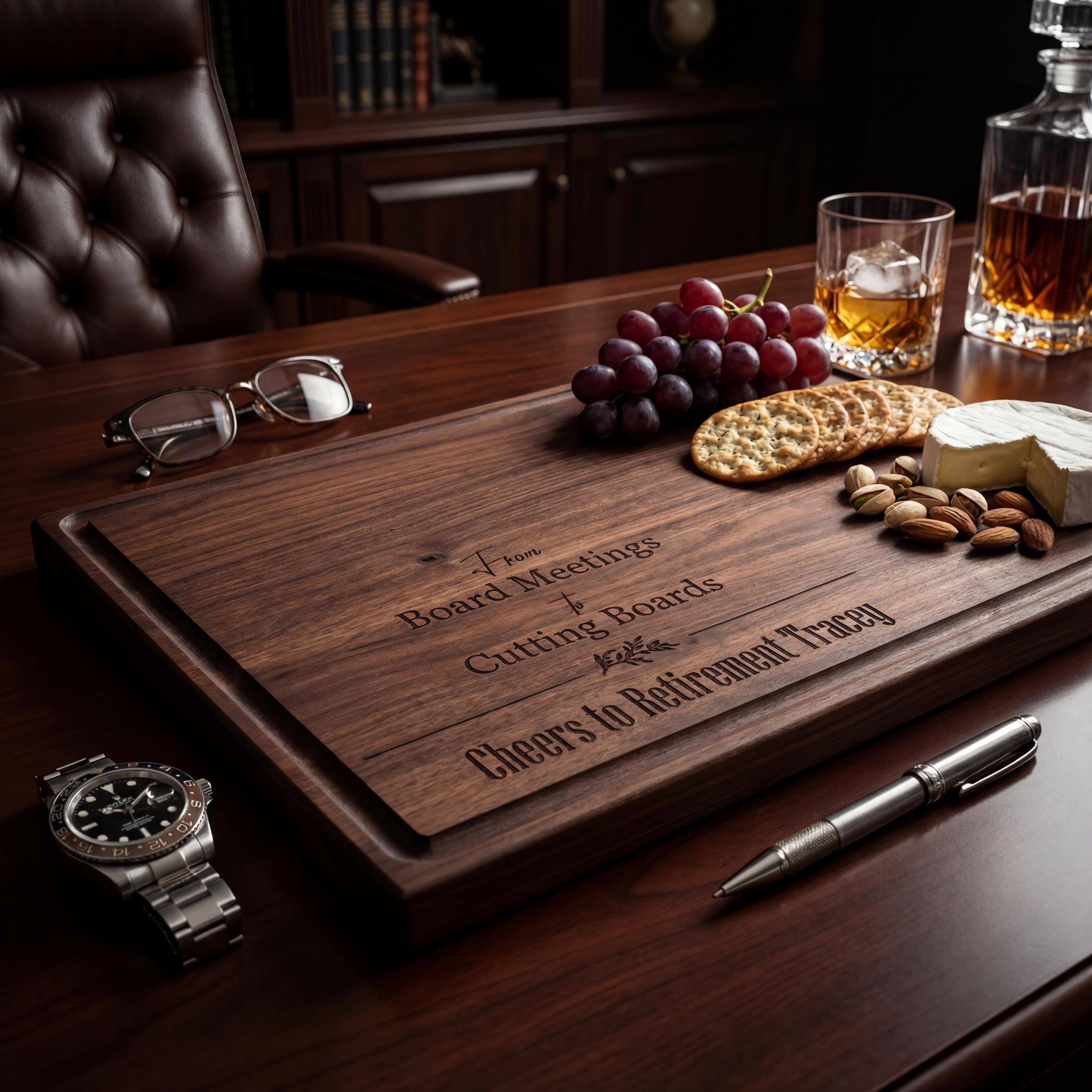 The engraving includes "From Board Meetings to Cutting Boards" and "Cheers to Retirement [Name]."