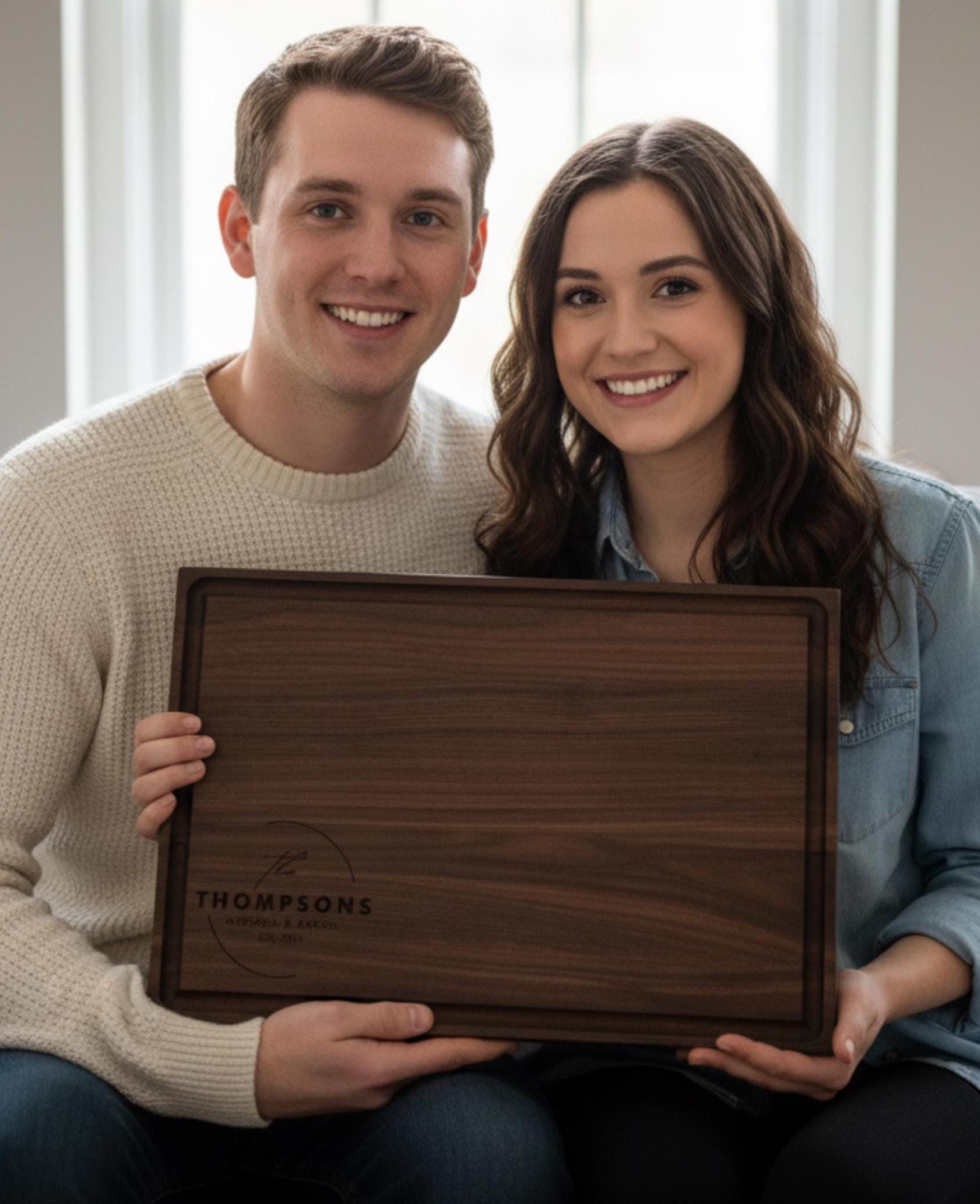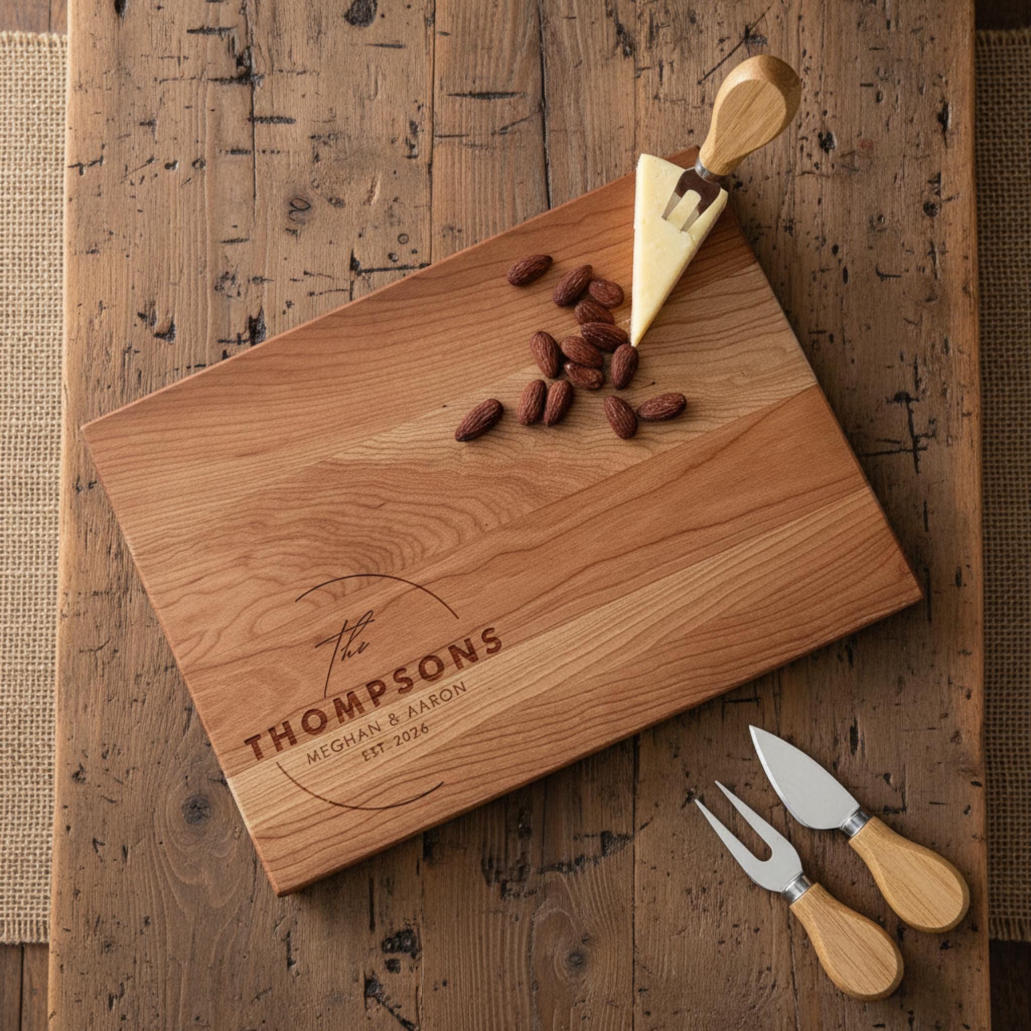 Beautiful laser engraving featuring "The Thompsons, Meghan & Aaron, EST. 2026," creating a lasting keepsake for couples celebrating new beginnings.