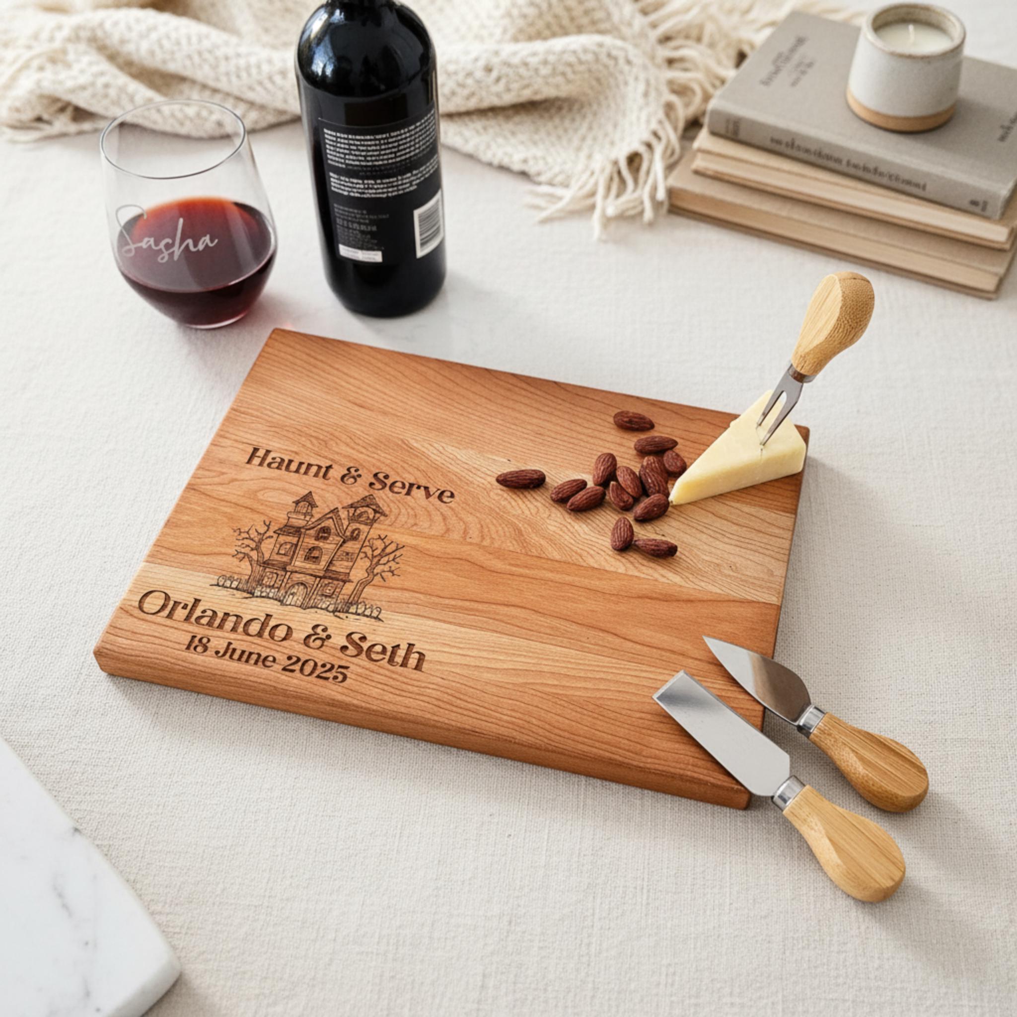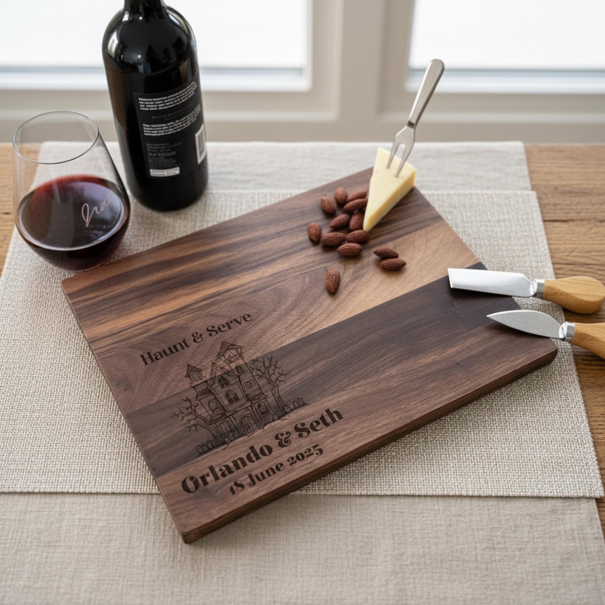 The cutting board features a detailed, comic-inspired haunted house engraving that brings the spooky theme to life. The added quote "Haunt and Serve" and personalized couple’s names create a memorable keepsake.