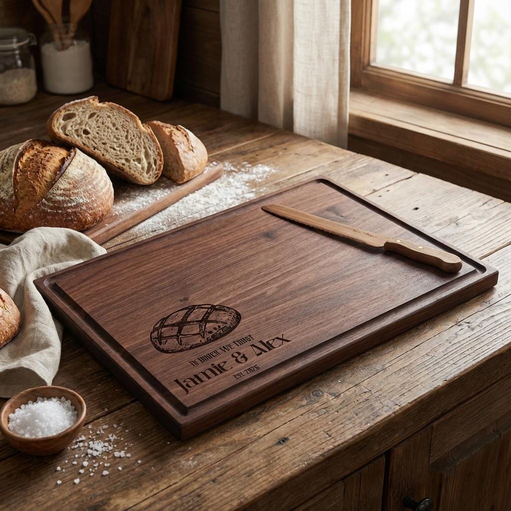 Personalized Sourdough Bread Board | "In Dough We Trust" Walnut Cutting Board & Custom Baker Gift