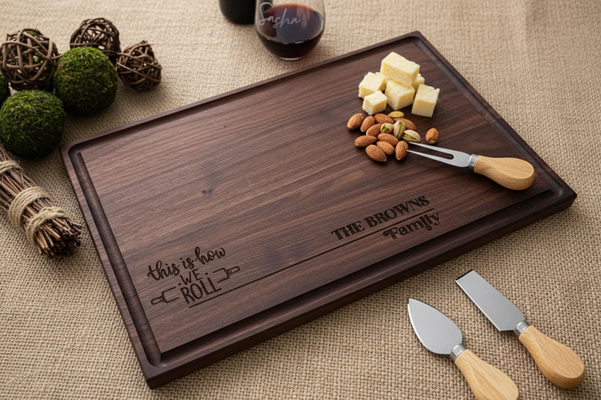 Celebrate the joy of cooking and family moments with our Custom Family Rolling Pin Cutting Board—a personalized gift perfect for families, special occasions, cooking and baking lovers, couples, and housewarming gifts. Handcrafted from premium Walnut, Cherry, or Acacia wood, this board features the playful phrase "This Is How We Roll" along with a rolling pin design, bringing fun and warmth to your kitchen.