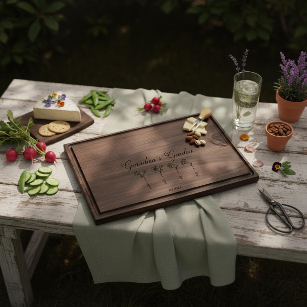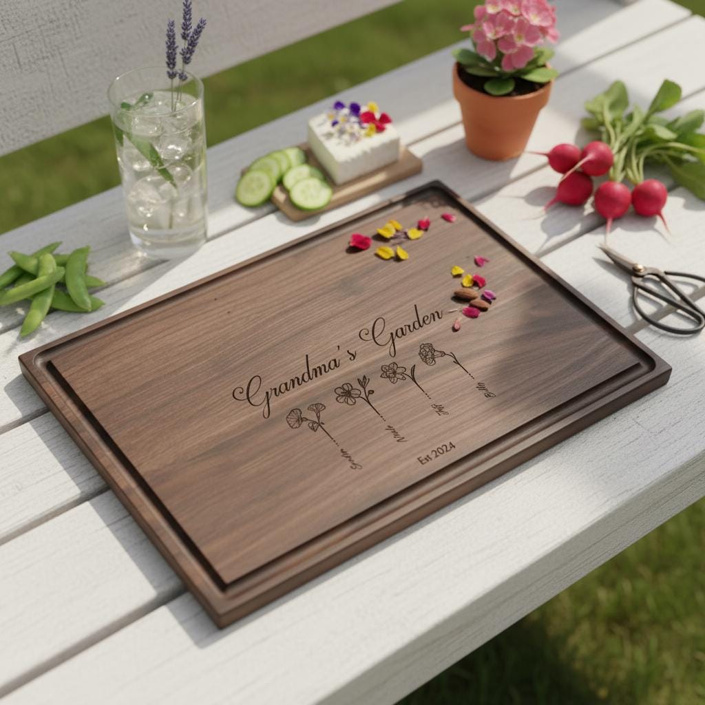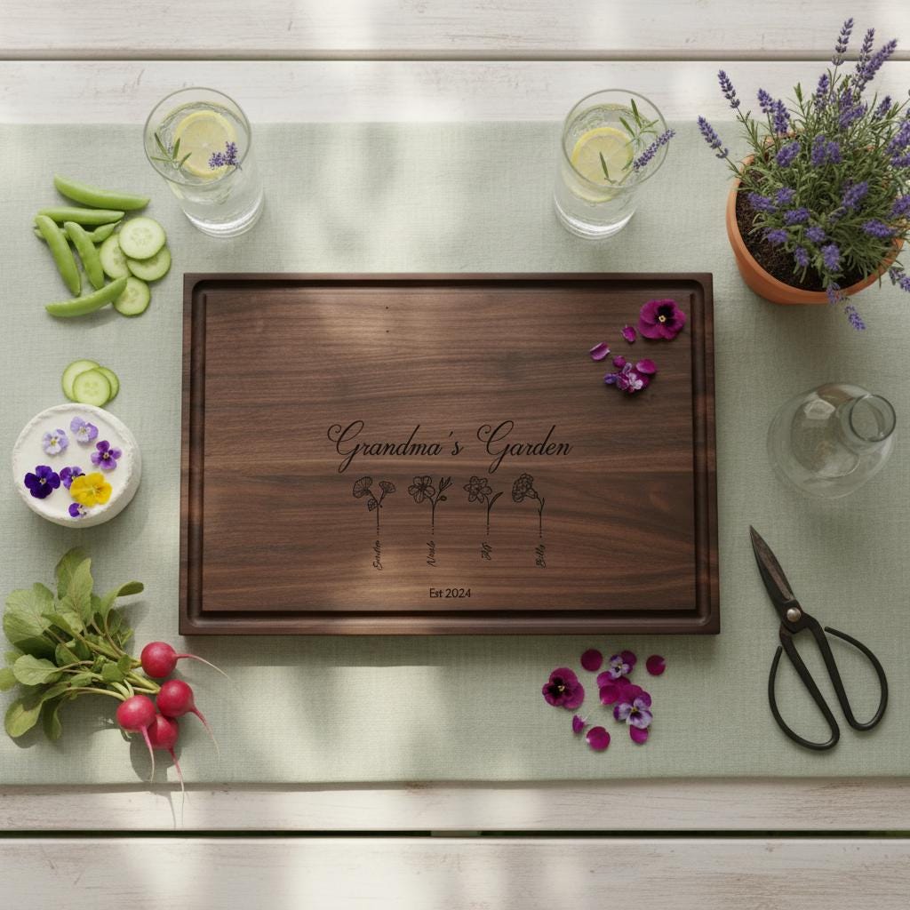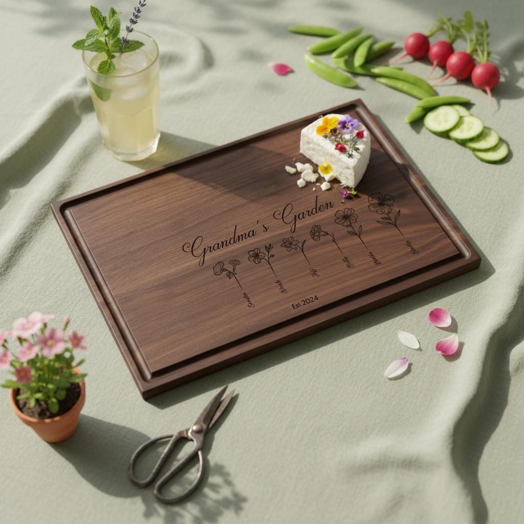 Personalized Grandma's Garden Birth Flower Cutting Board | Custom Wooden Platter for Nana