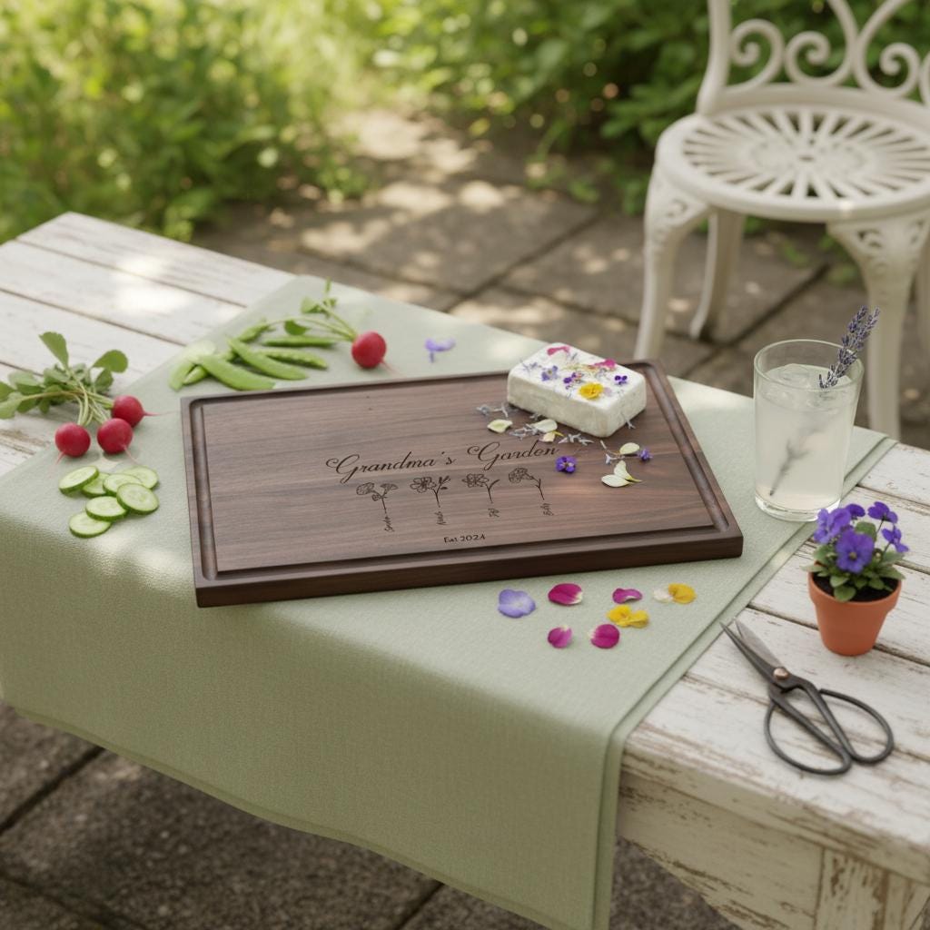 Celebrate the roots of your family with this Grandma’s Garden birth flower cutting board. Each piece is a handcrafted wood platter custom-engraved with delicate floral illustrations representing each grandchild. It serves as a meaningful Mother’s Day keepsake or a unique Nana birthday present that blends functional kitchenware with sentimental art. This high-quality personalized serving board is designed to be displayed and cherished for generations.