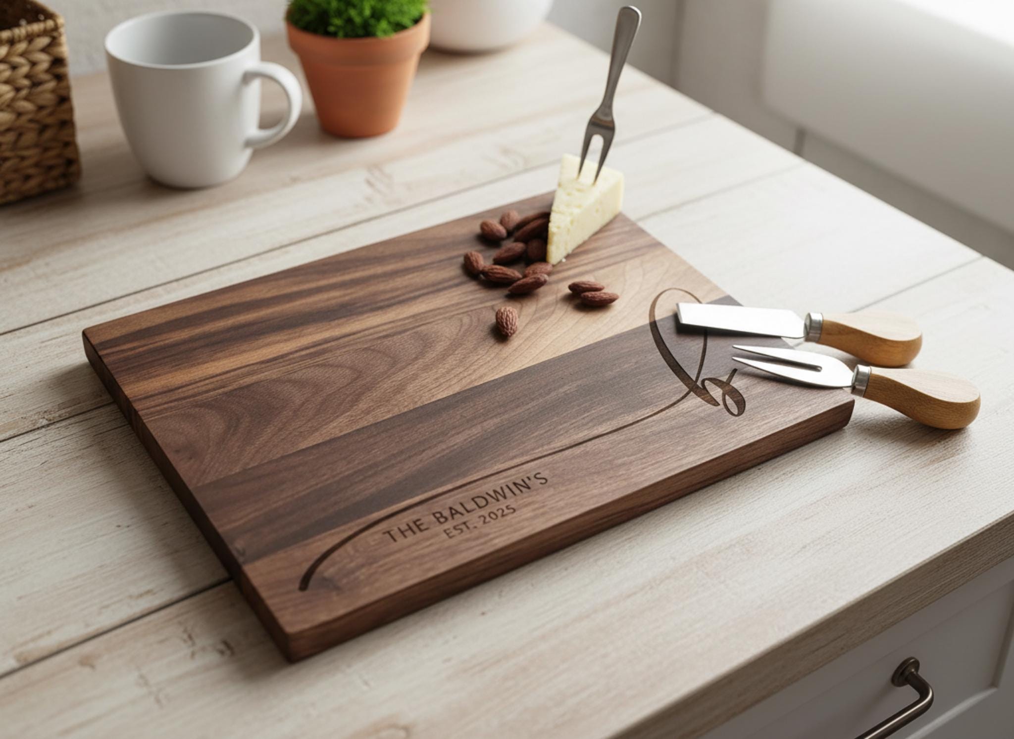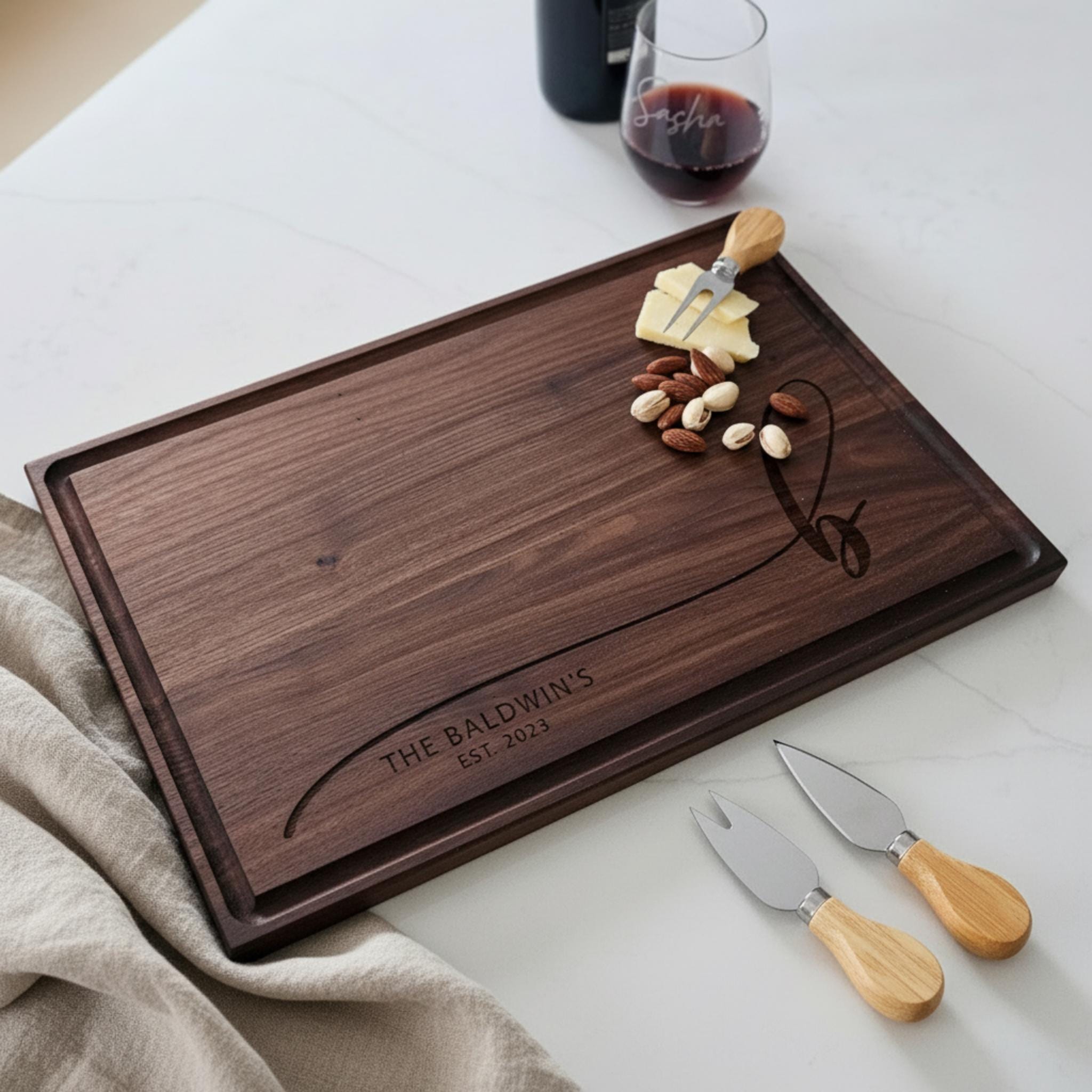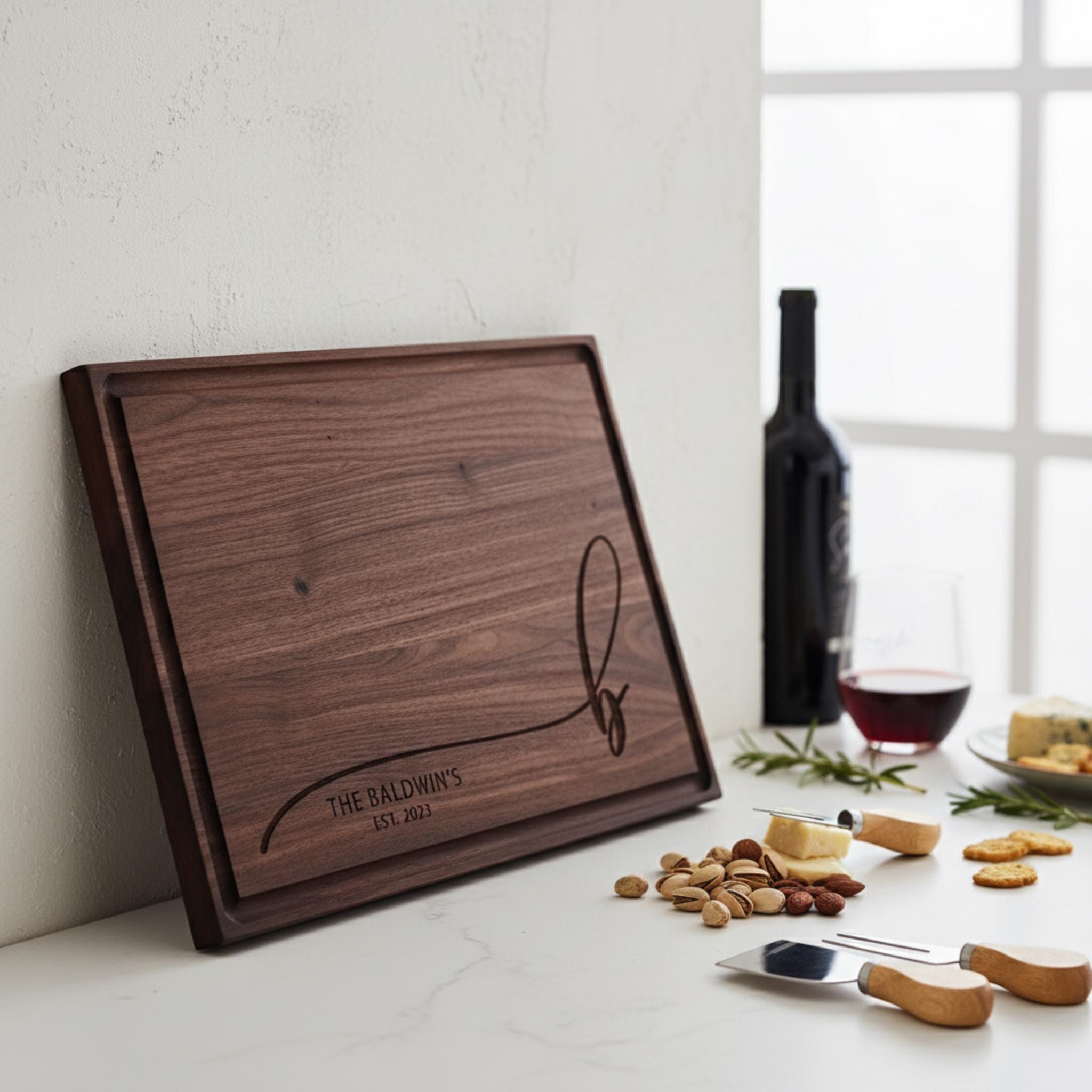 Add timeless charm to your kitchen with our handcrafted cutting board, thoughtfully designed to honor your family name. Each board is made with exceptional care and precision, featuring custom laser engraving that beautifully combines your family name and its initial. This stunning piece transforms a practical kitchen tool into a meaningful keepsake that blends everyday functionality with sophisticated decor.
