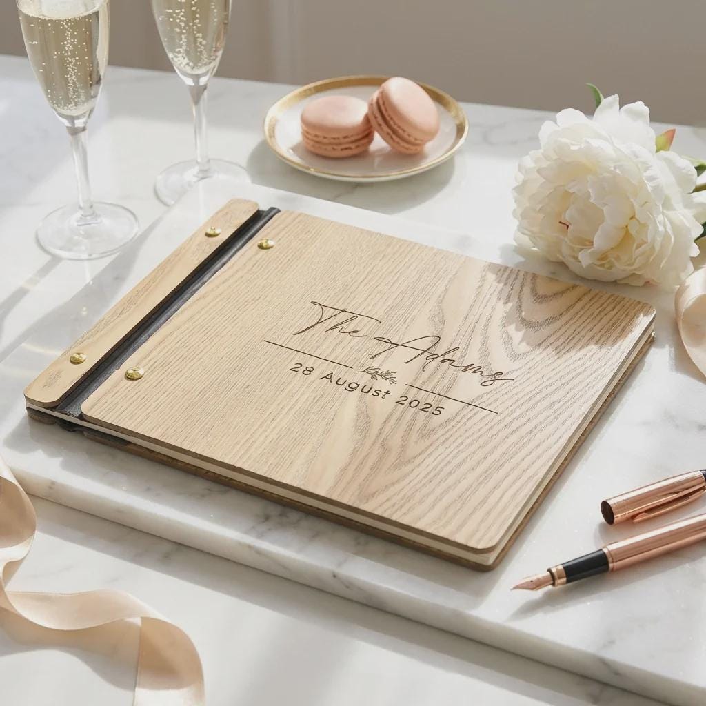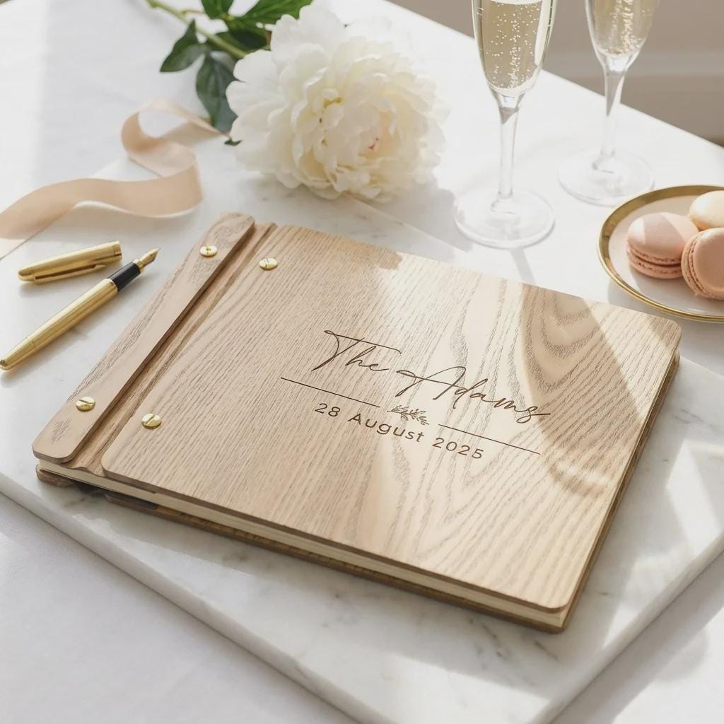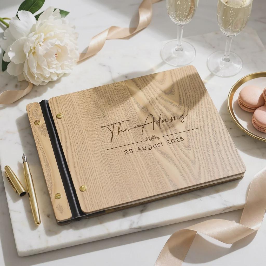 Commemorate your special day with this personalized wood wedding guest book. Hand-crafted with a solid natural wood cover, each book is precision laser-engraved with a modern script design, custom names, and any special date. Engineered for archival durability, this book features 80 pages of premium 120g paper, providing a professional-grade surface for guest messages, well-wishes, or instant photos.
