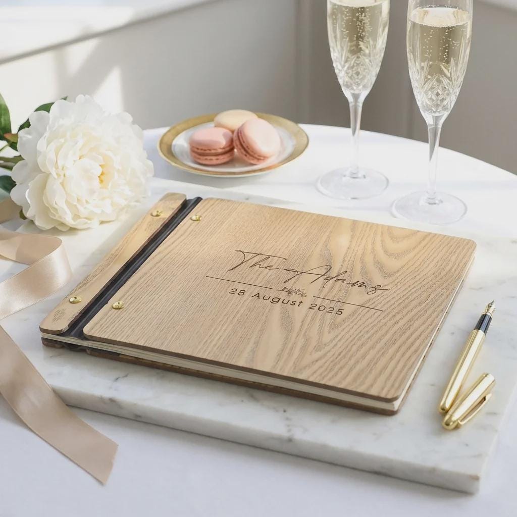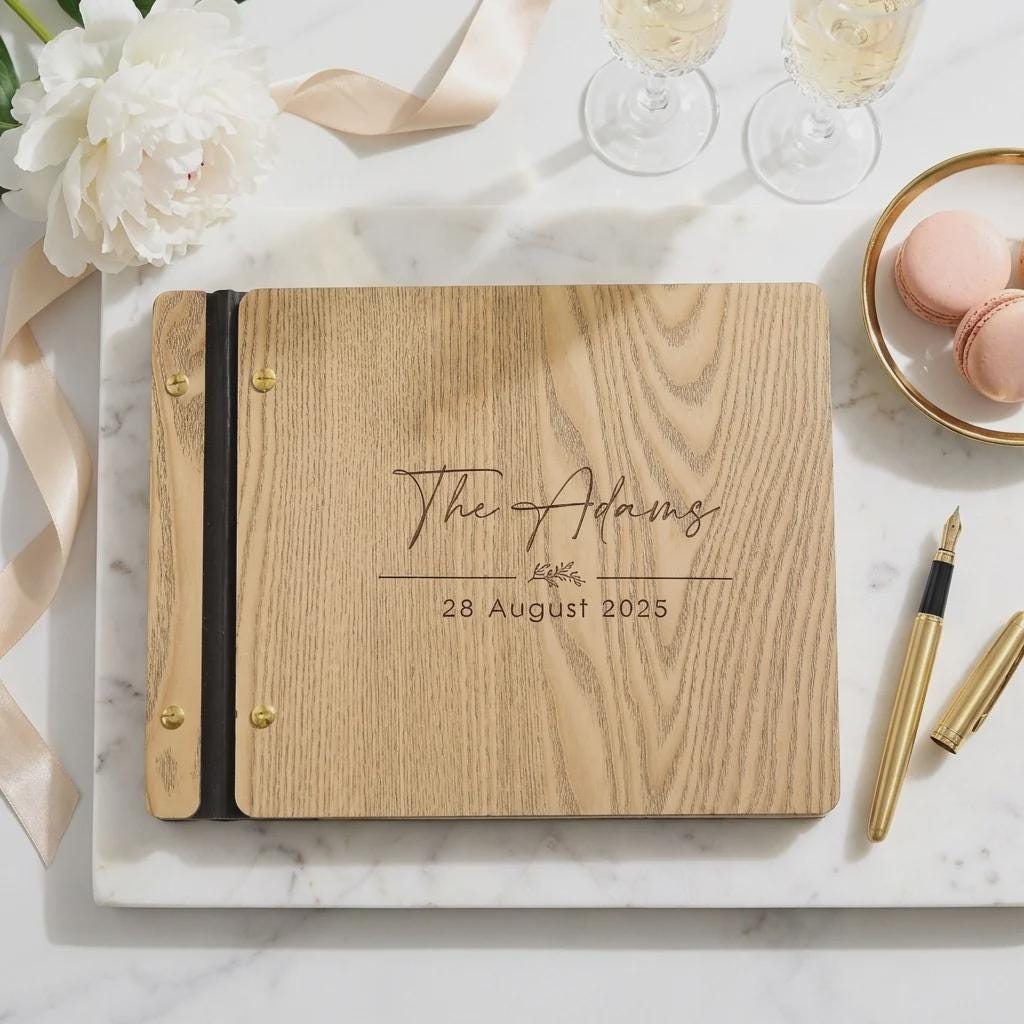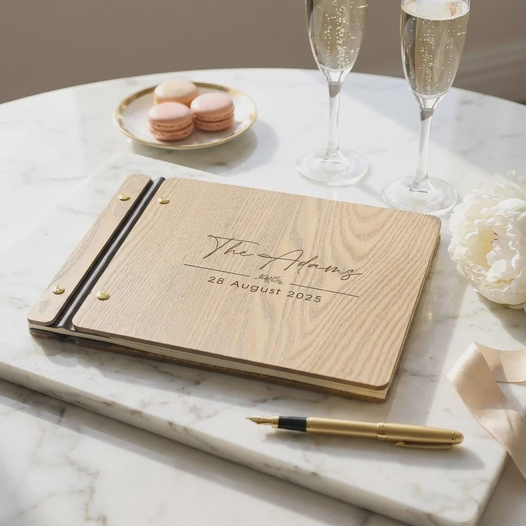 Commemorate your special day with this personalized wood wedding guest book. Hand-crafted with a solid natural wood cover, each book is precision laser-engraved with a modern script design, custom names, and any special date. Engineered for archival durability, this book features 80 pages of premium 120g paper, providing a professional-grade surface for guest messages, well-wishes, or instant photos.