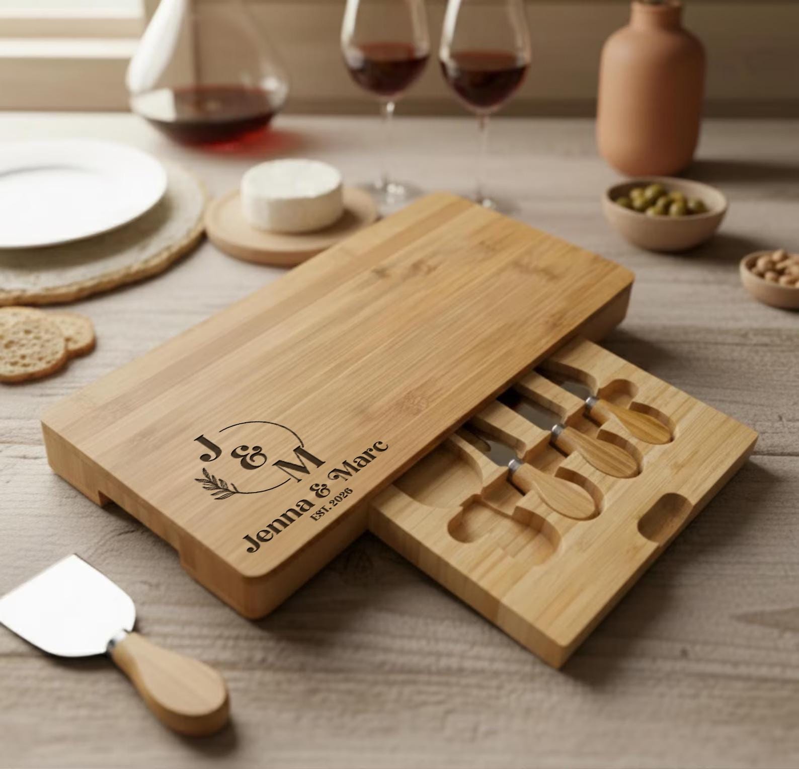 Elevate your entertaining style with our Custom Engraved Cheese Board Set. Handcrafted from eco-friendly bamboo, this personalized serving board makes every occasion memorable—perfect for weddings, bridal showers, housewarmings, and everyday gatherings.