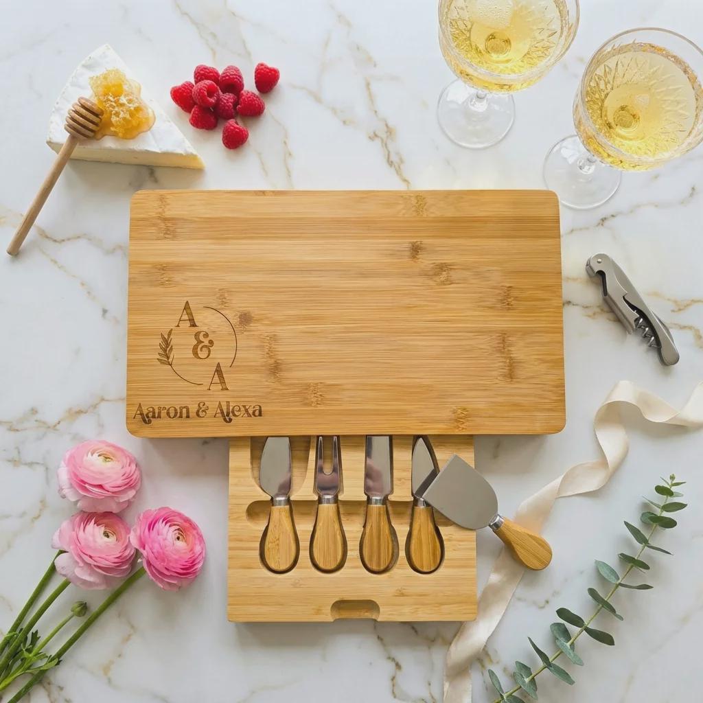 Personalized Bamboo Cheese Board Set with 4 Knives, Custom Monogram Wedding Gift for Couple
