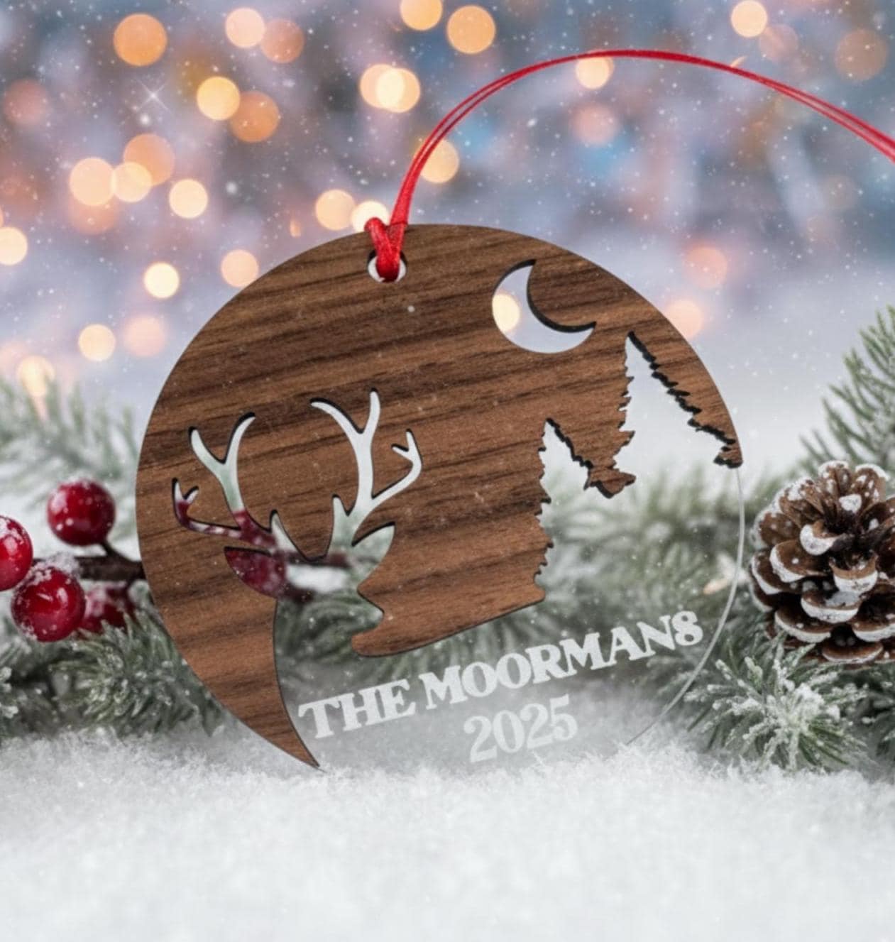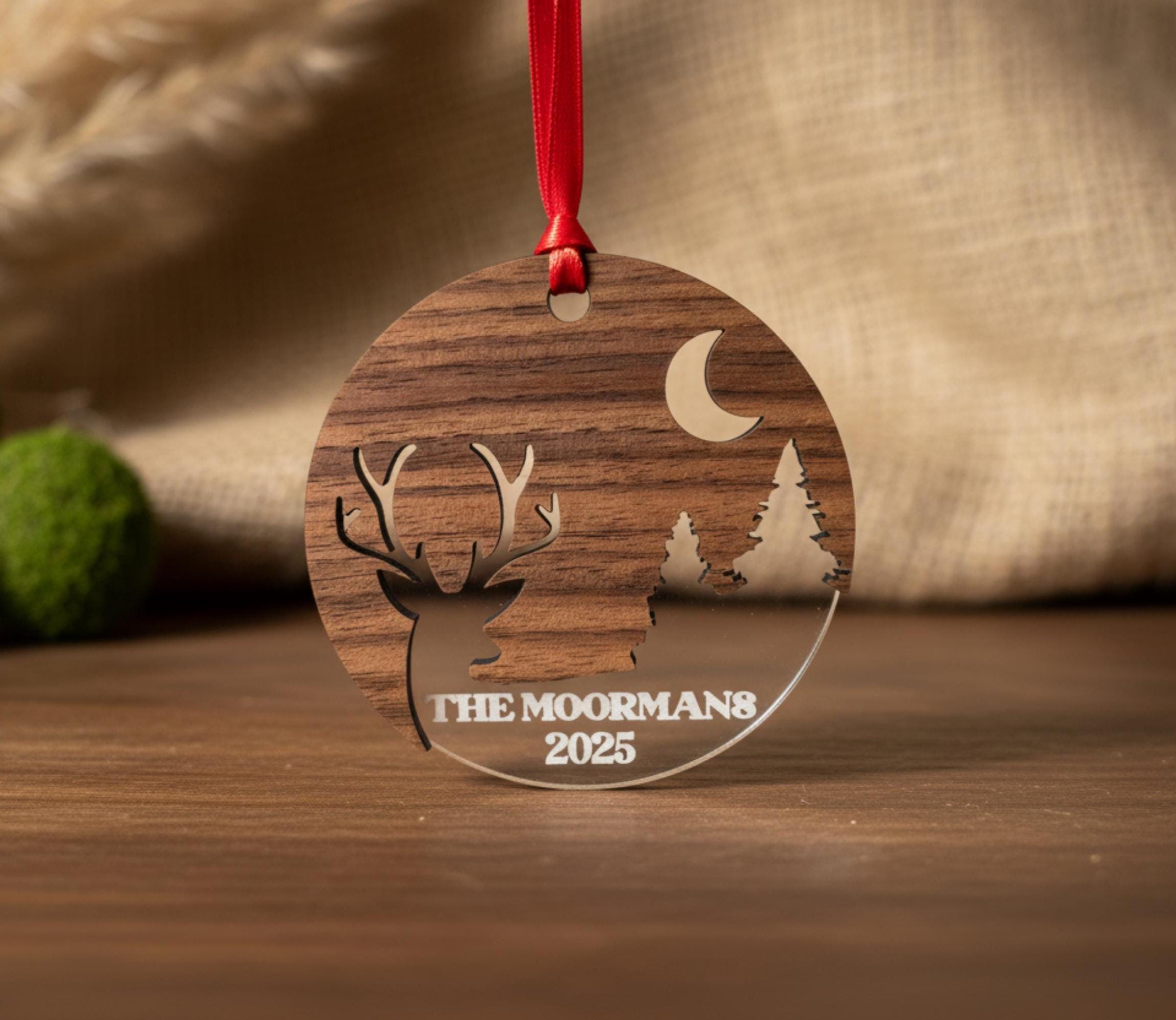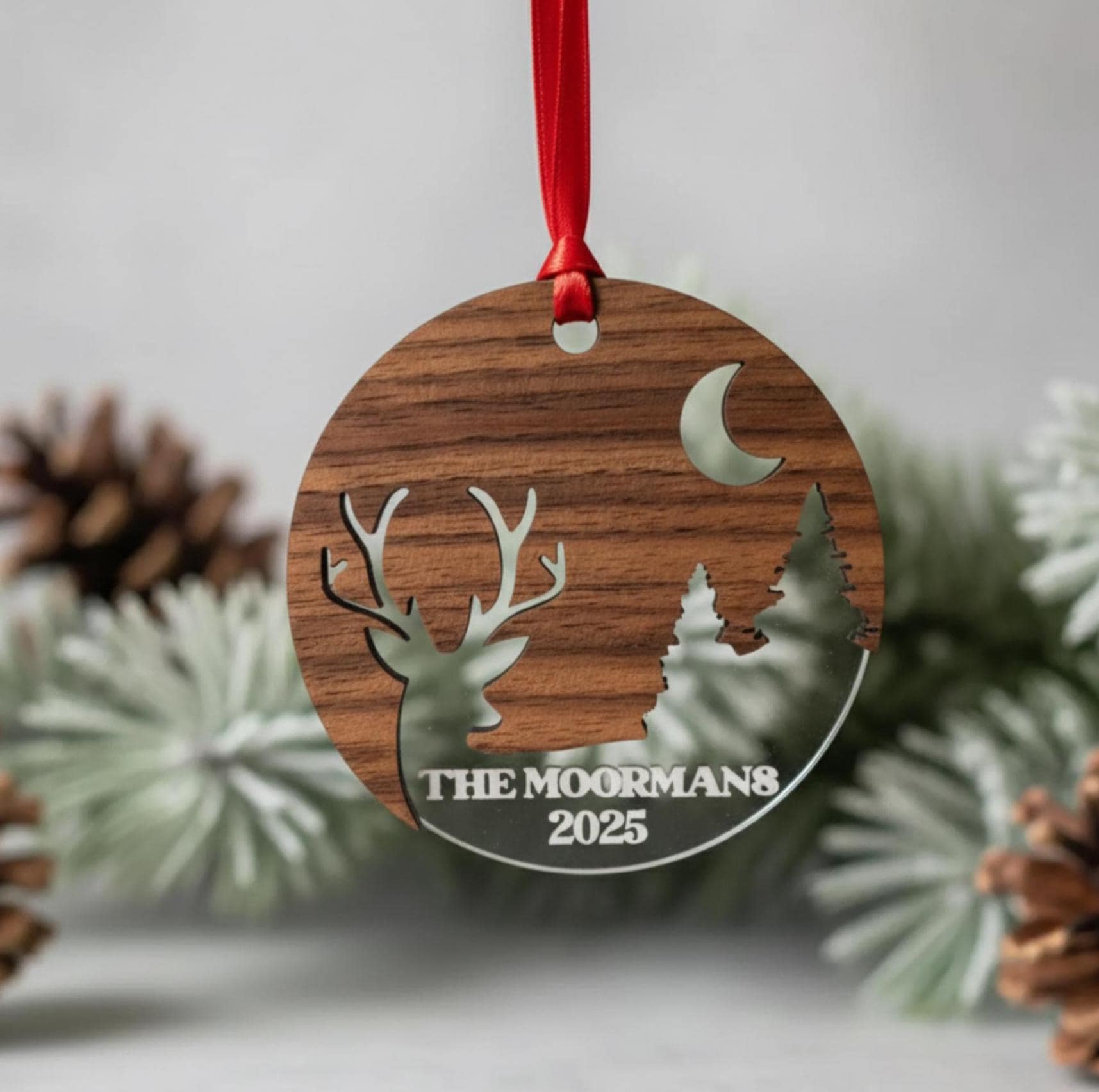 Elevate your holiday décor with our 3″-diameter walnut wood and clear plexiglass Christmas ornament, precision-laser engraved with your family’s names and a special date. The warm walnut grain paired with sparkling plexiglass creates a striking two-layer effect that looks beautiful hanging on any tree, wreath, or garland. Each piece is handcrafted to order, making it a timeless keepsake that celebrates family traditions and milestones year after year.