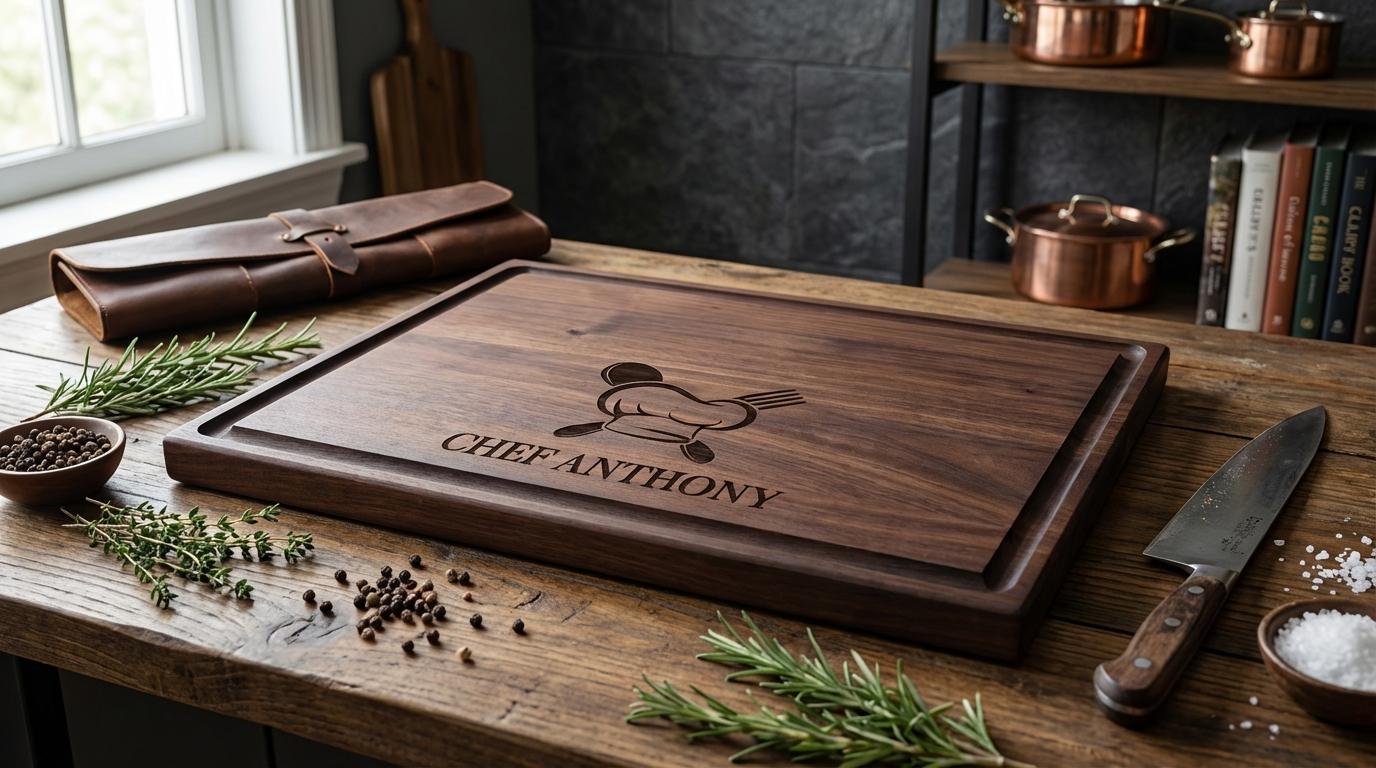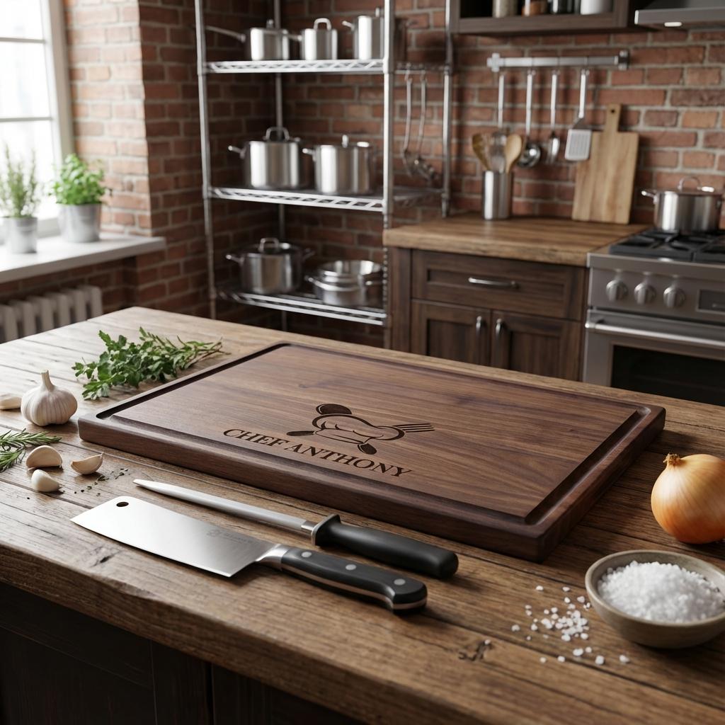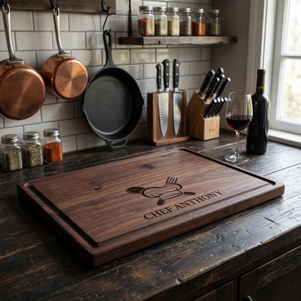 Personalized Charcuterie Board: Chef Hat Engraved Cutting Board, Walnut Cherry Acacia