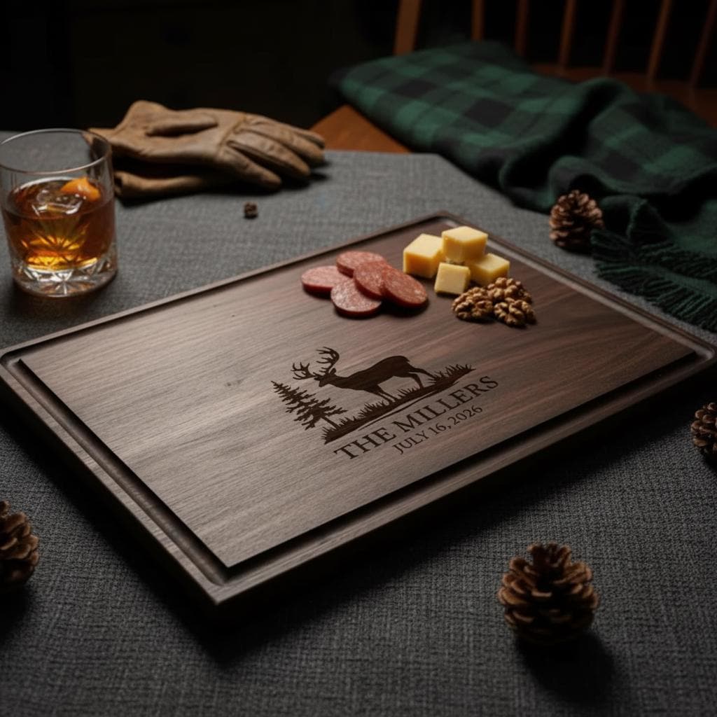 Engraved Elk & Pine Tree Cutting Board – Personalized Rustic Kitchen Board, Custom Xmas Wedding Housewarming Host Gift