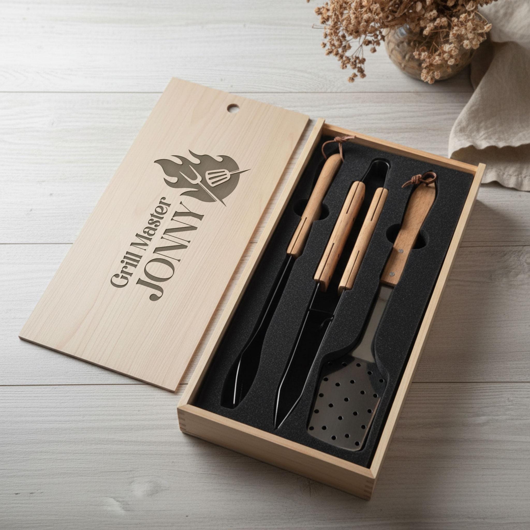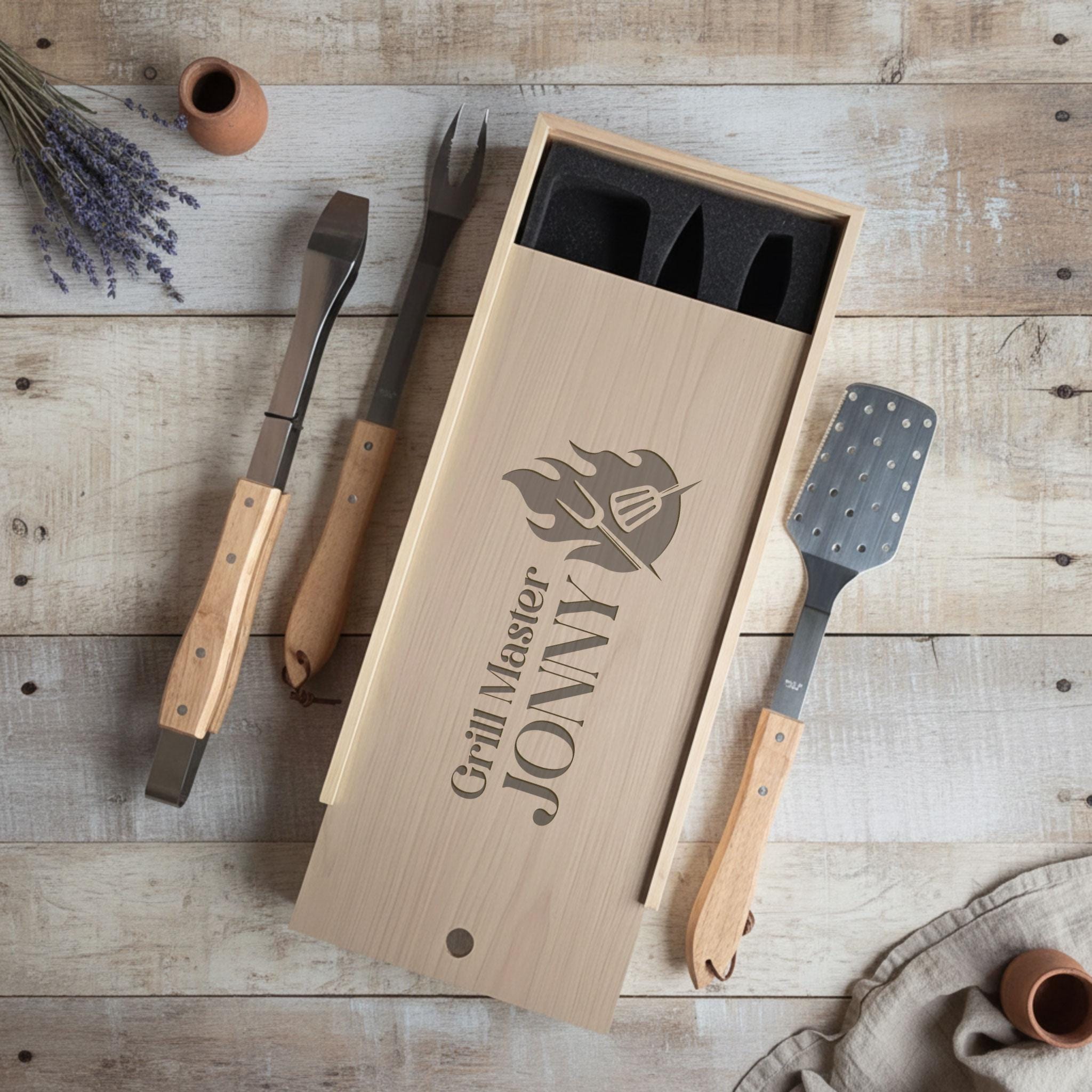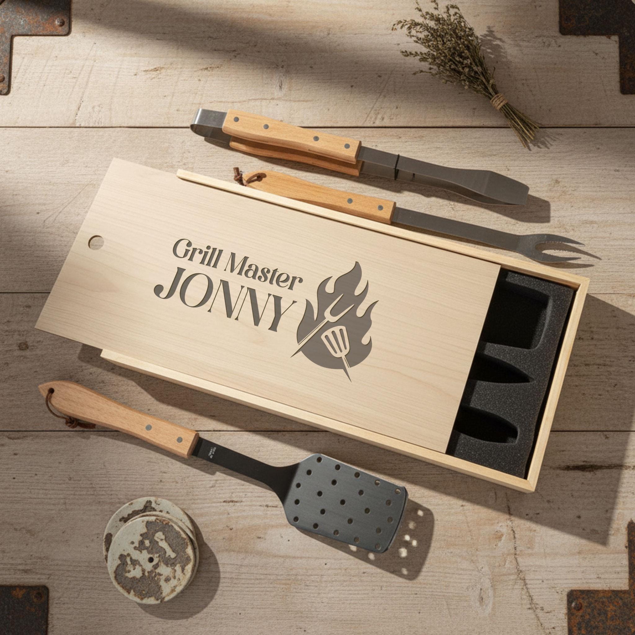 Personalized BBQ Grill Tool Set with Engraved Wooden Case | Custom Grill Master Gift for Him, Father's Day, Groomsmen