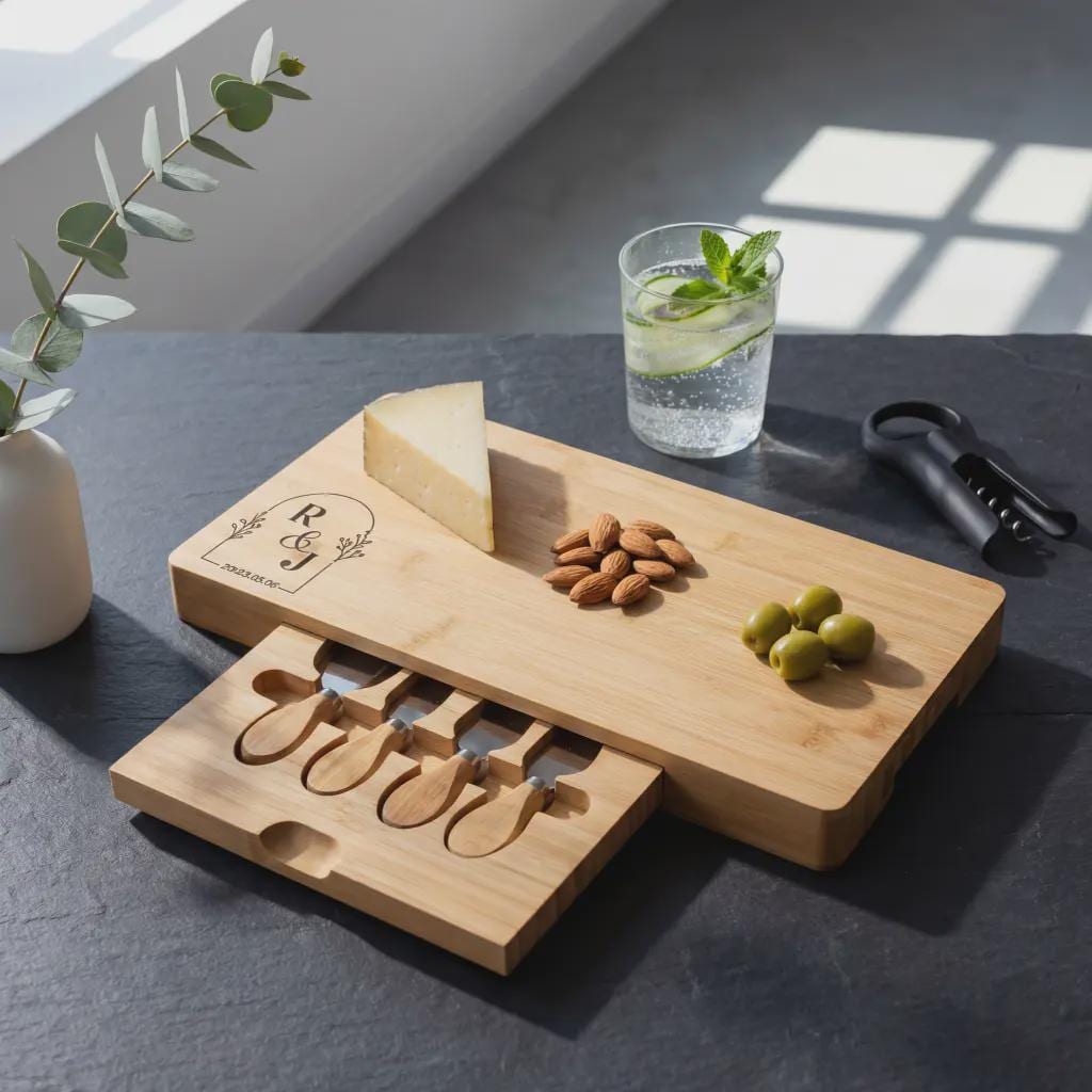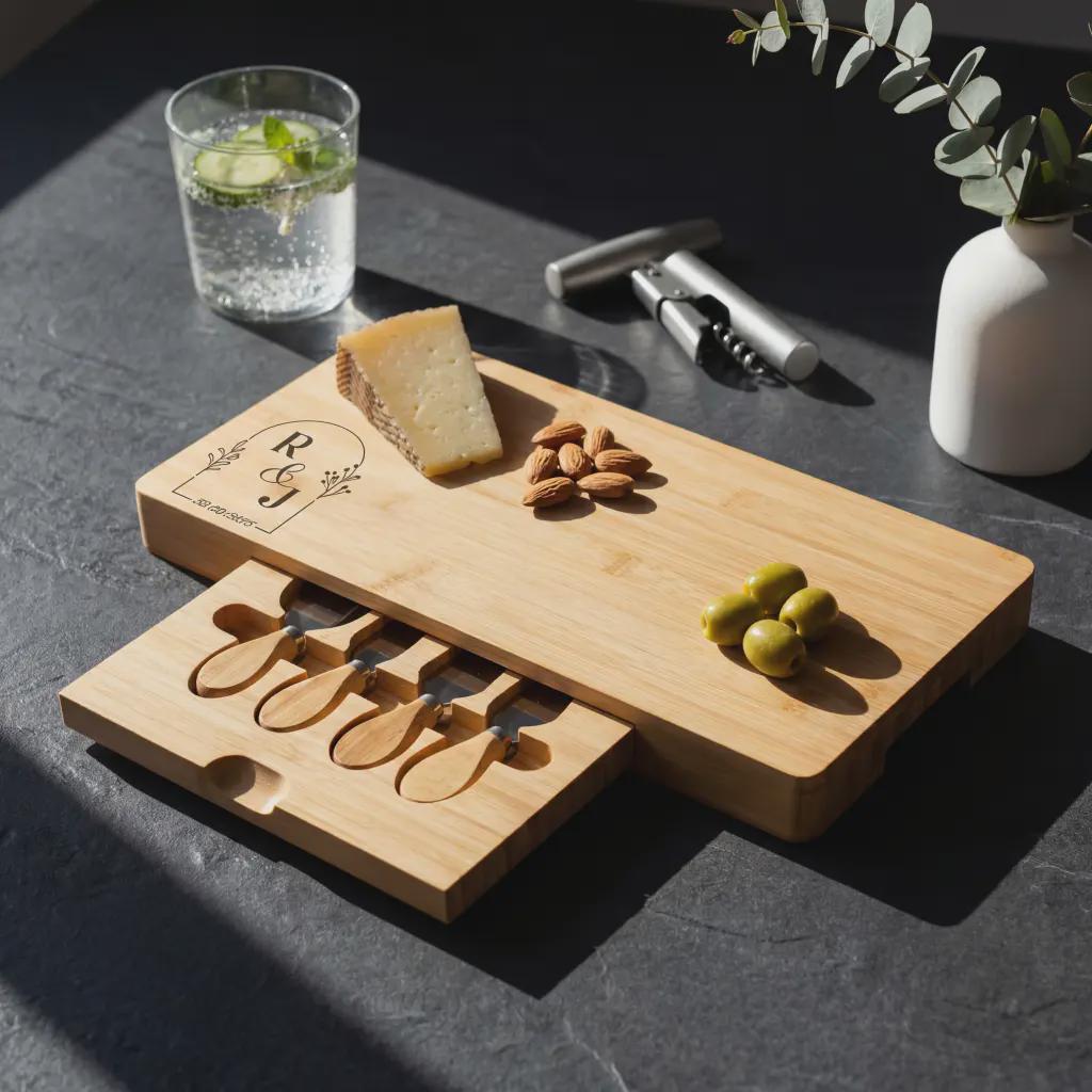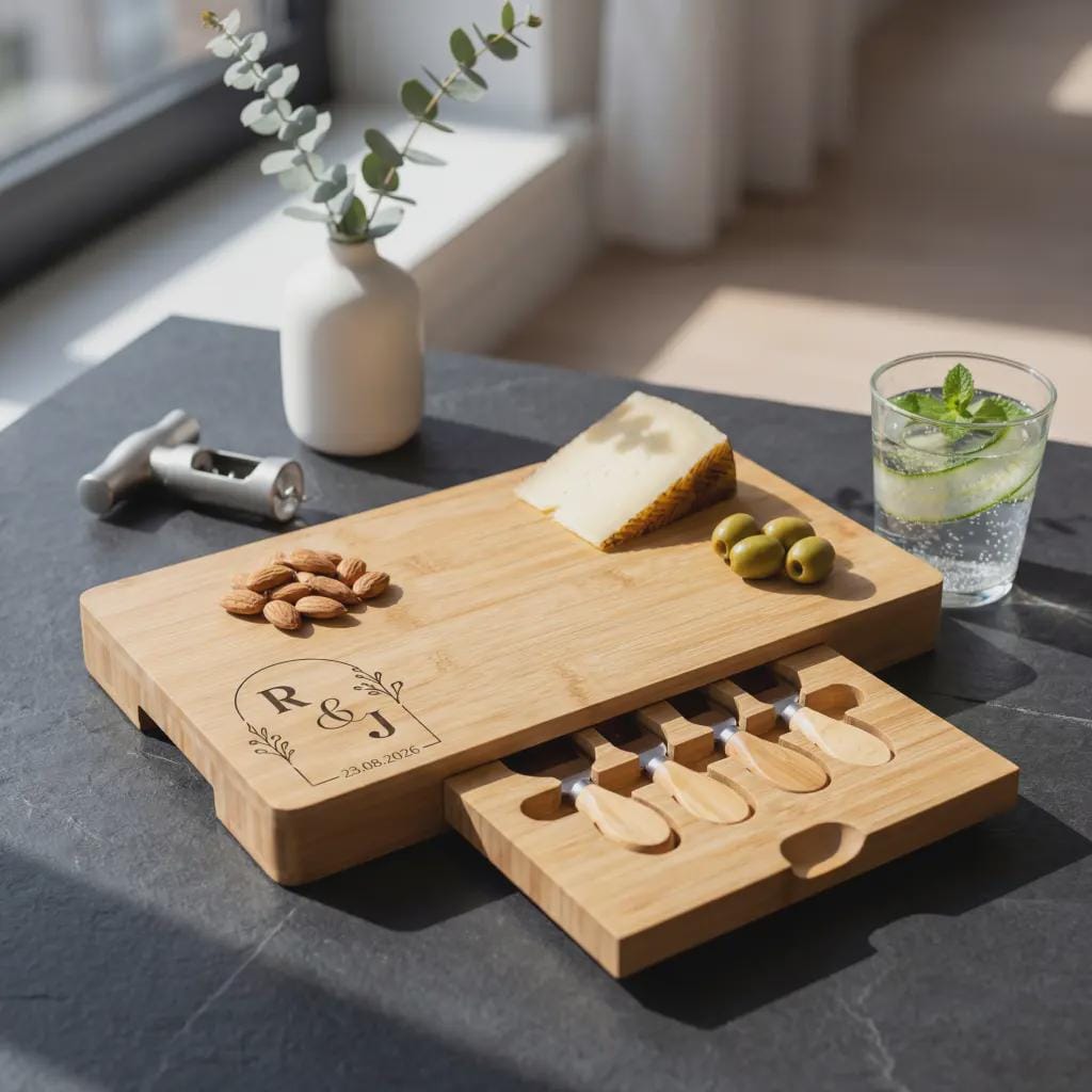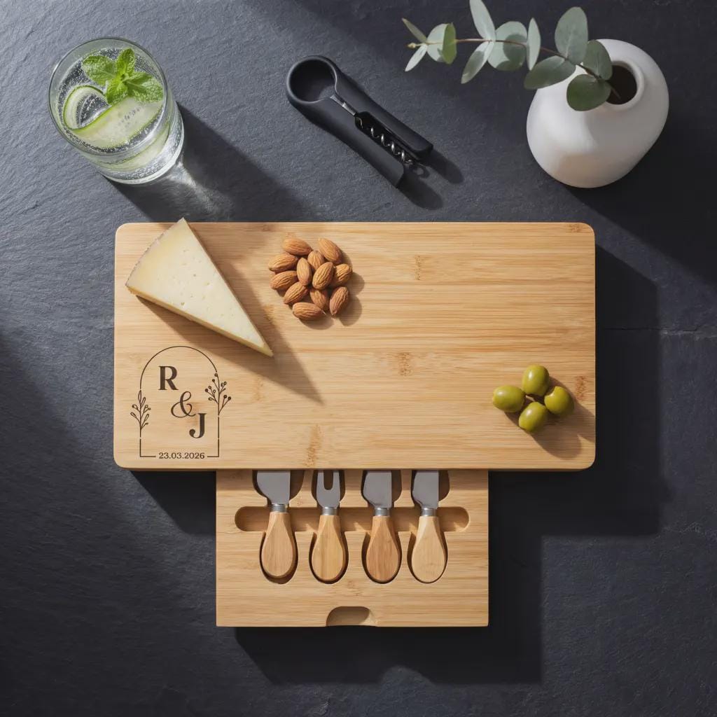 Elevate your hosting game with this premium personalized bamboo charcuterie board, a sophisticated and functional keepsake for weddings, anniversaries, or new home celebrations. Expertly engraved with your custom initials and a significant date, this elegant serving set features a clever slide-out drawer housing four professional stainless steel cheese tools. Crafted from sustainable, food-grade wood, it doubles as a stunning centerpiece for wine and cheese nights, making it a thoughtful 5th-anniversary surprise or a unique bridal shower present that will be cherished for years to come.