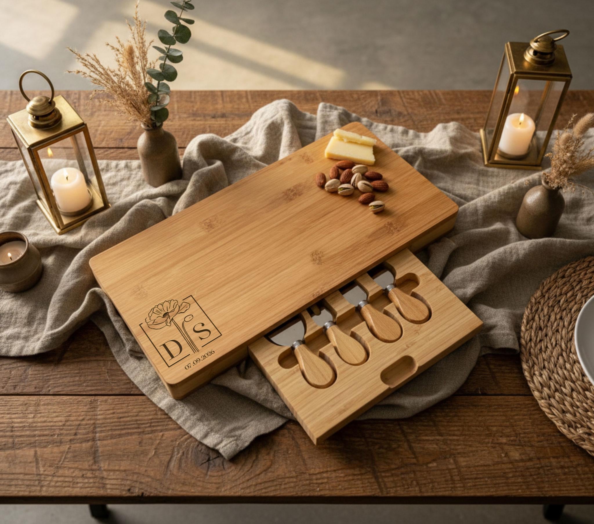 These personalized charcuterie boards are a perfect fusion of creativity and practicality, designed to elevate every celebration. Unleash your creativity and celebrate life’s special moments with our custom-engraved cheese board set. Crafted from eco-friendly materials, this personalized board serves as the perfect centerpiece for weddings, bridal showers, engagements, housewarmings, and everyday entertaining.
