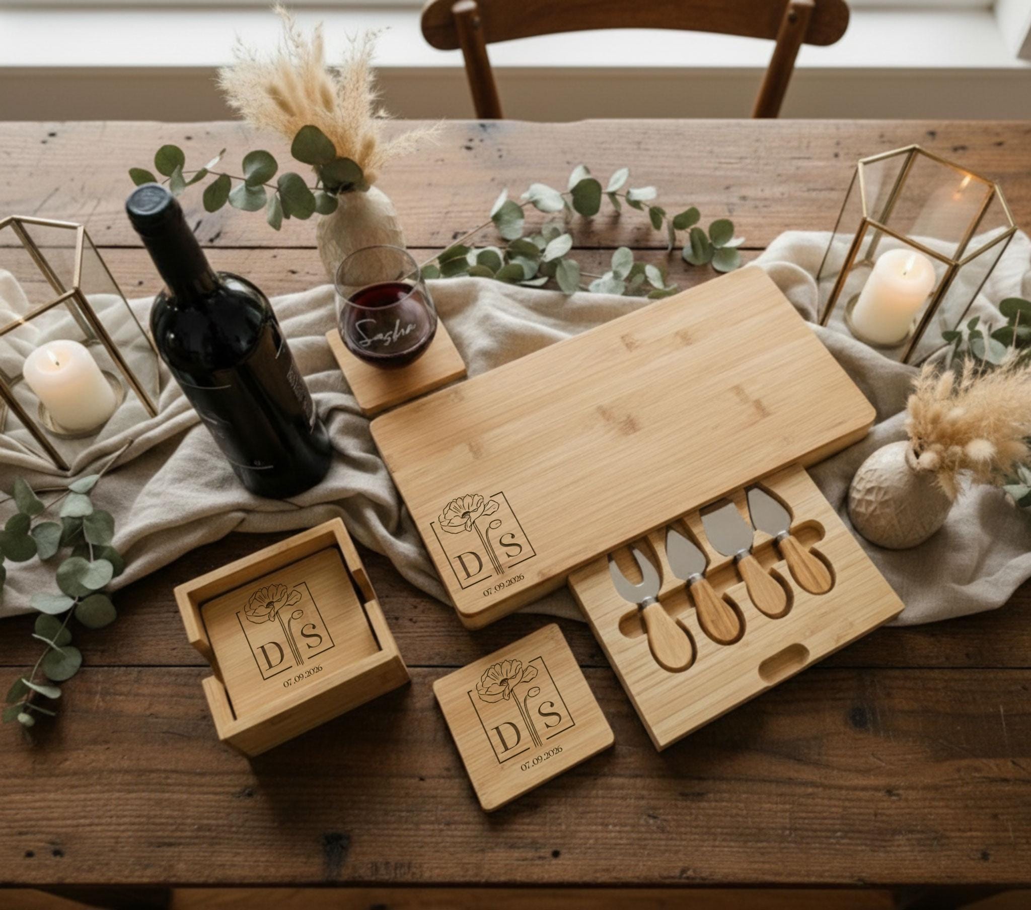 Pair the personalized board with the matching coaster set for a complete, sophisticated presentation.