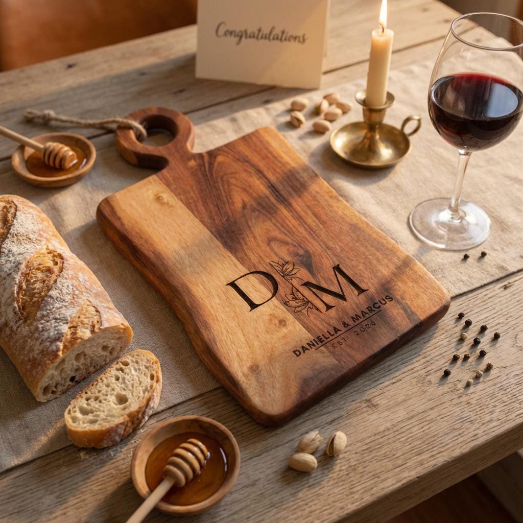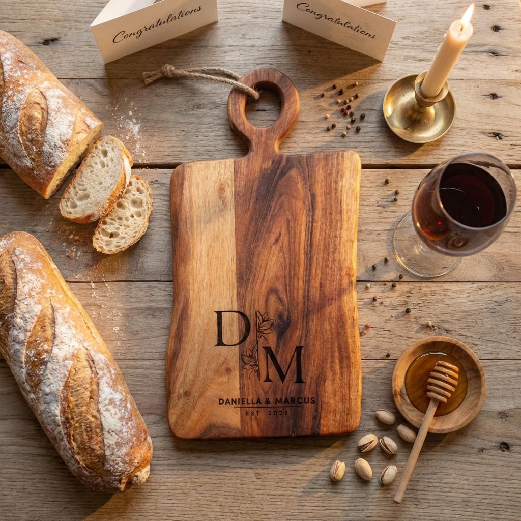 Personalized Monogram Live Edge Cutting Board, Custom Engraved Wood Serving Tray with Handle