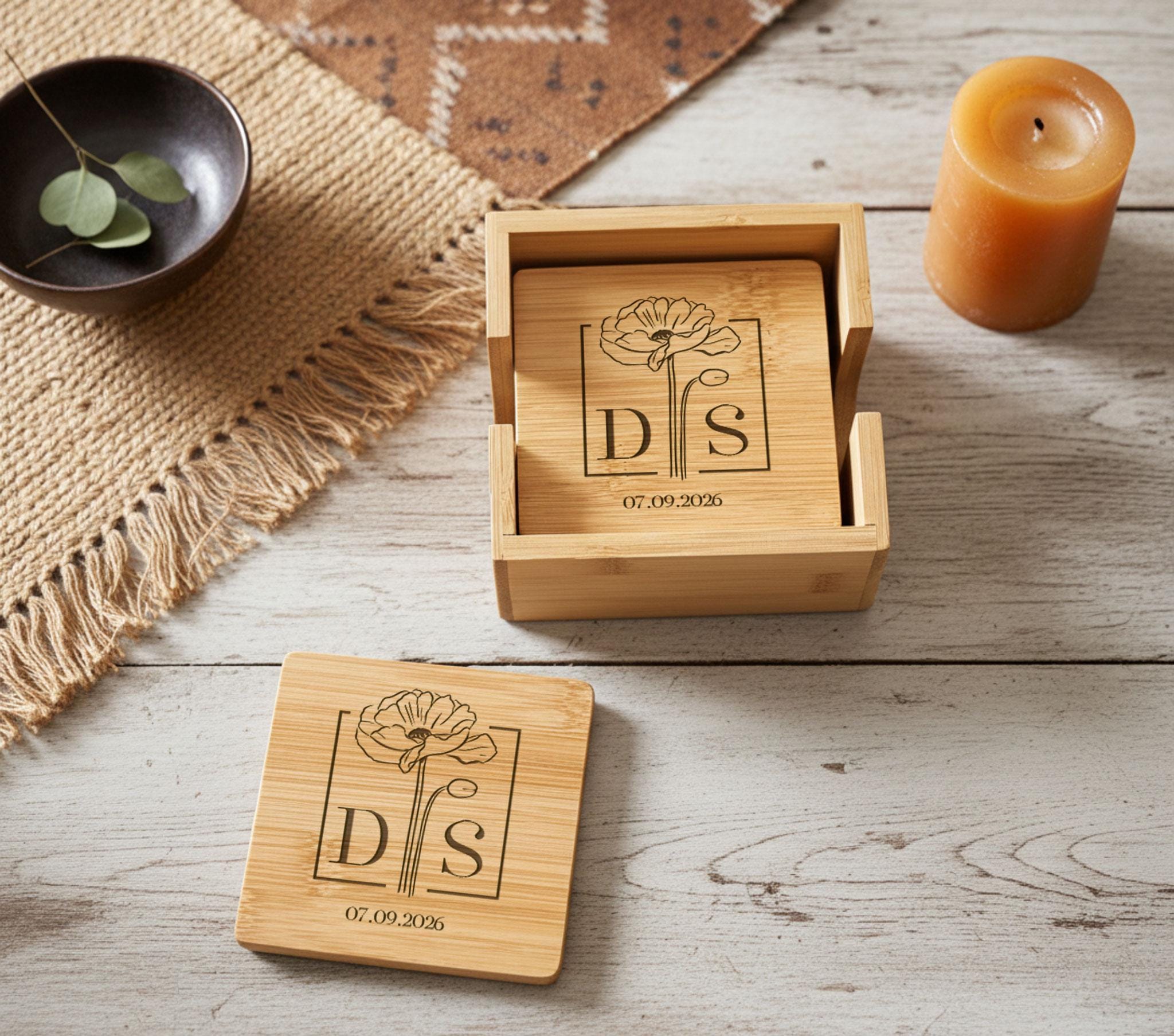 Sustainable elegance meets everyday function. Our custom engraved bamboo coaster set includes five 4" × 4" coasters and a matching holder, each laser-engraved for crisp, permanent detail. Crafted from renewable bamboo, this monogrammed coaster set protects surfaces while adding a warm, personalized accent to any living room or dining space.