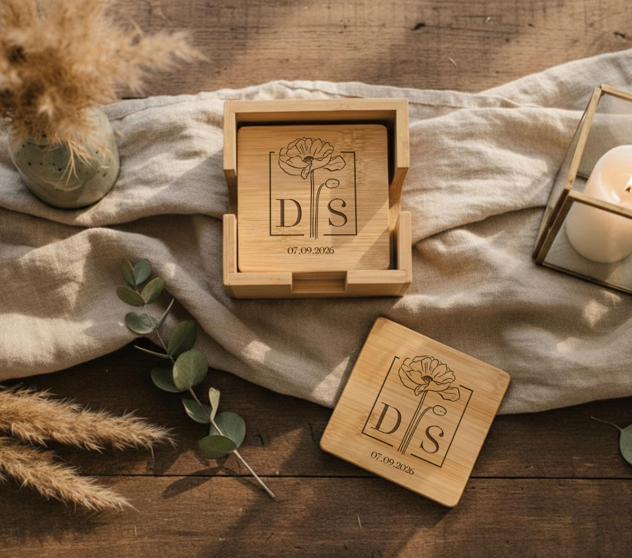 Personalized Bamboo Coasters with Holder - Custom Engraved 5-Piece Set: Monogram Gift for Couples, Housewarming, Wedding, Christmas