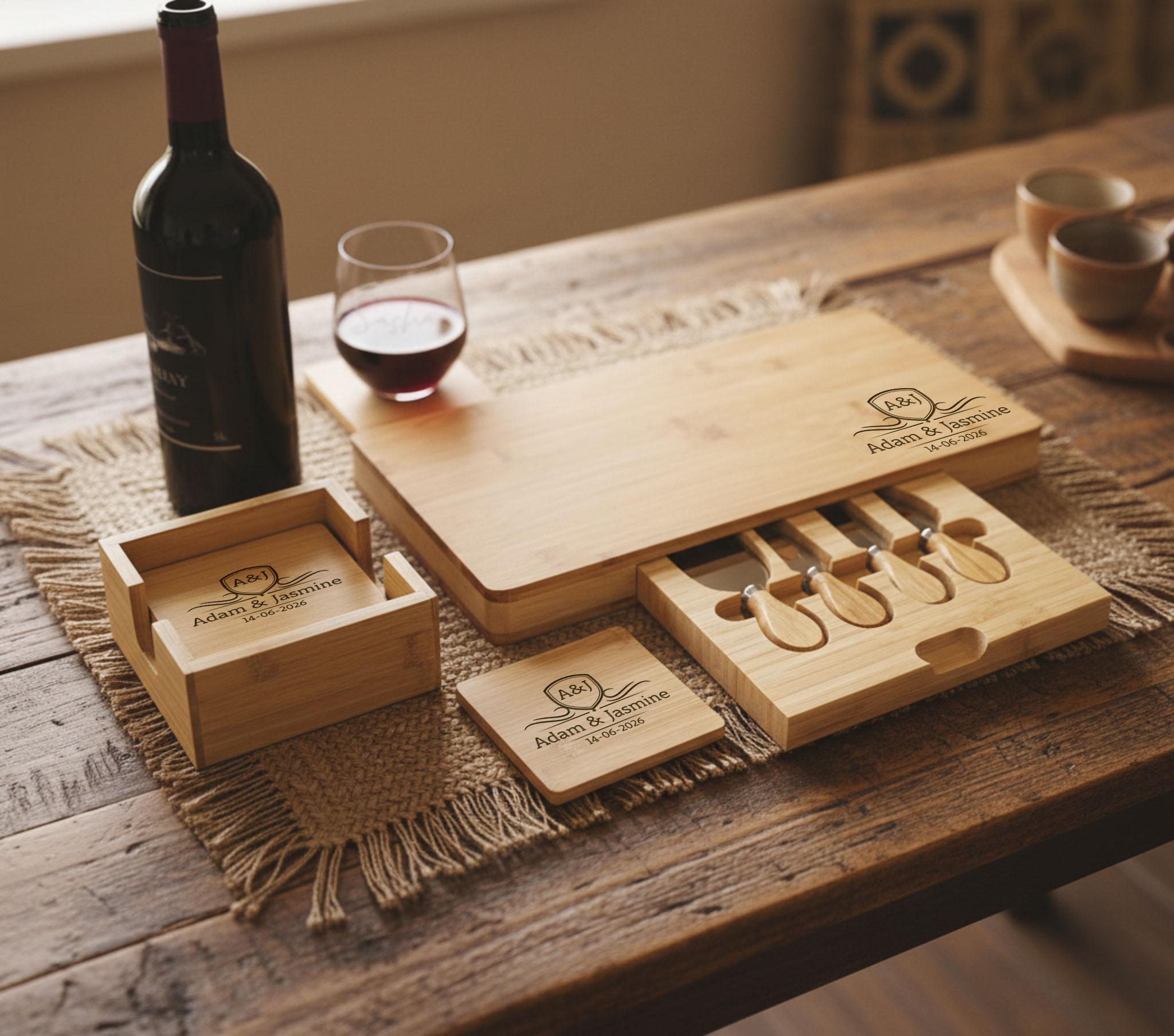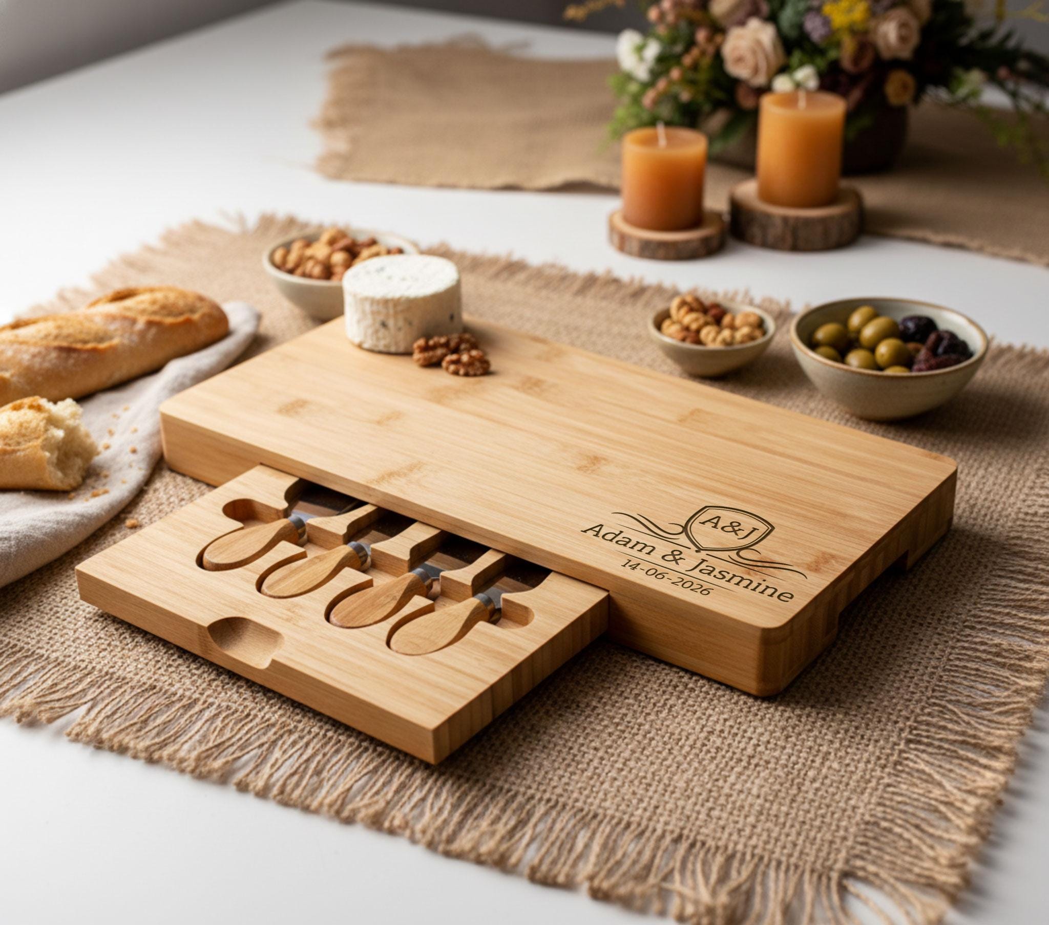 These personalized charcuterie boards are a perfect fusion of creativity and practicality, designed to elevate every celebration. Unleash your creativity and celebrate life’s special moments with our custom-engraved cheese board set. Crafted from eco-friendly materials, this personalized board serves as the perfect centerpiece for weddings, bridal showers, engagements, housewarmings, and everyday entertaining.