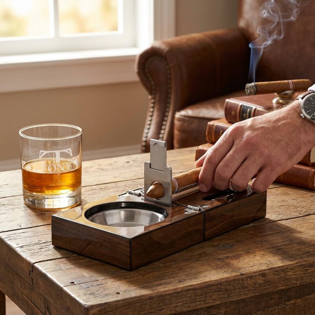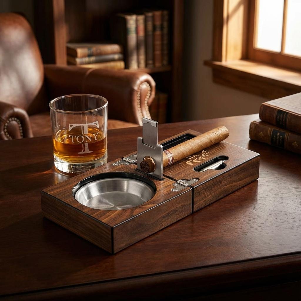 Upgrade any cigar ritual with a handcrafted personalized cigar ashtray set that’s both elegant and travel-ready. Choose between the compact folding ashtray box with all stainless steel tools, or the deluxe humidor set for cigar preservation and presentation.