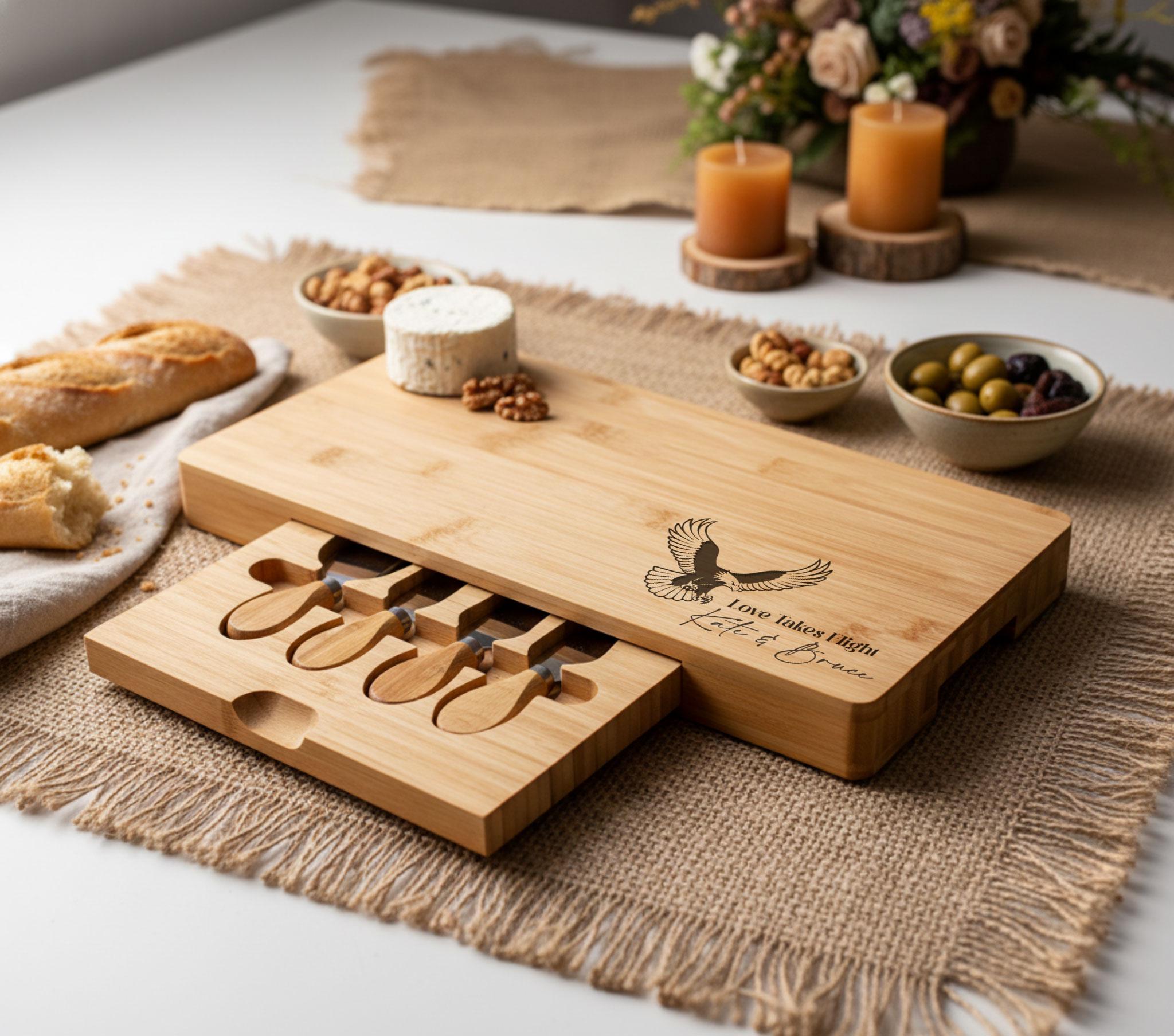 Personalized Charcuterie Board: Custom Engraved Eangle Bamboo Cheese Board For Couples - Housewarming and Wedding Gift