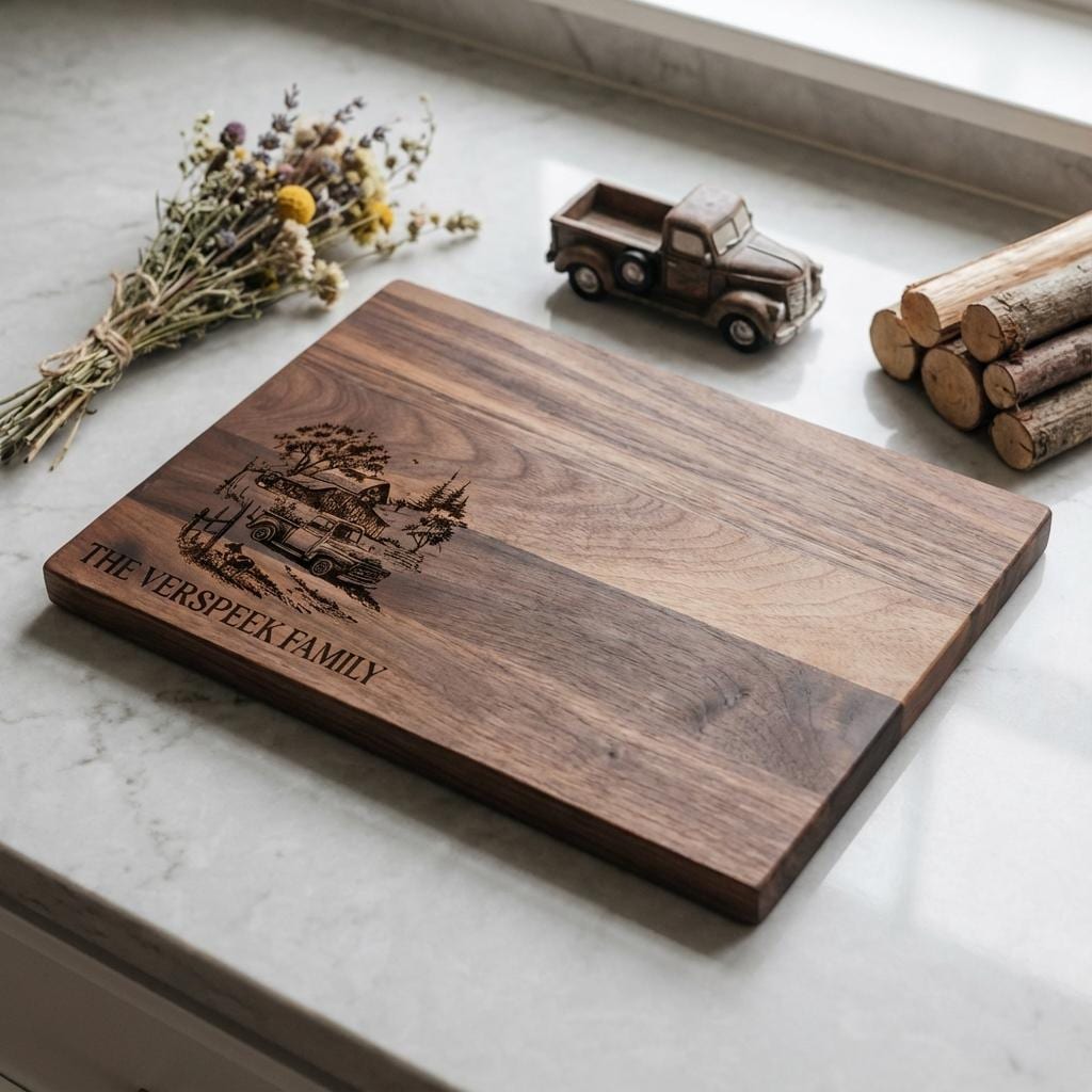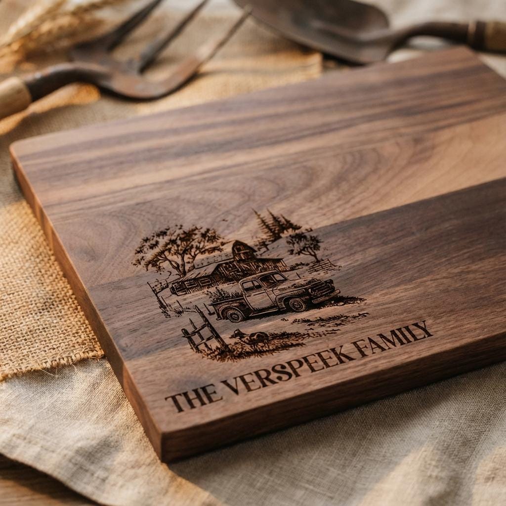 Honor the family legacy with this personalized farmhouse cutting board. Featuring a nostalgic vintage truck and barn engraving, this solid walnut charcuterie board is the ultimate ranch gift, farmer Christmas present, or homestead housewarming gift.