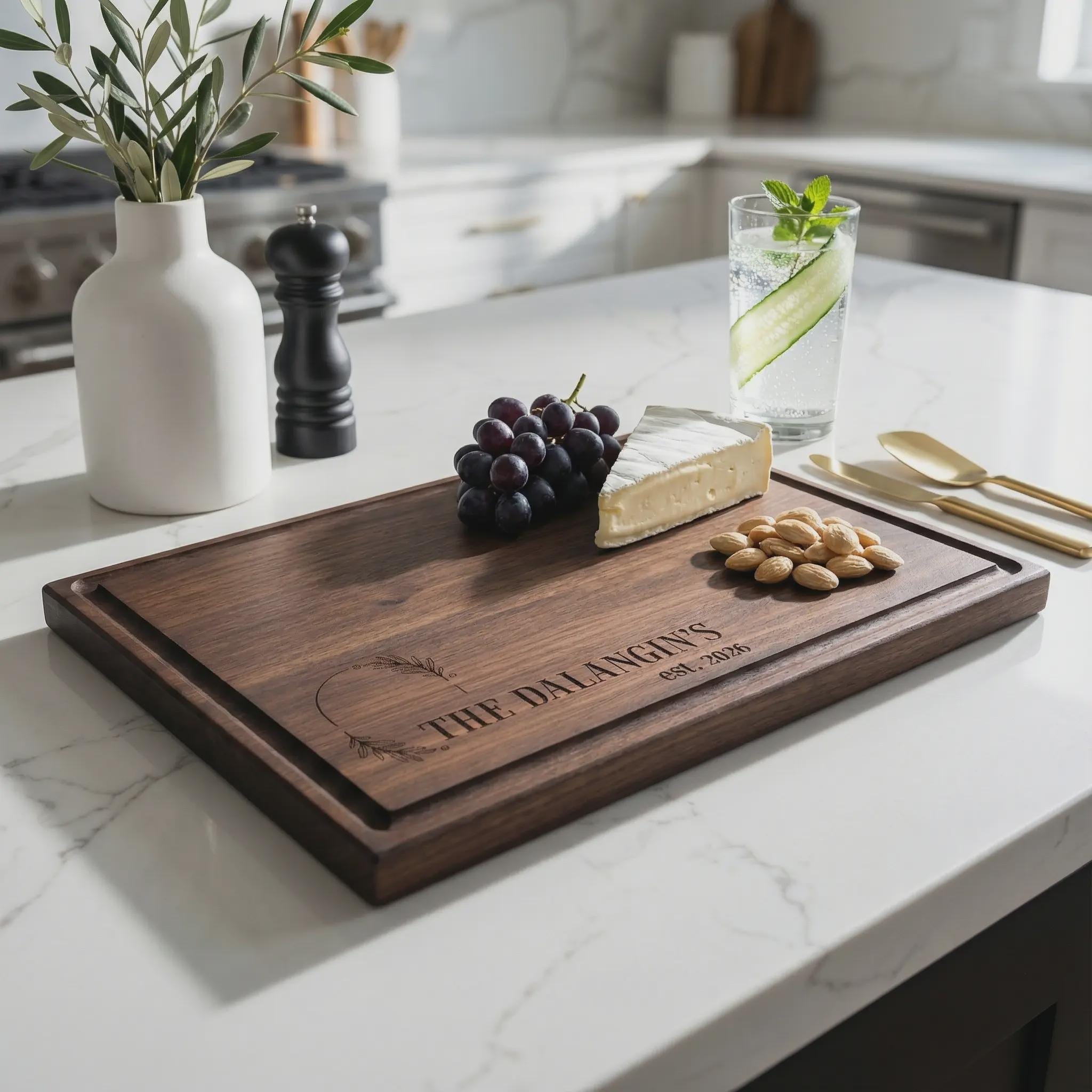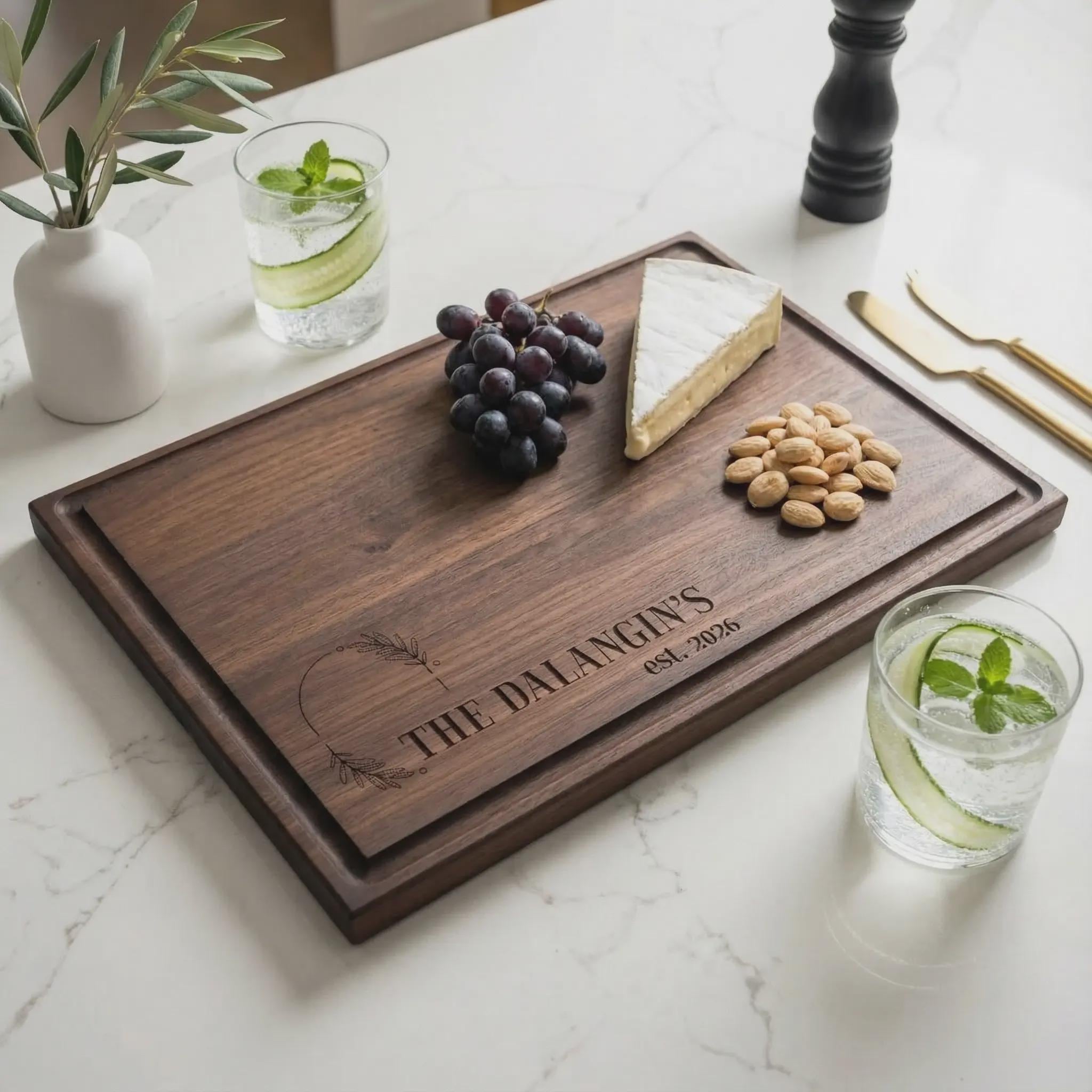 Celebrate their established date with this personalized family name cutting board. Crafted from rich walnut wood with a sleek botanical design and deep juice groove, this custom charcuterie platter is the ultimate wedding gift or housewarming keepsake.
