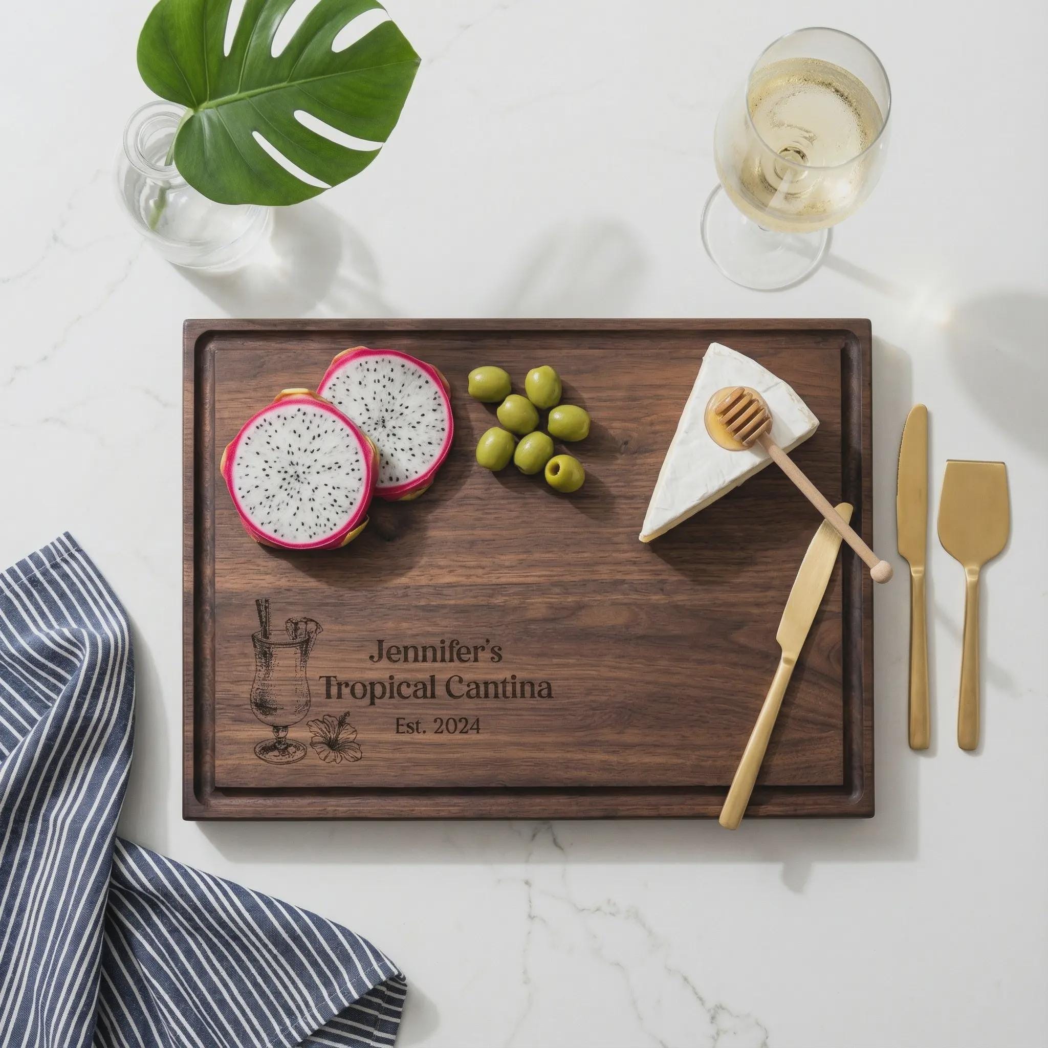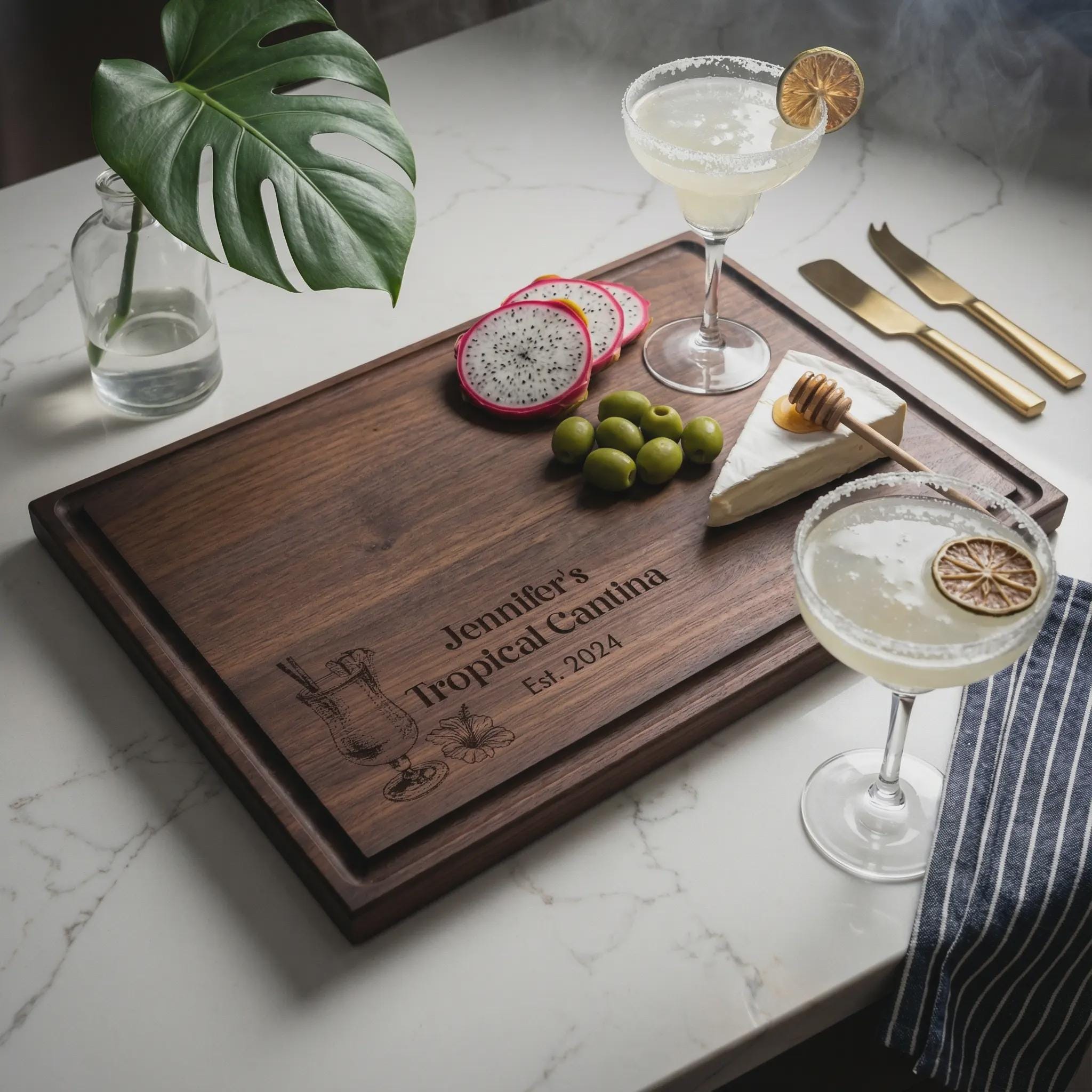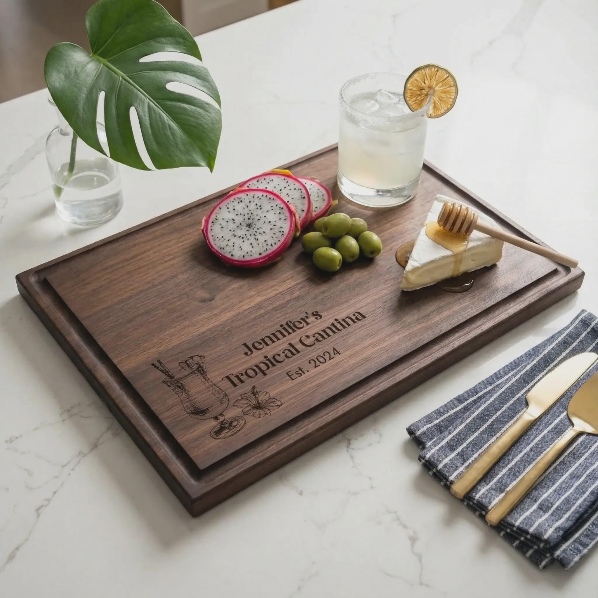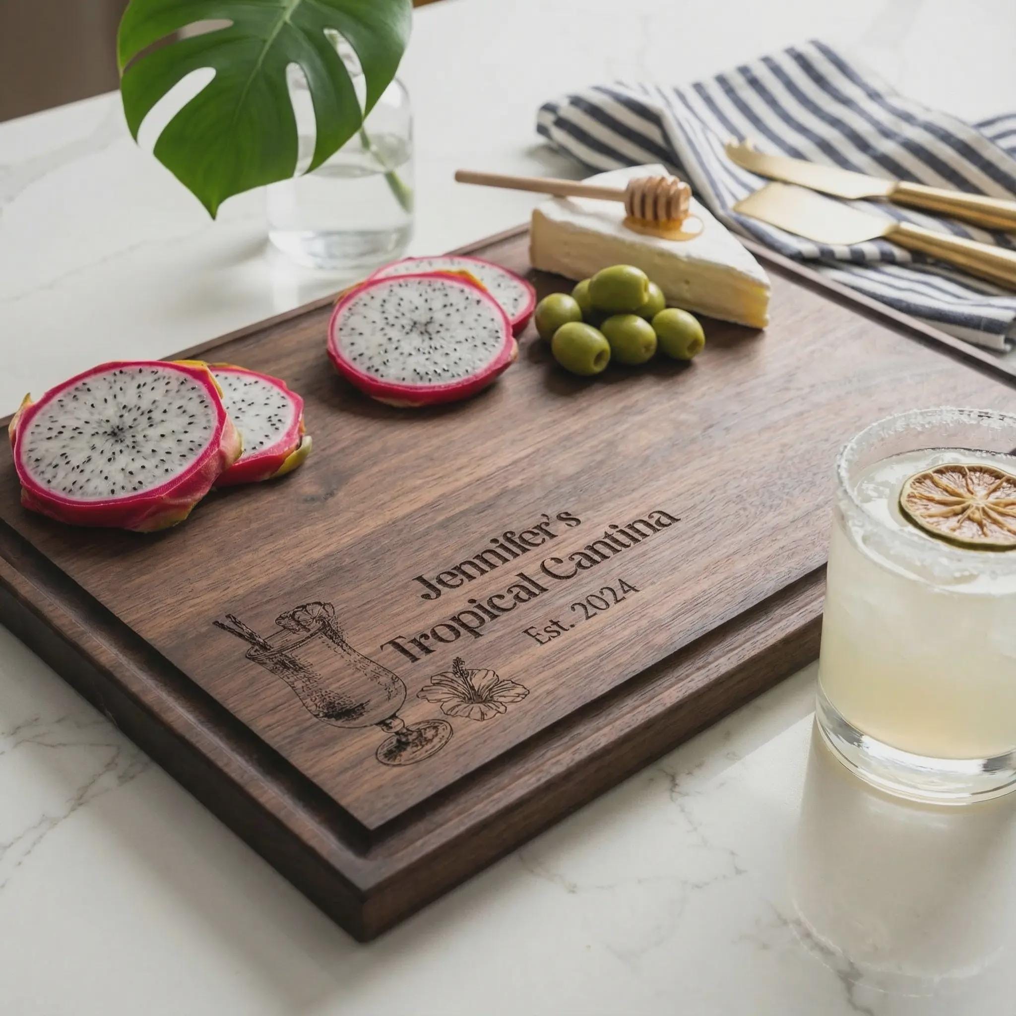 Featuring a custom 'Tropical Cantina' engraving and deep juice groove, this walnut garnish board is the ultimate tiki bar decor, destination wedding gift, or summer entertaining essential. Whether you are slicing limes for a margarita or serving appetizers on the patio, this board brings the island life to your kitchen.