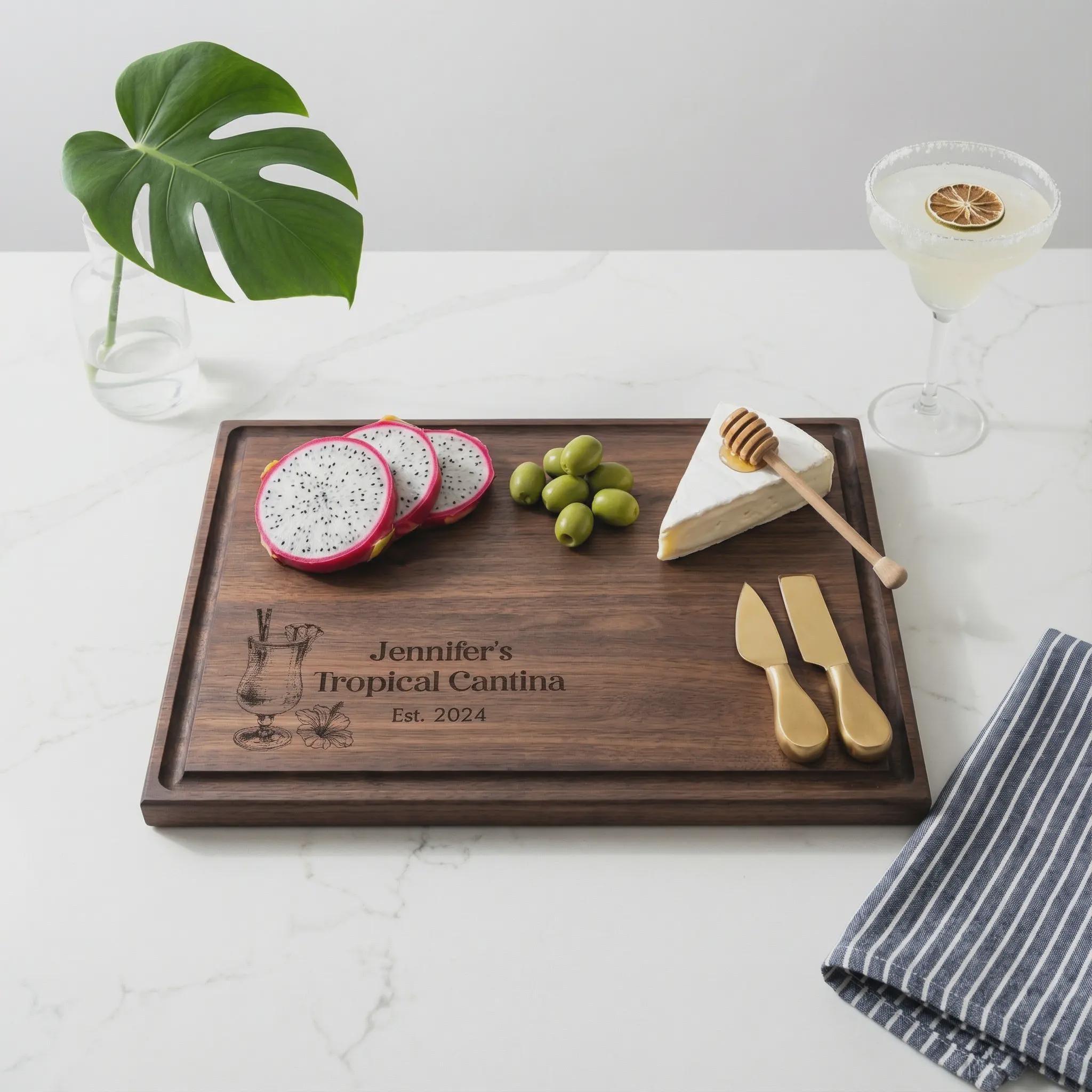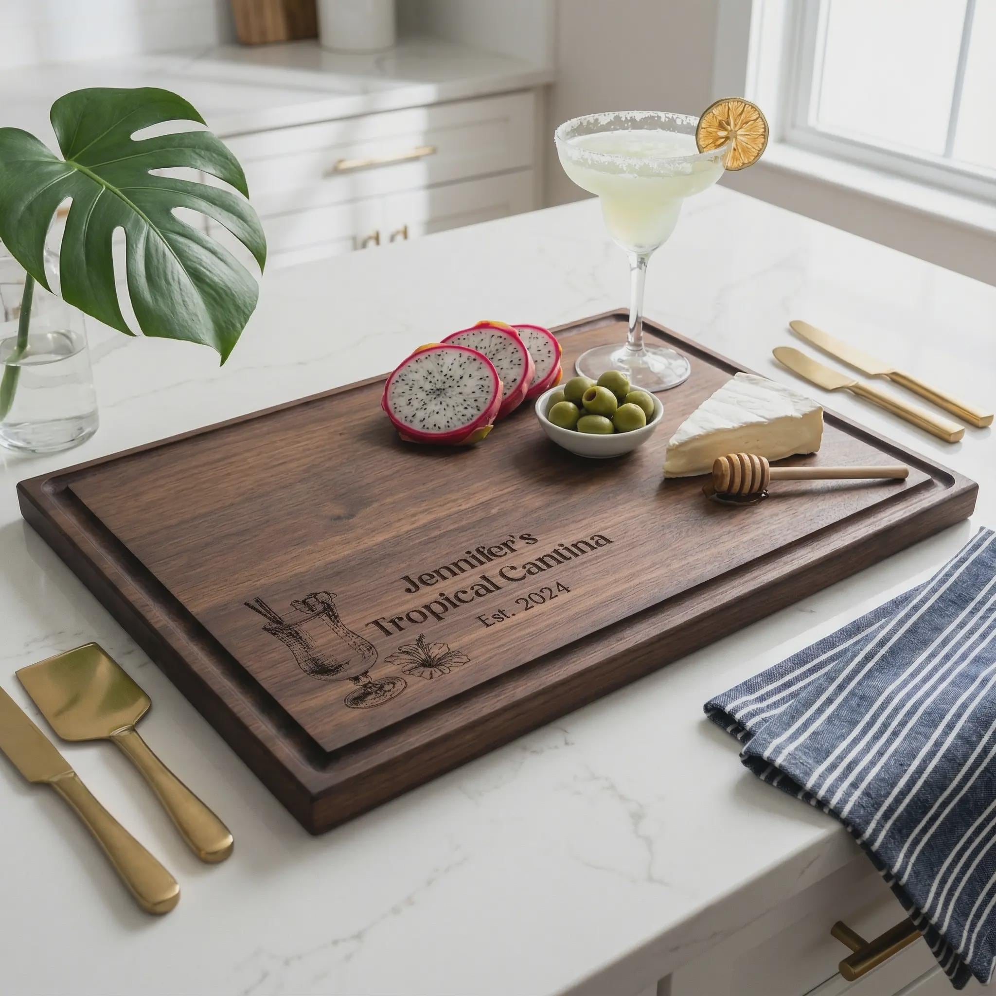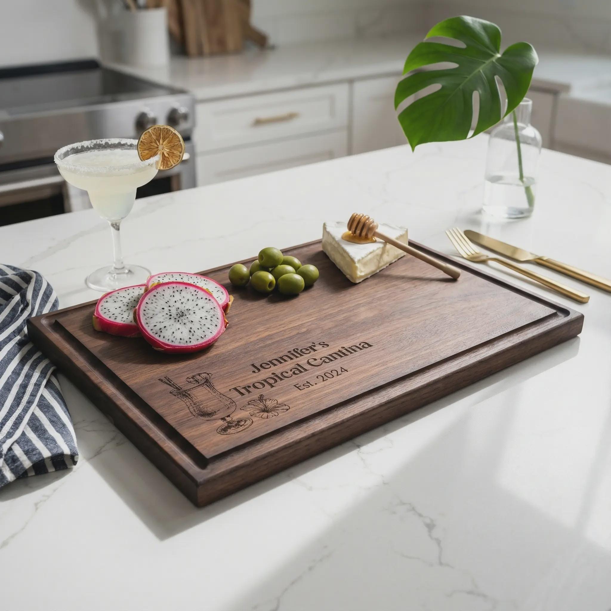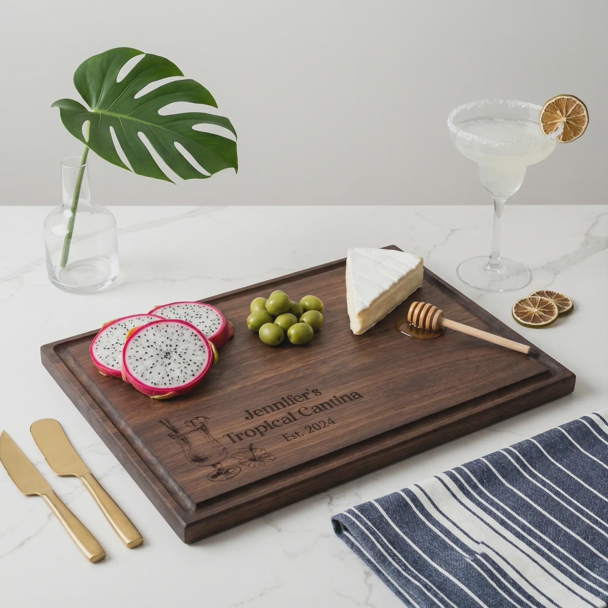 Featuring a custom 'Tropical Cantina' engraving and deep juice groove, this walnut garnish board is the ultimate tiki bar decor, destination wedding gift, or summer entertaining essential. Whether you are slicing limes for a margarita or serving appetizers on the patio, this board brings the island life to your kitchen.