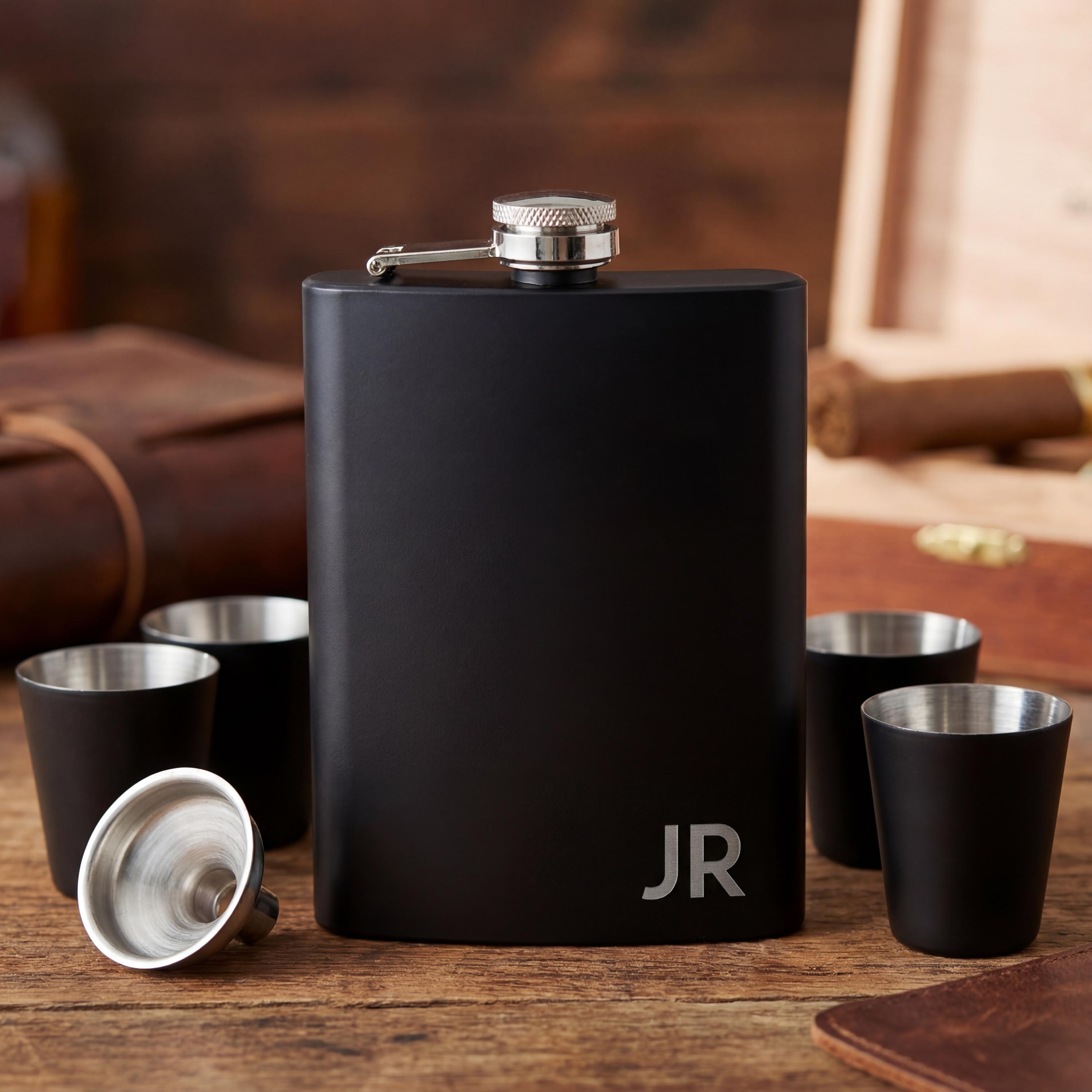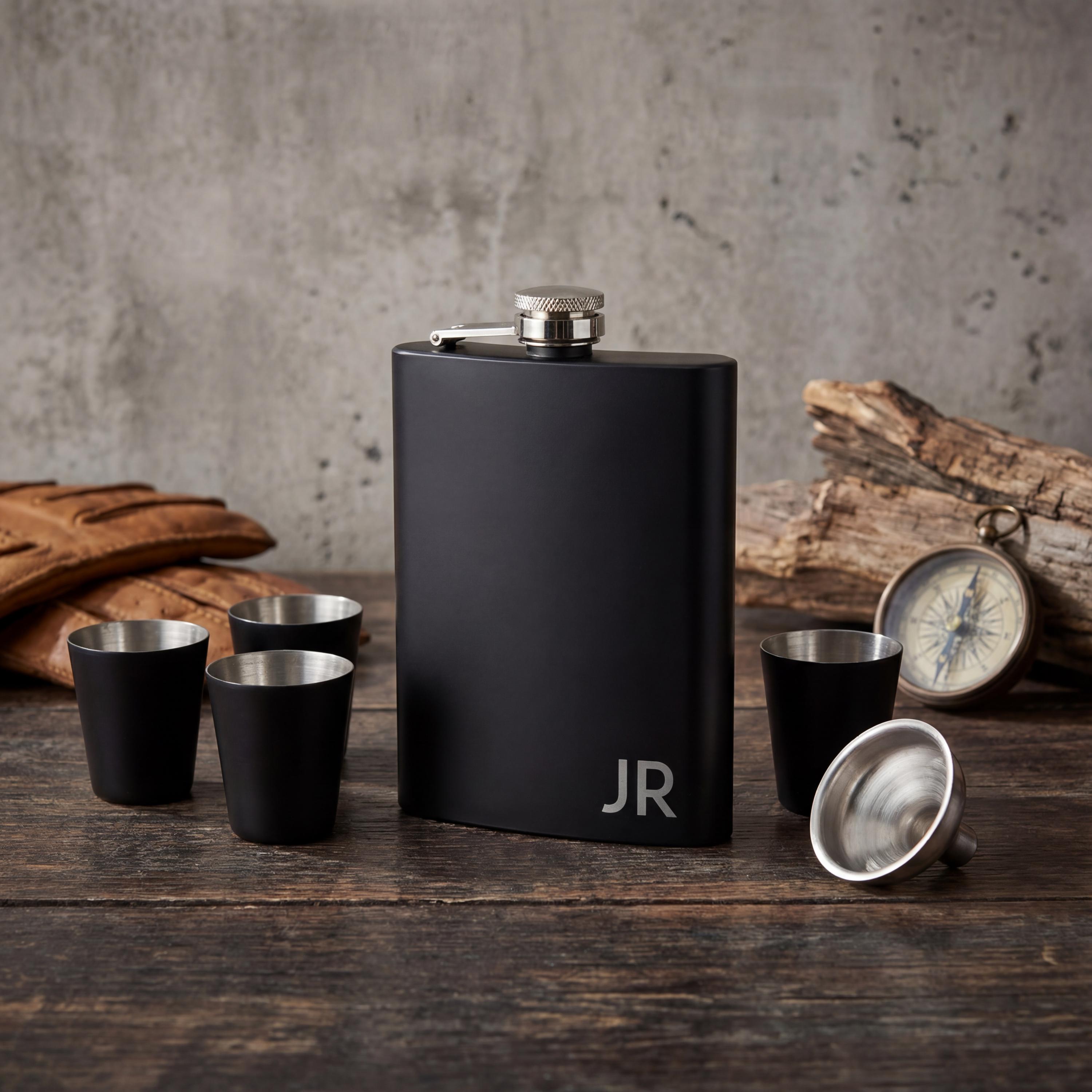 Share a toast in style with this Personalized Matte Black Flask Gift Set.