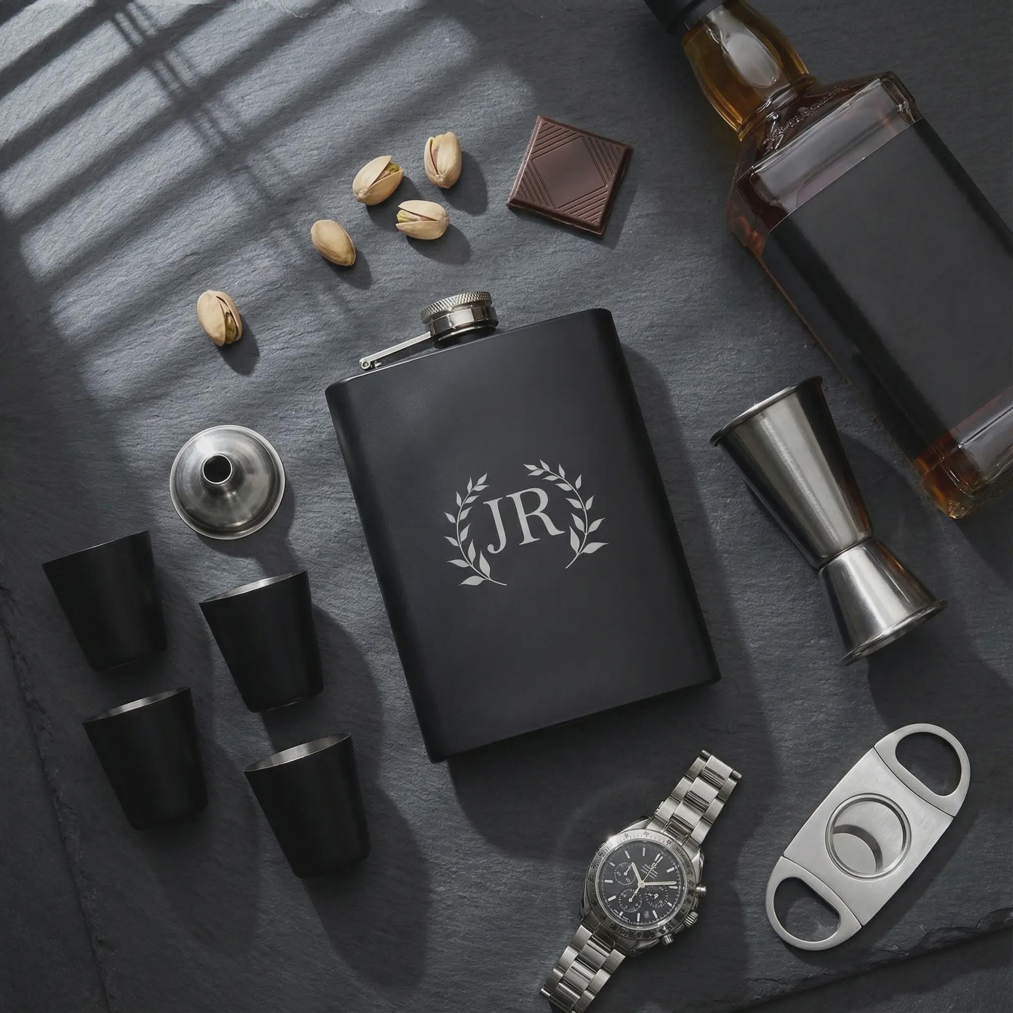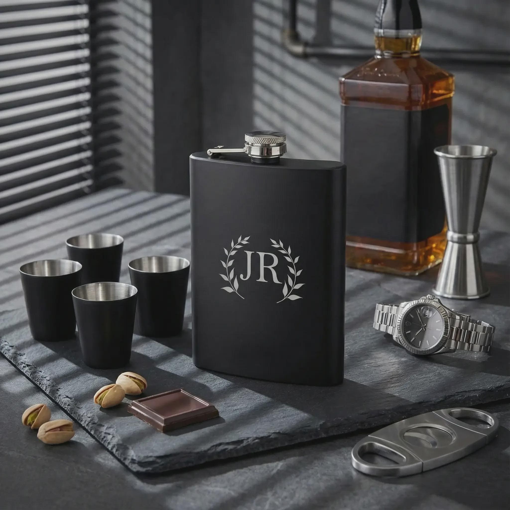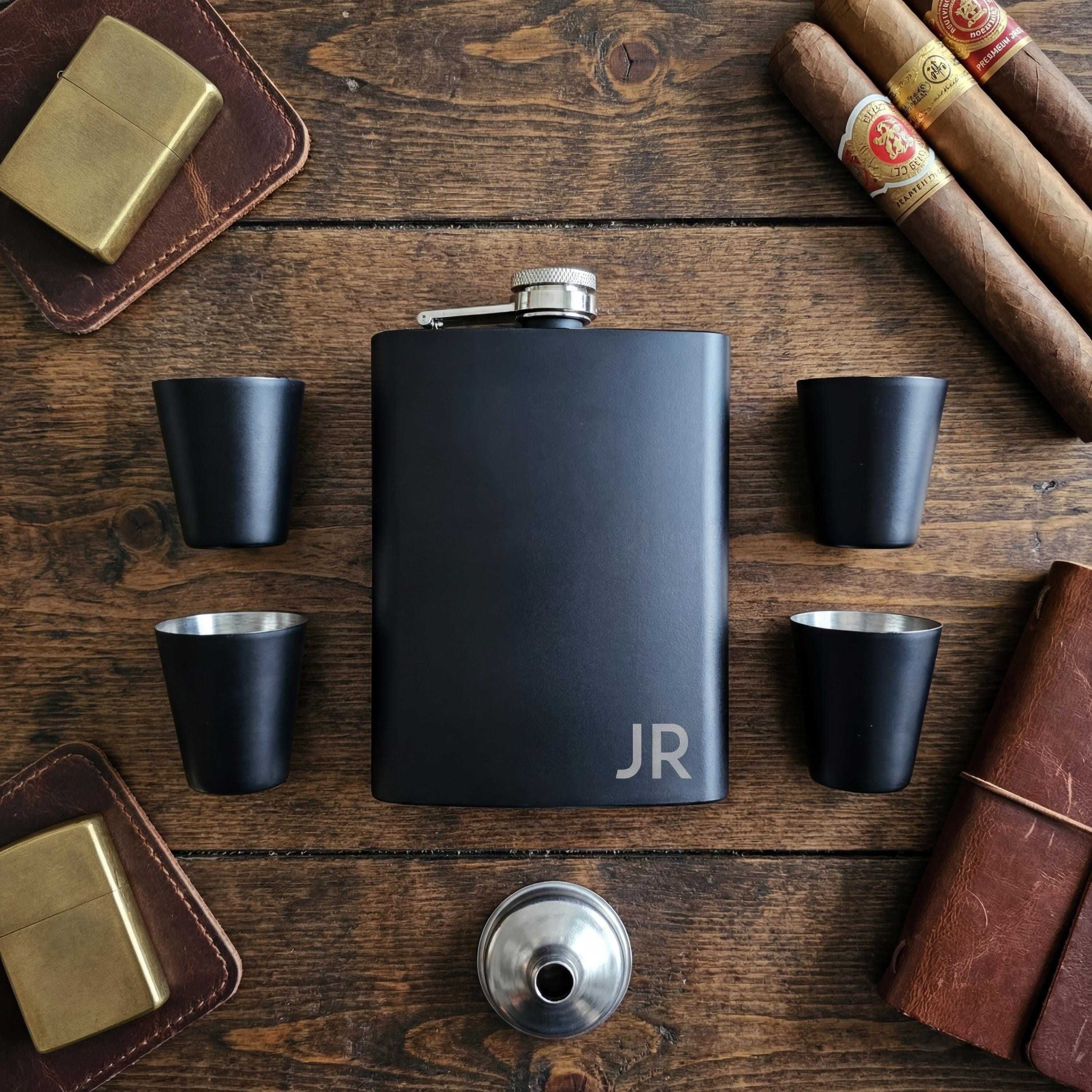 Groomsmen Gift Set | Personalized Flask & Custom Matte Black Whiskey Kit with 4 Shot Glasses