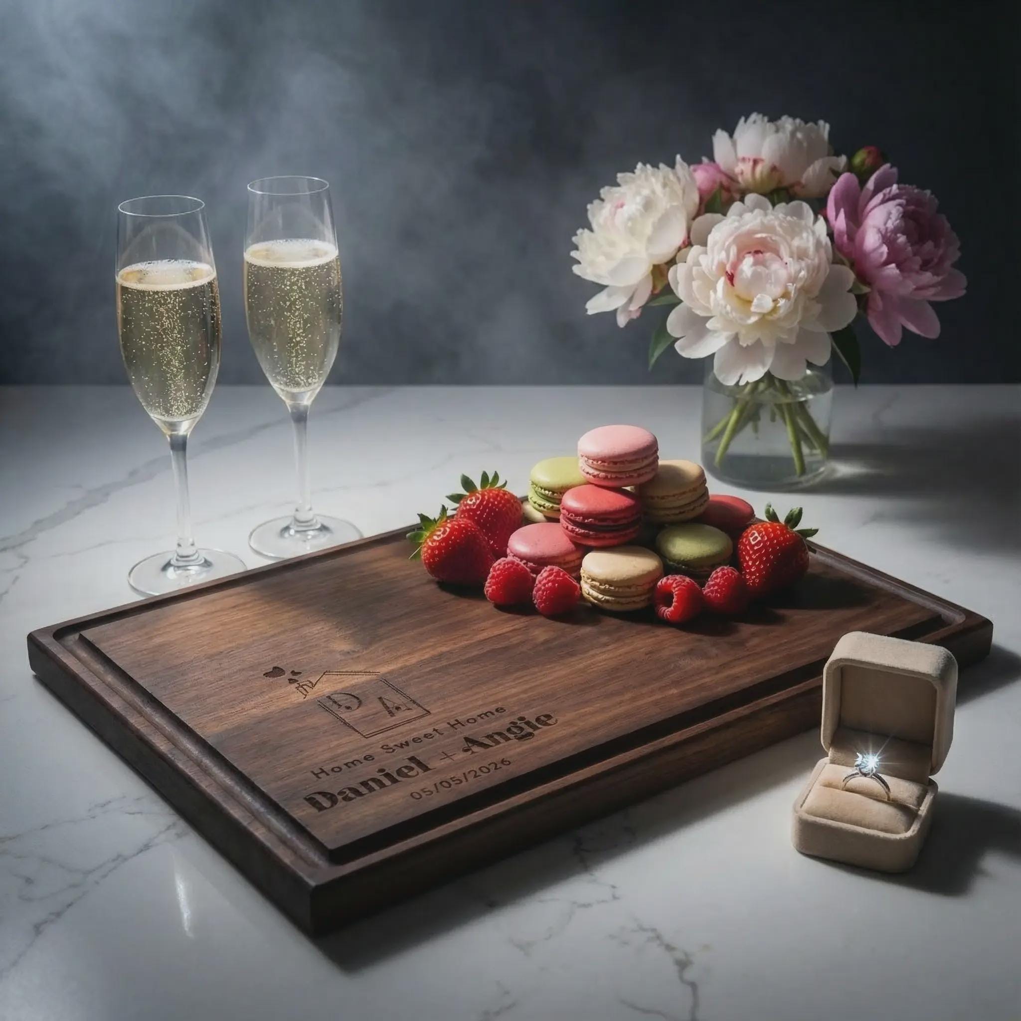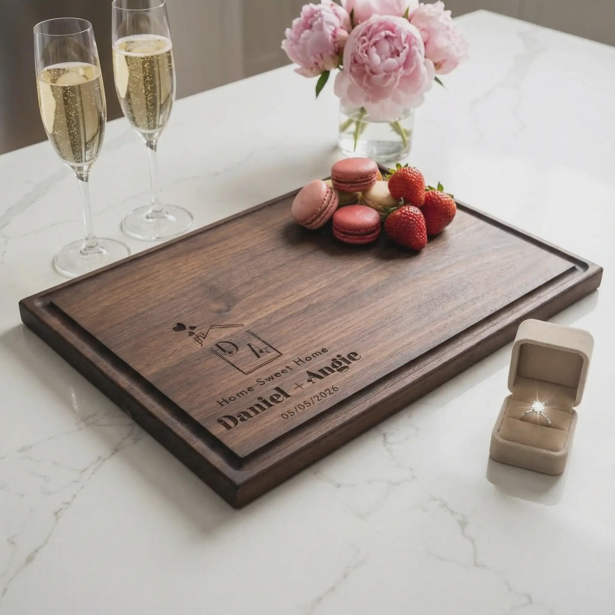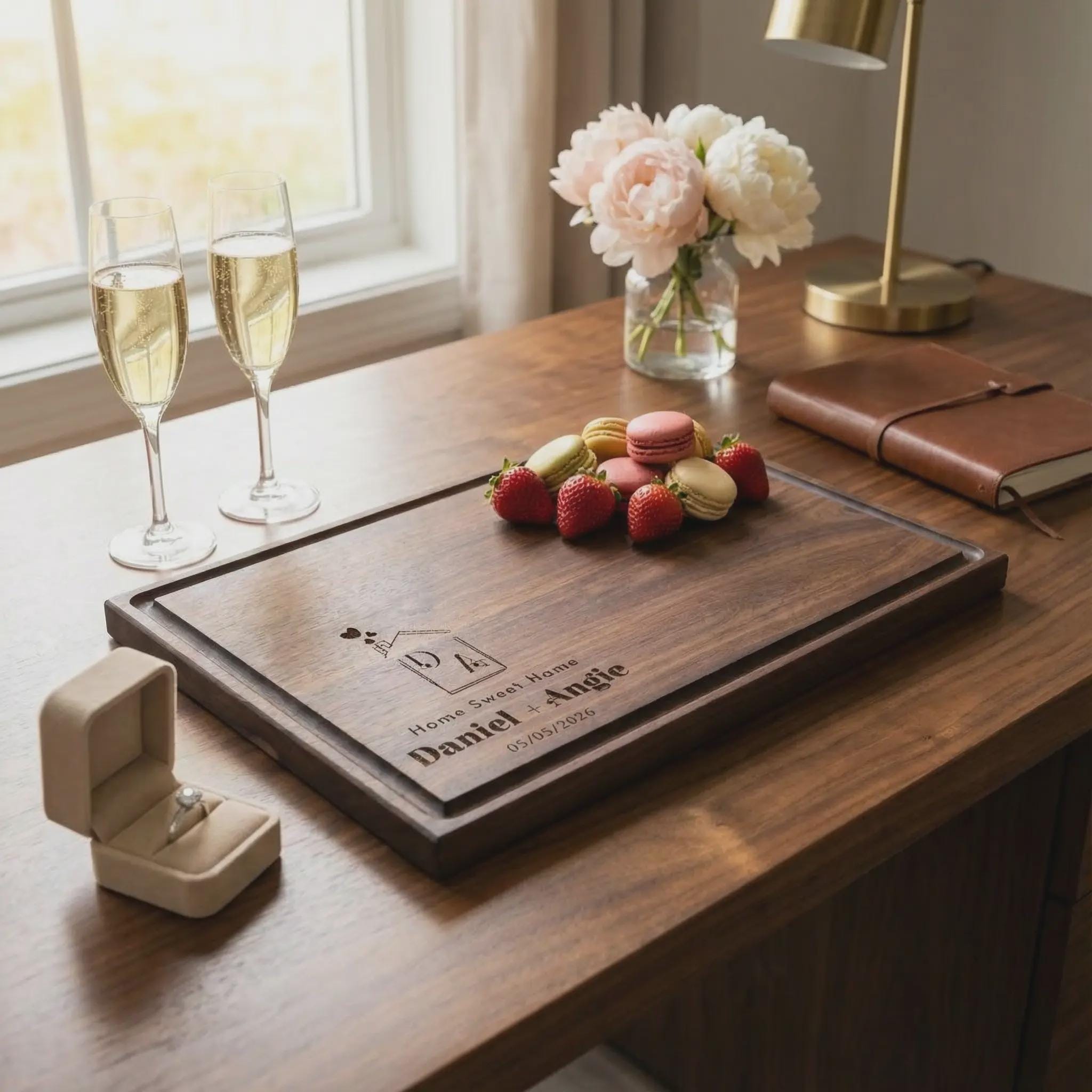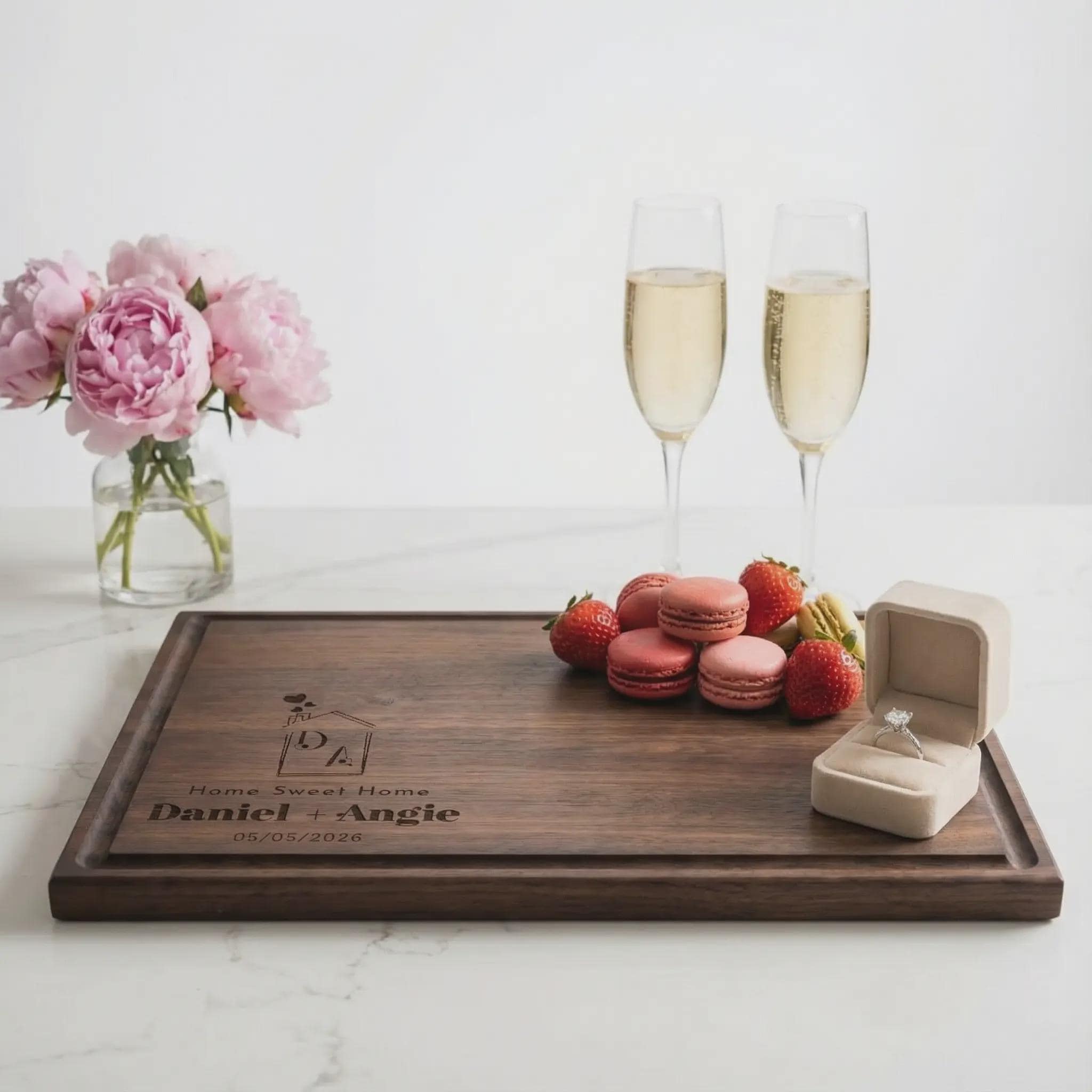 Housewarming Gift for Couple | Personalized Cutting Board & "Home Sweet Home" Wooden Platter