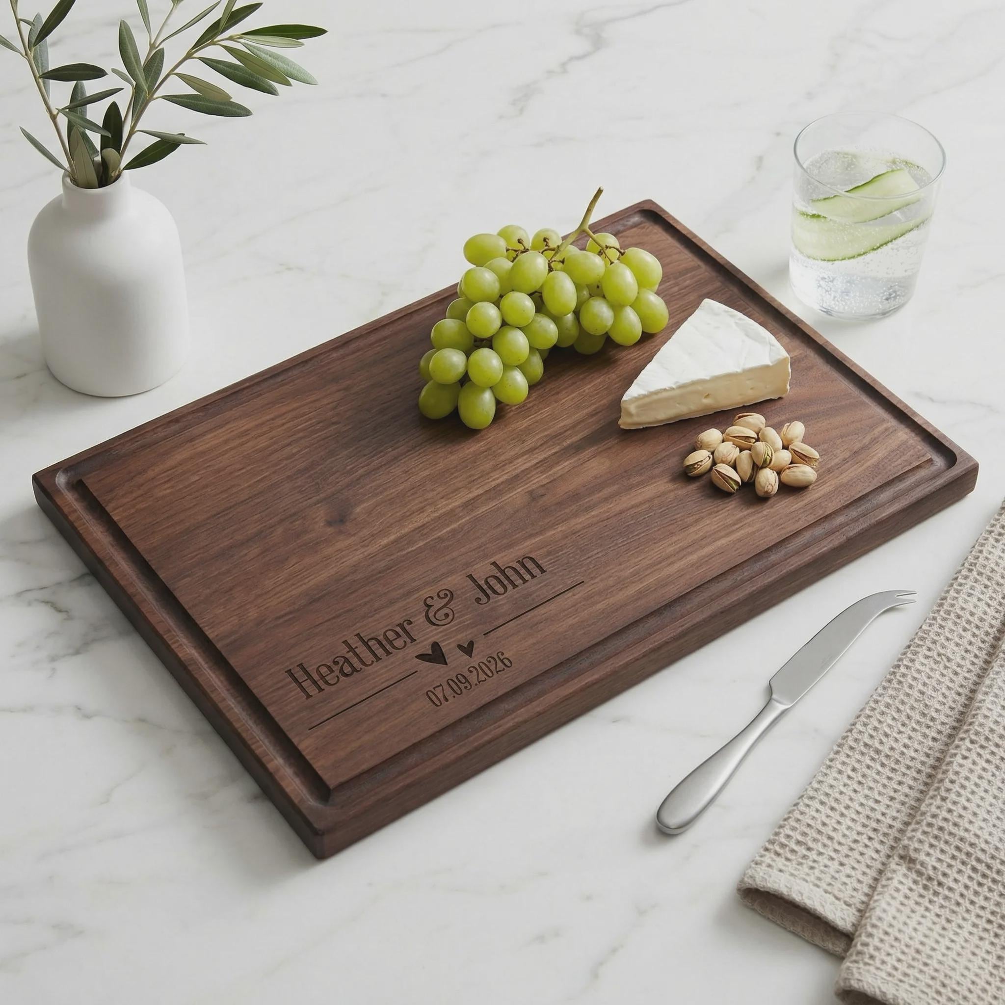 Celebrate love in its simplest, most elegant form with this premium walnut wood cutting board. Featuring a minimalist design with the couple’s first names, two delicate hearts, and a special date, this custom-engraved serving platter radiates timeless sophistication. Crafted with a deep juice groove for mess-free carving, it serves as both a functional kitchen staple and a stunning dining table centerpiece. It is the ideal choice for a modern engagement gift, a housewarming token, or a traditional 5th-anniversary keepsake.