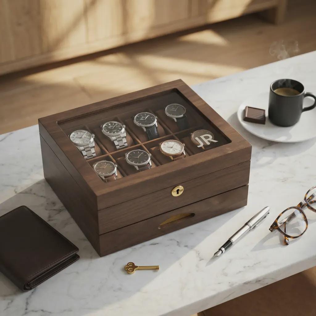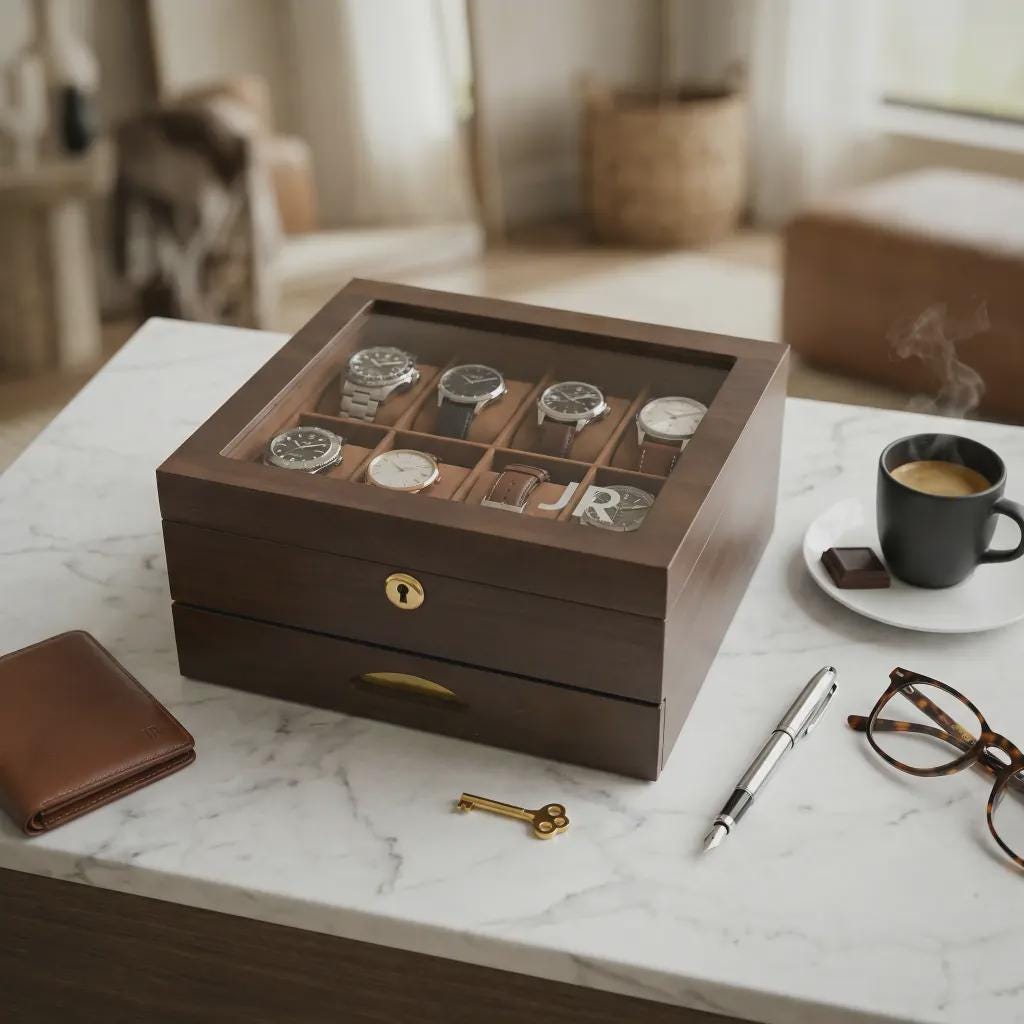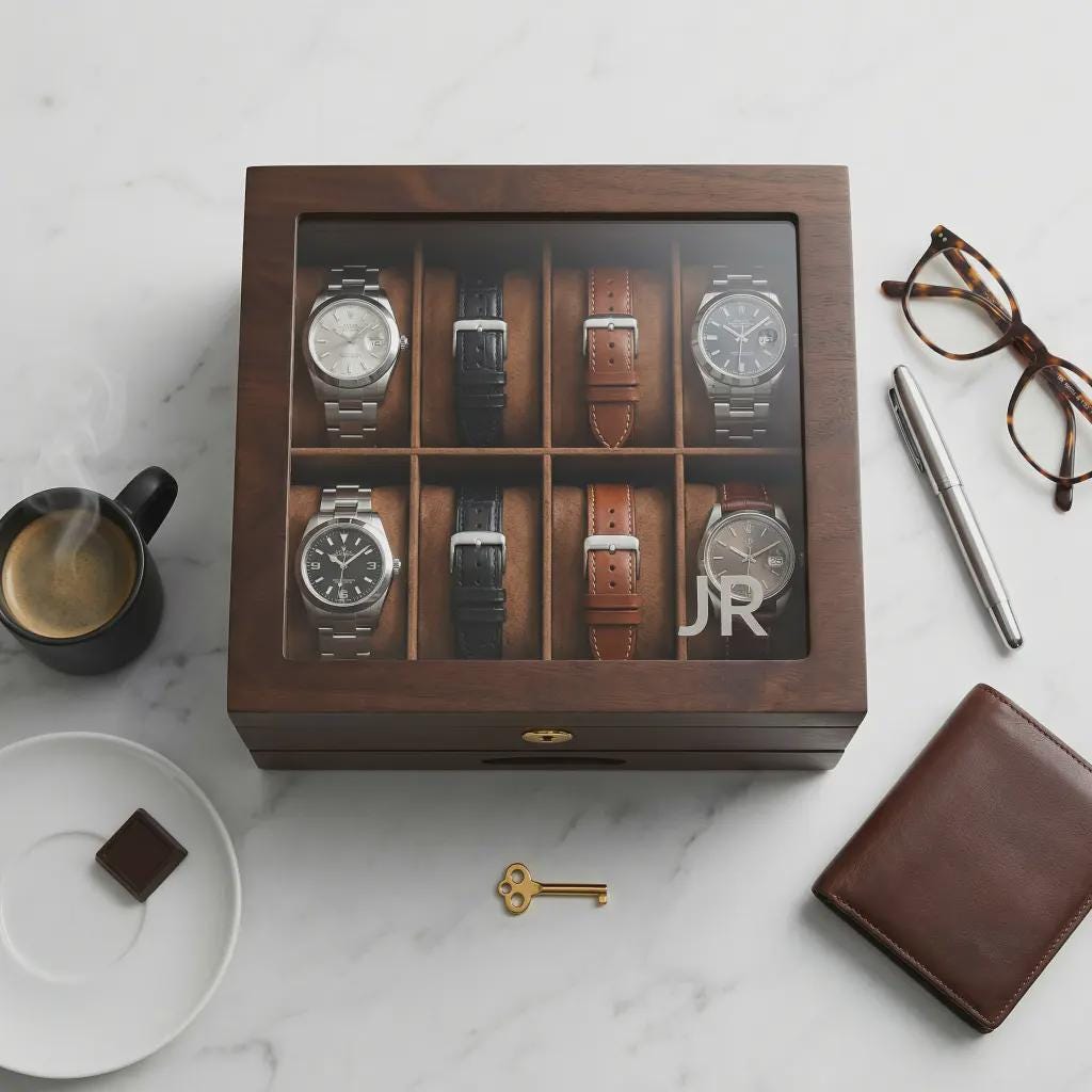 This personalized watch box blends luxury craftsmanship with everyday functionality. Thoughtfully designed for watch enthusiasts, it keeps timepieces protected, organized, and beautifully displayed while adding a sophisticated touch to any dresser or office.