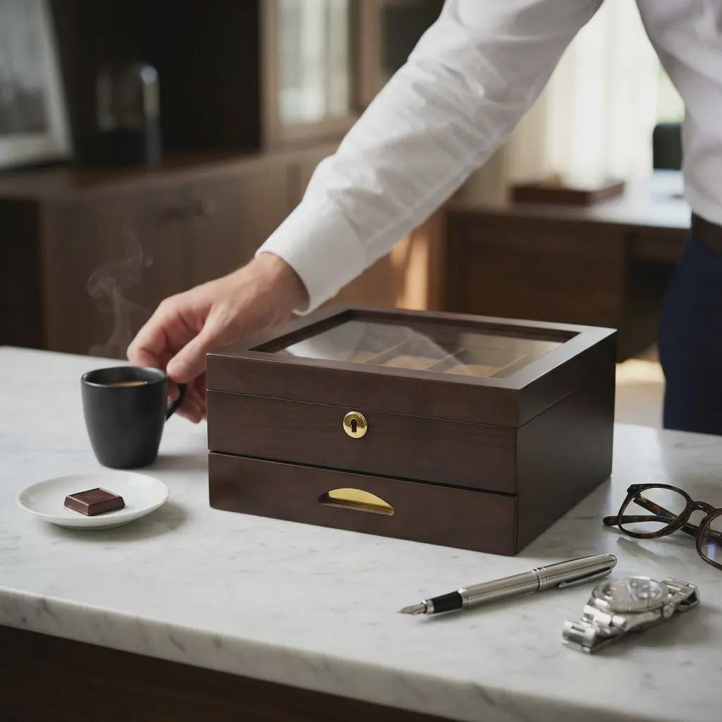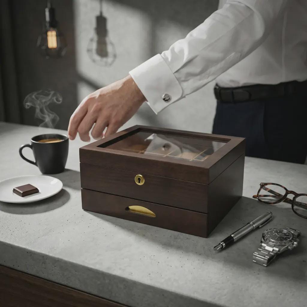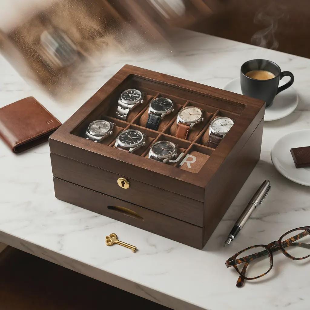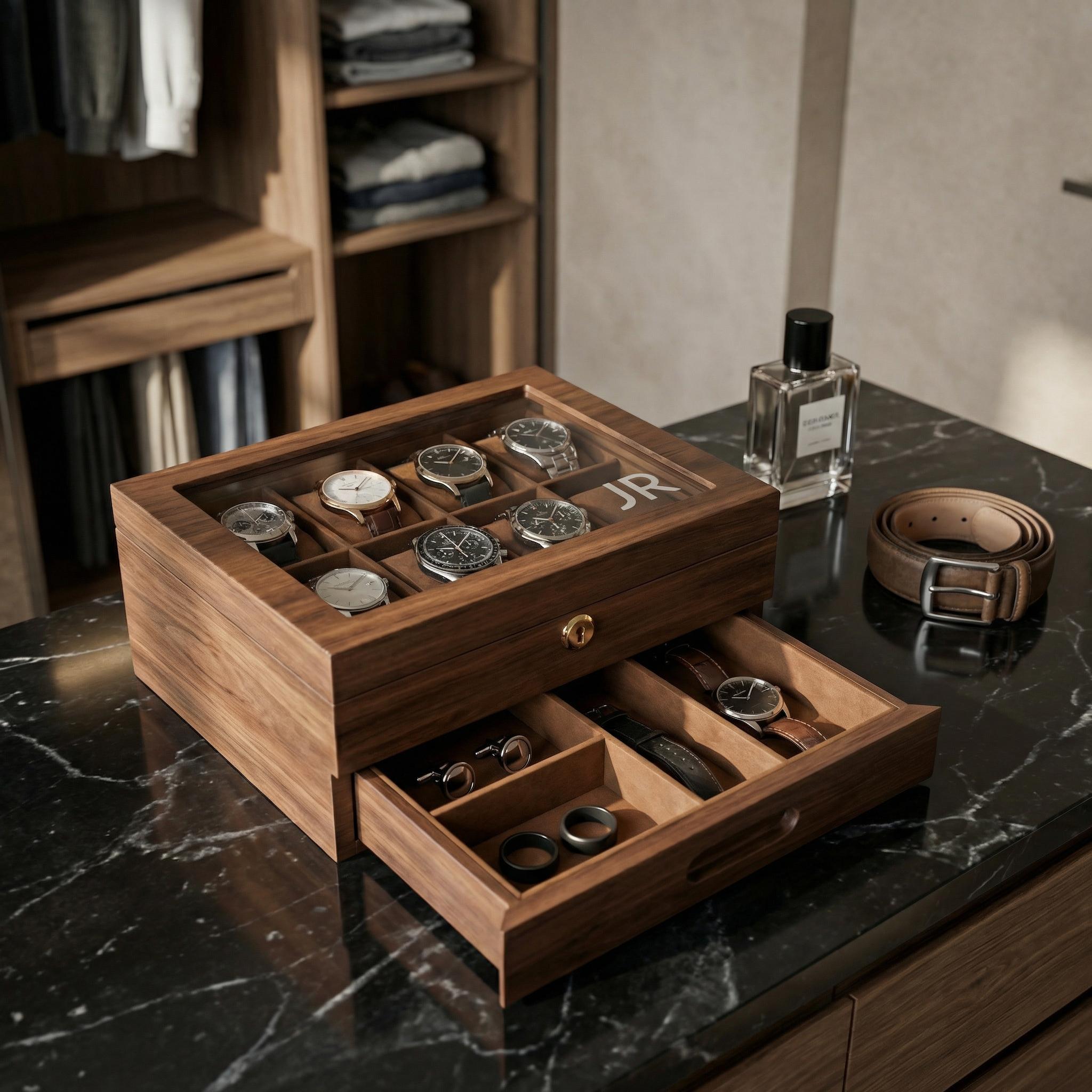 This personalized watch box blends luxury craftsmanship with everyday functionality. Thoughtfully designed for watch enthusiasts, it keeps timepieces protected, organized, and beautifully displayed while adding a sophisticated touch to any dresser or office.