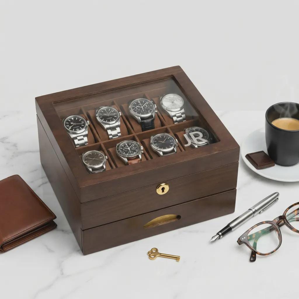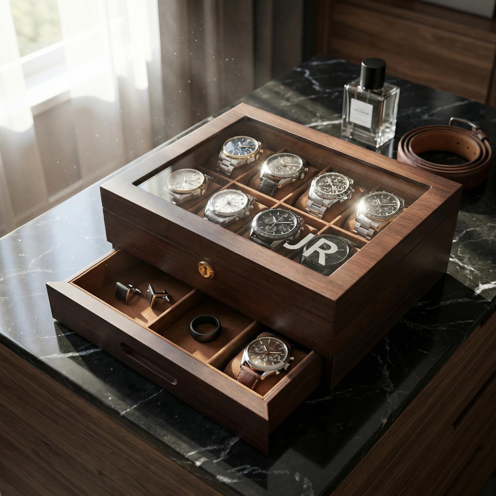 Store and display a watch collection in timeless style with this Custom Engraved Watch Box, crafted from solid wood with a rich walnut veneer and a personalized glass lid. Designed to hold up to 8 watches with velvet cushions, this elegant watch case also features a removable drawer with multiple compartments for jewelry, cufflinks, and accessories. Perfect for collectors and professionals alike, this personalized watch box makes a refined and practical gift for birthdays, anniversaries, Christmas, or any special occasion.