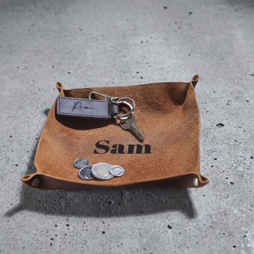 Constructed from premium, heavyweight leather and accented with durable antique brass hardware, our valet trays are built for the modern individual who values order and quality. The rich tan leather offers a beautiful high-contrast surface for deep black laser engraving, ensuring your personalization stays vivid and sharp for a lifetime. Whether you're coming home or setting up for the workday, this catchall is designed to be the foundation of your "Everyday Carry" routine.